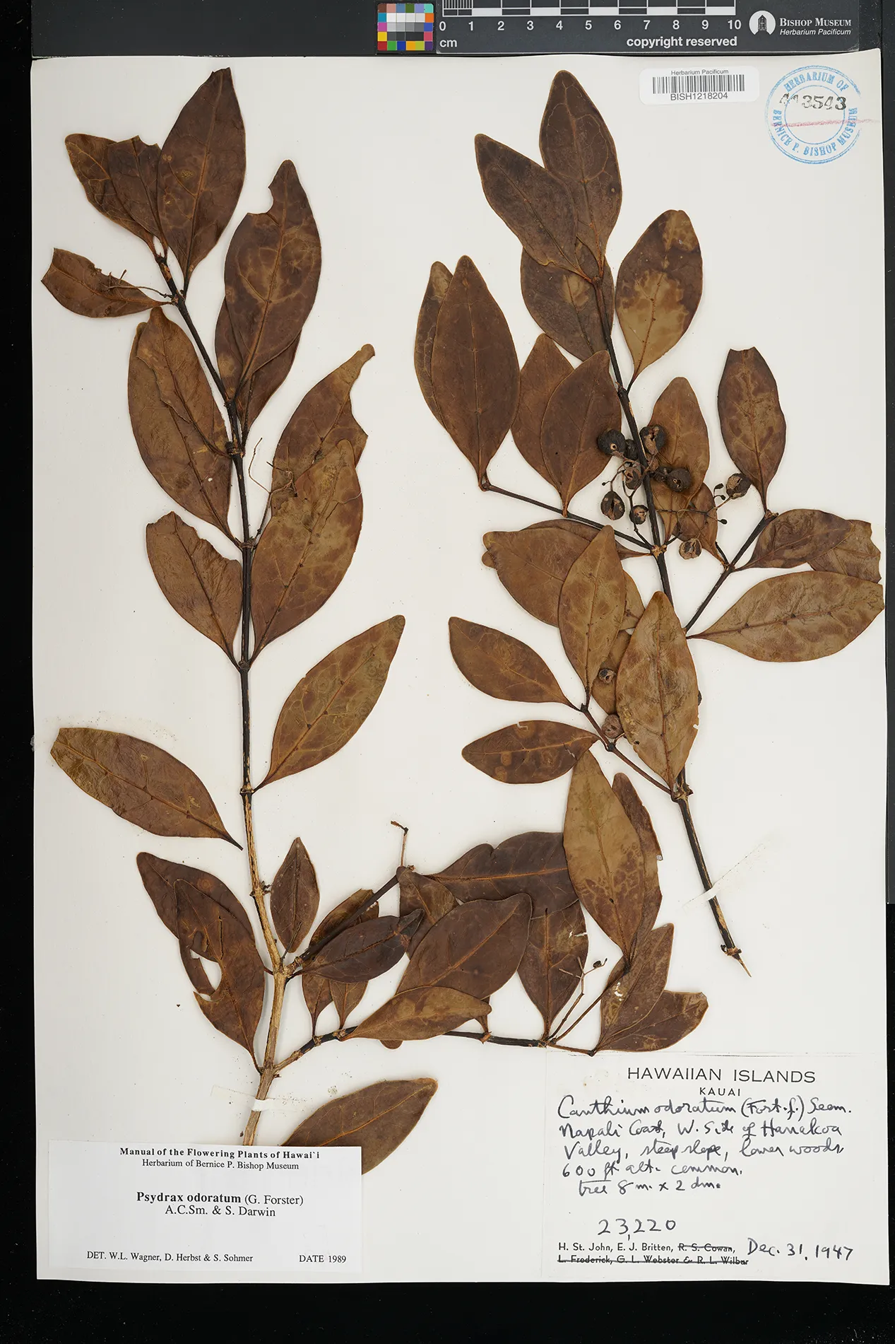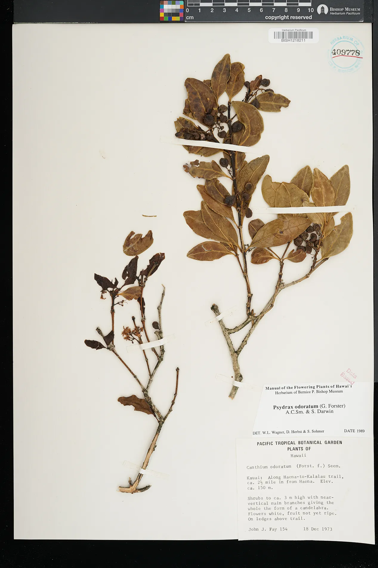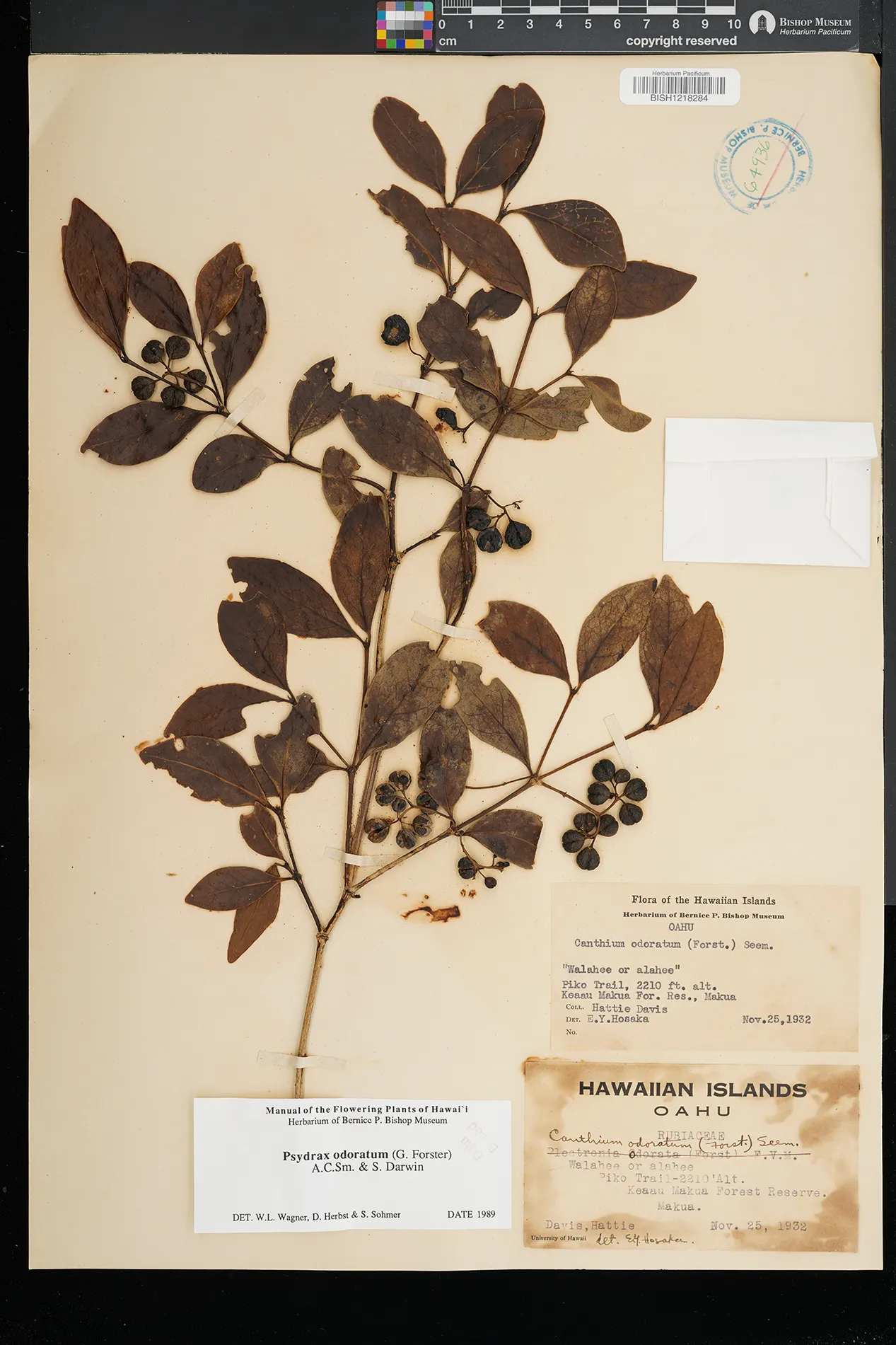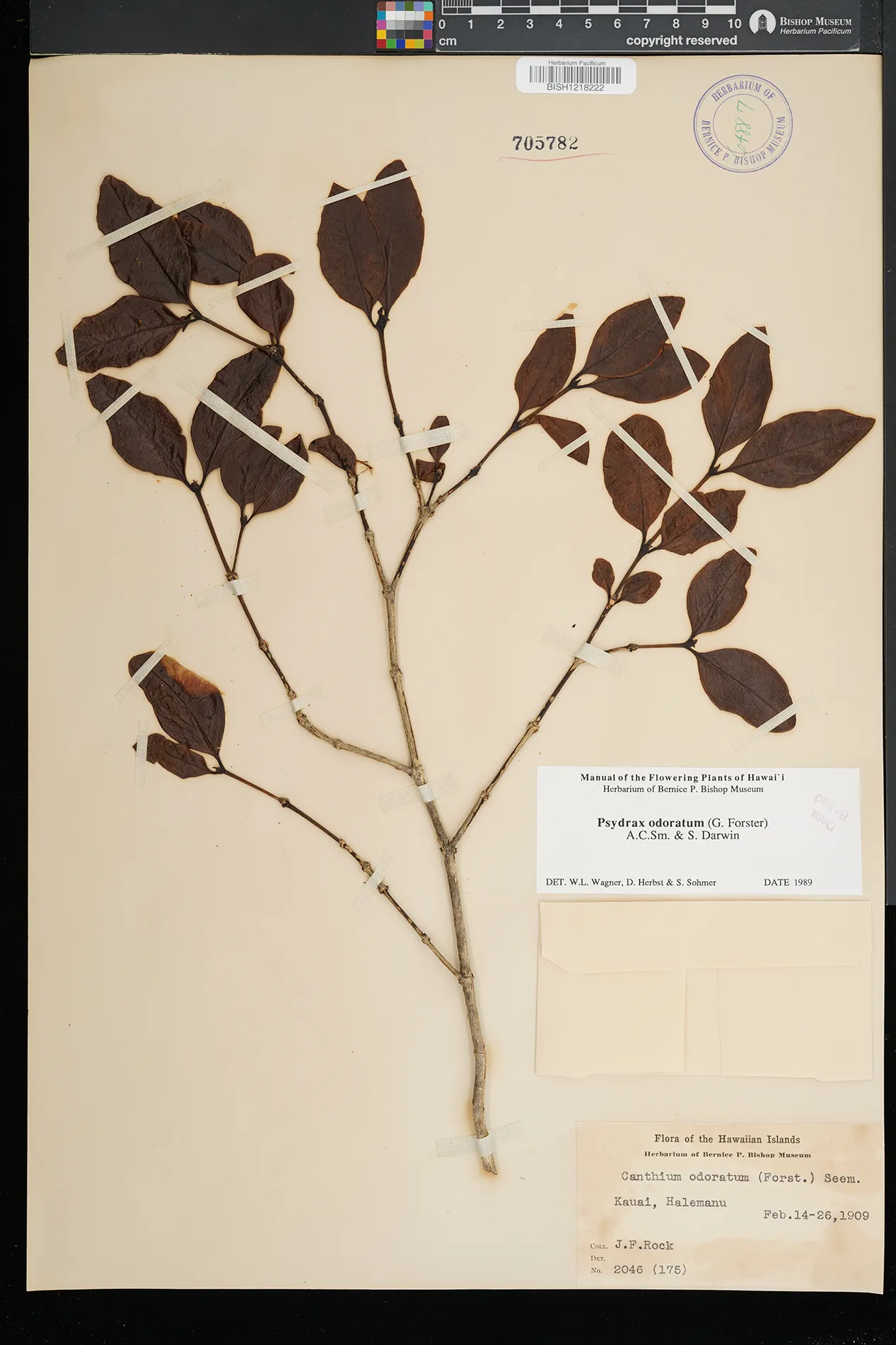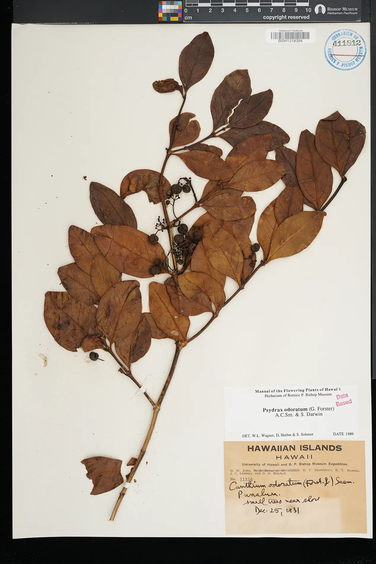 Wagner et al. 1990:1119 (K, O, Mo, L, M, H [as Canthium odoratum]); Smith 1988:230/Herbst & Wagner 1999:31 (COMBNOV, Syn. C. odoratum = P. odorata); Staples & Herbst 2005:484 (KEY), 499 (DESCR)