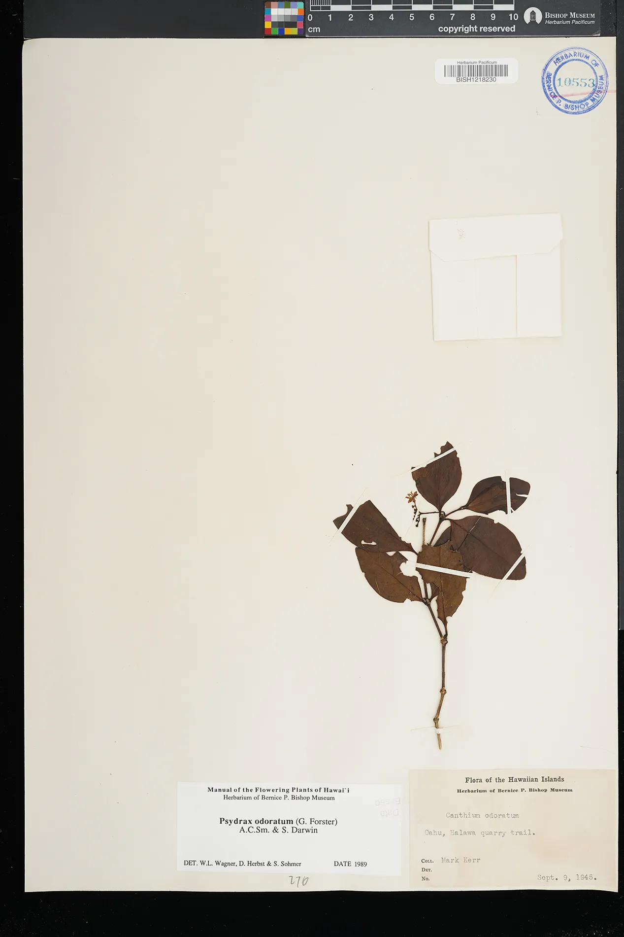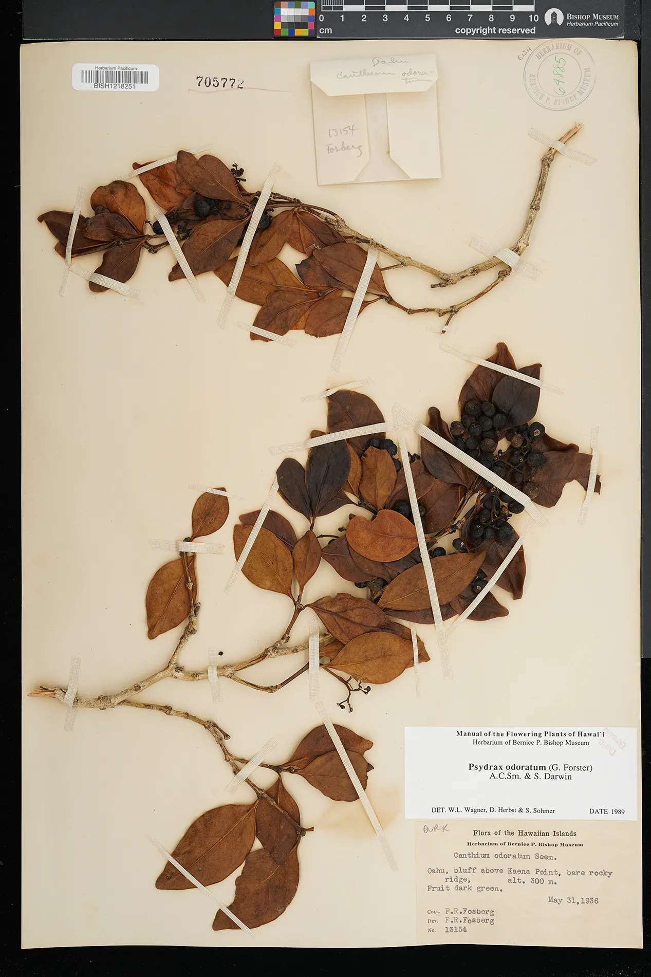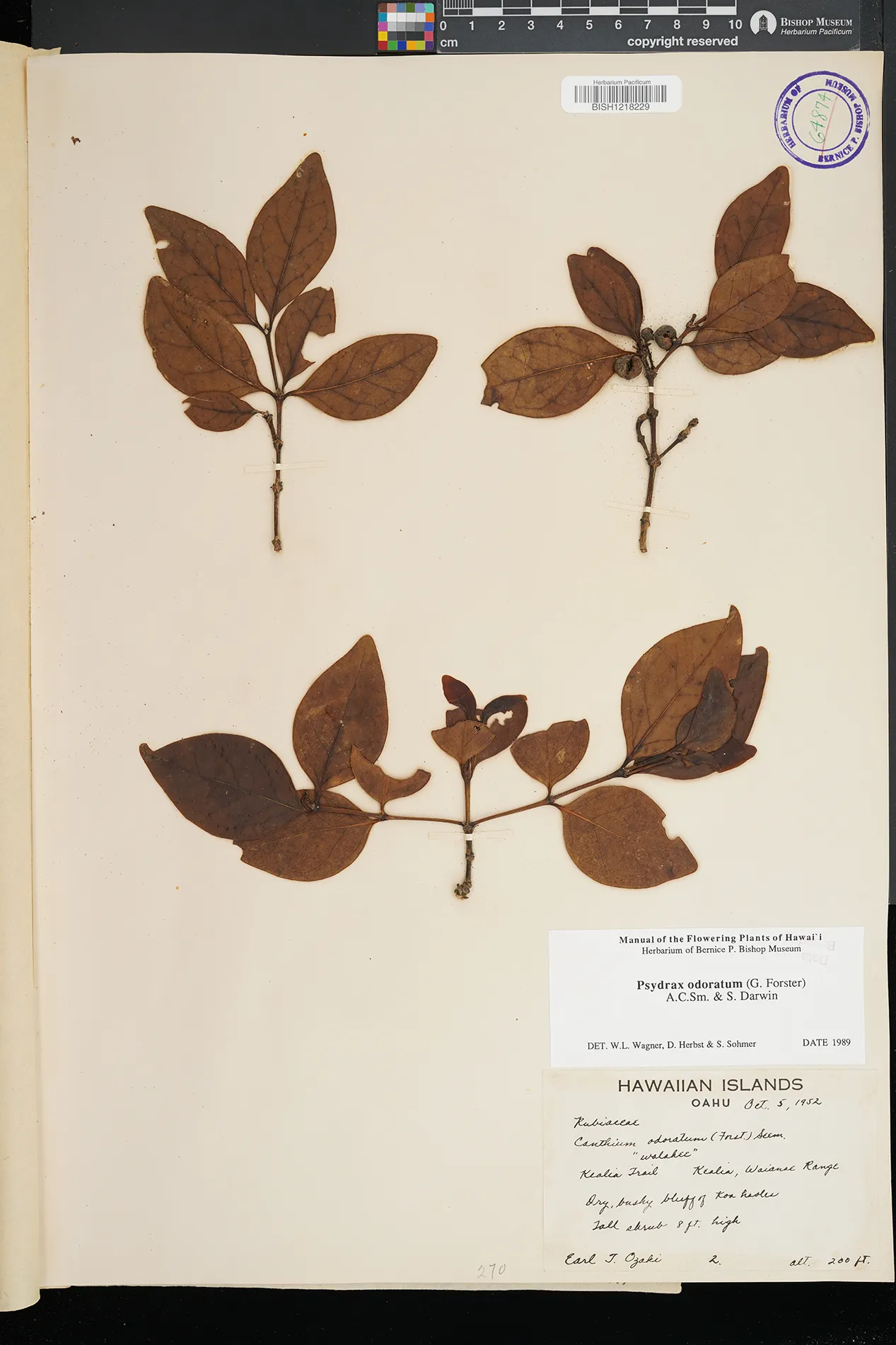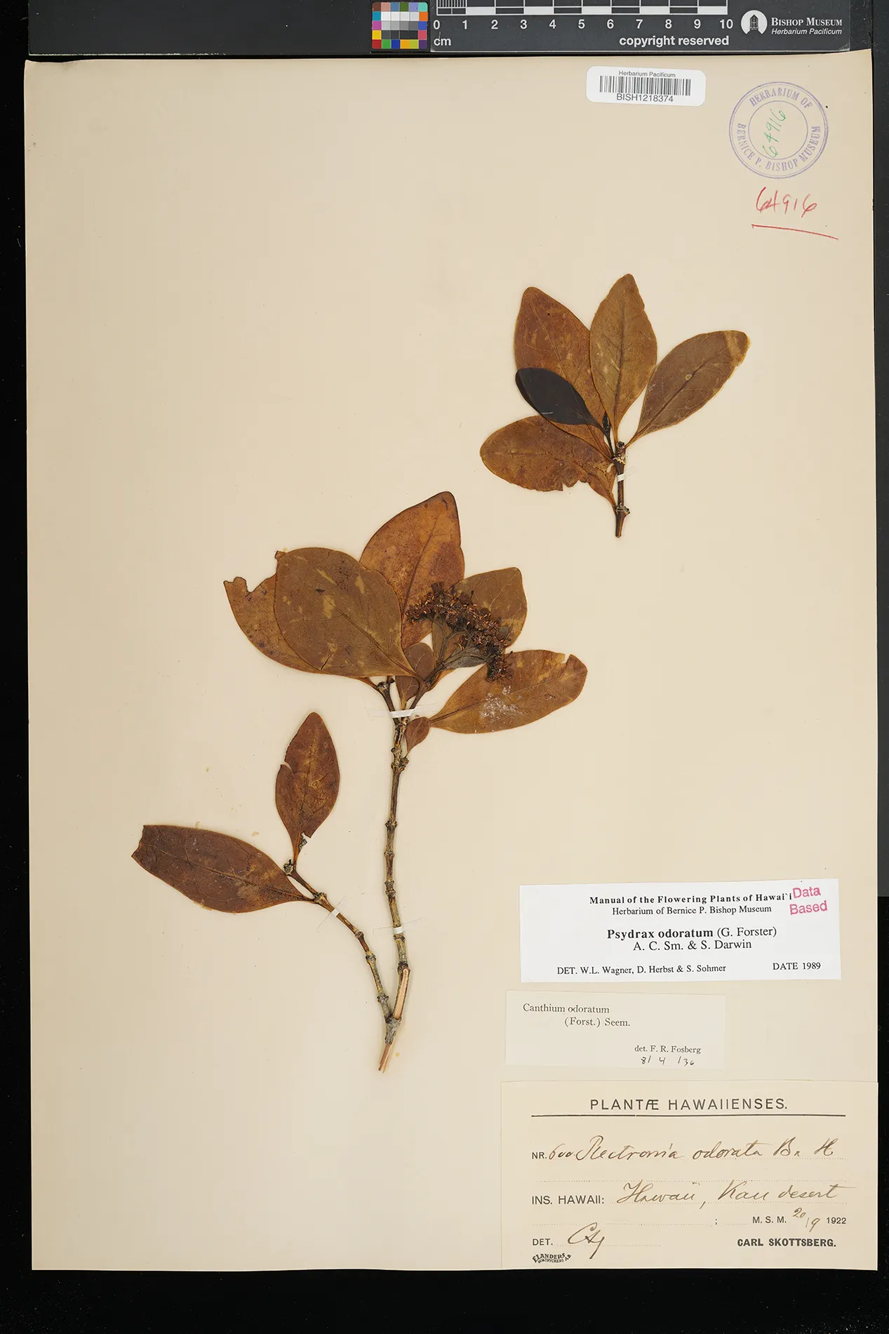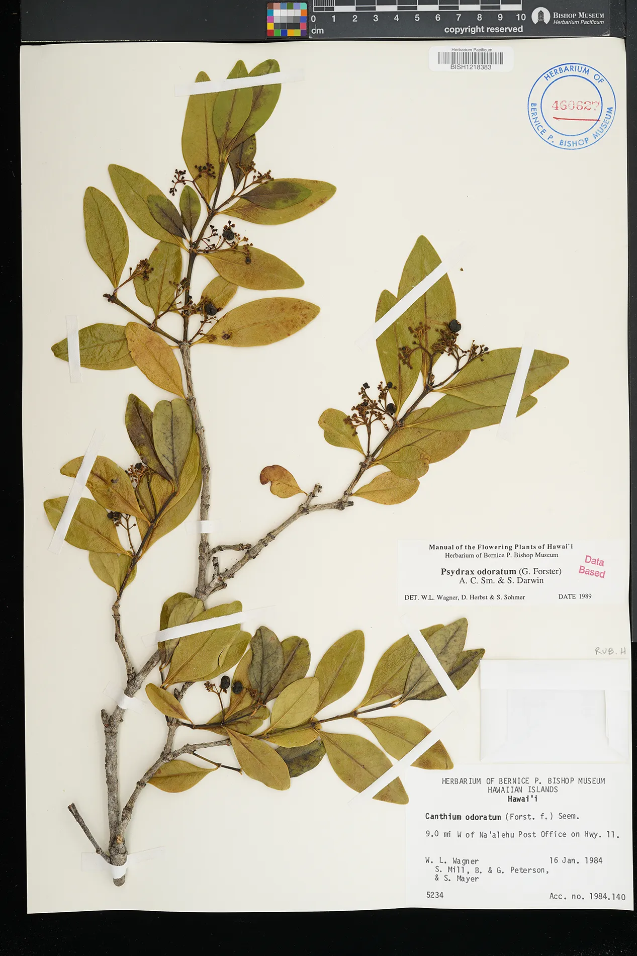 Wagner et al. 1990:1119 (K, O, Mo, L, M, H [as Canthium odoratum]); Smith 1988:230/Herbst & Wagner 1999:31 (COMBNOV, Syn. C. odoratum = P. odorata); Staples & Herbst 2005:484 (KEY), 499 (DESCR)