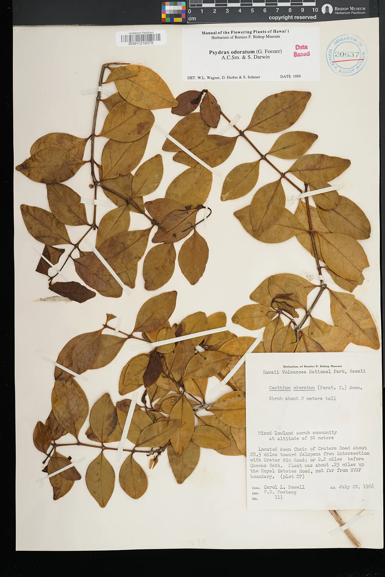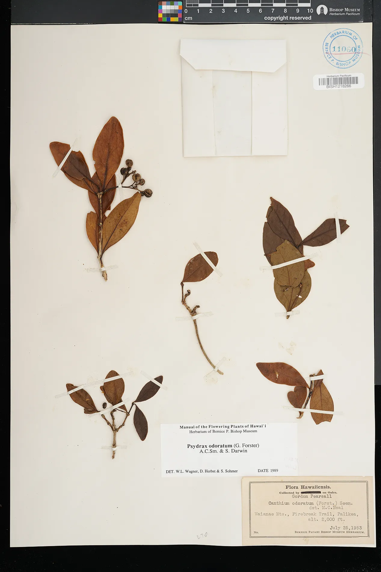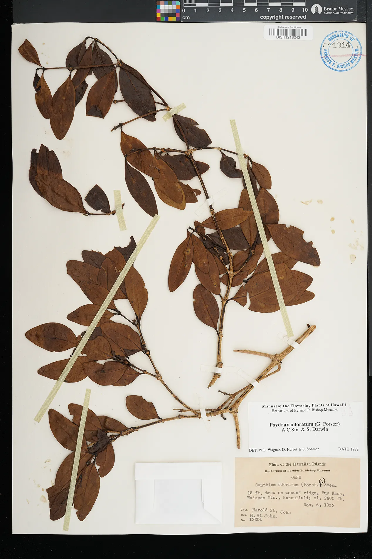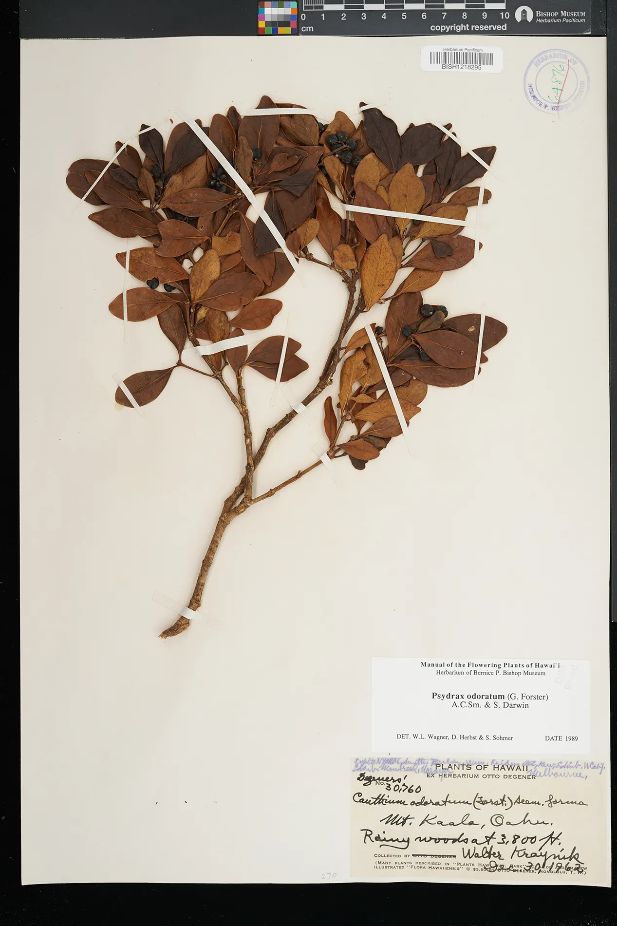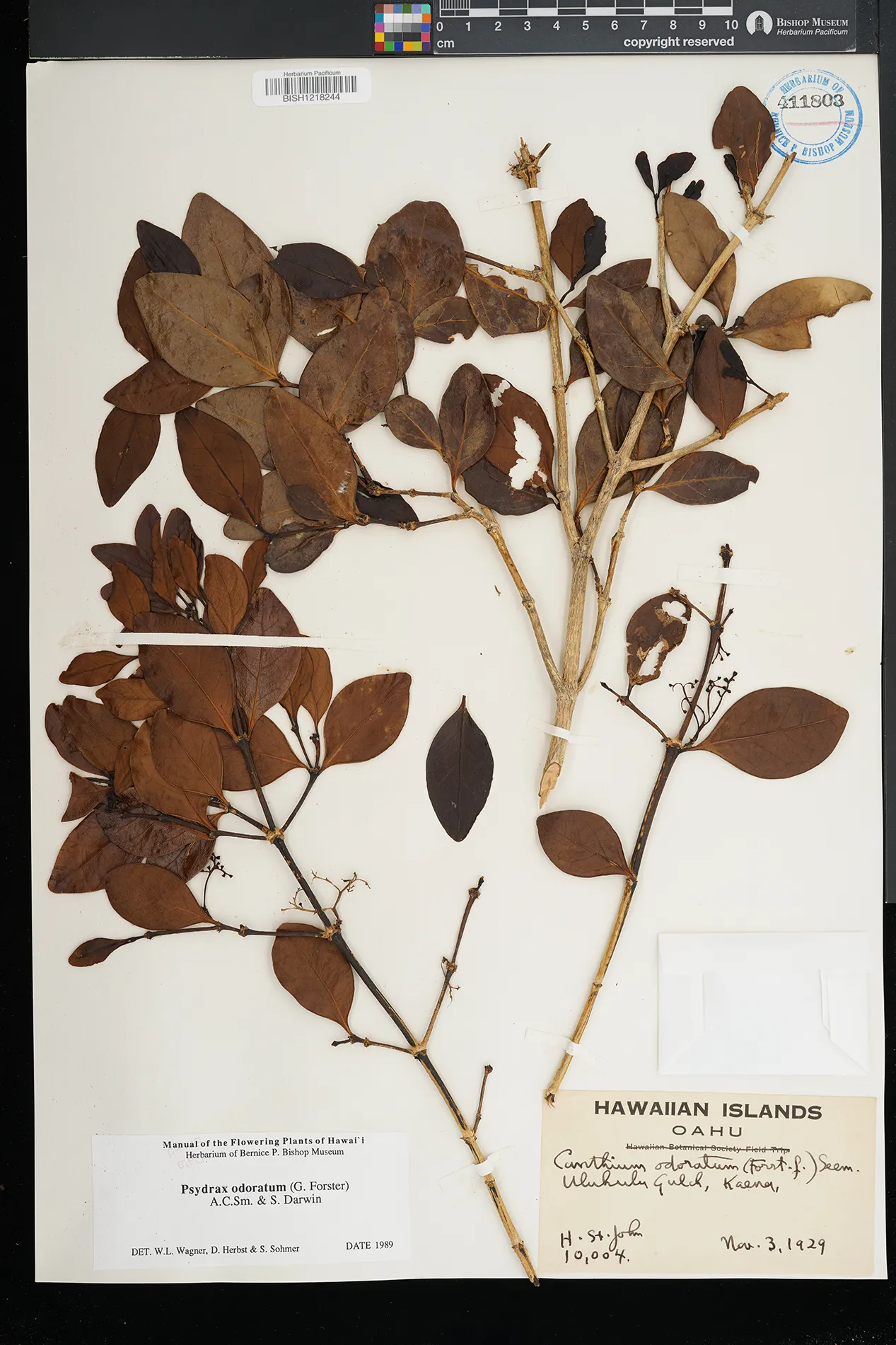 Wagner et al. 1990:1119 (K, O, Mo, L, M, H [as Canthium odoratum]); Smith 1988:230/Herbst & Wagner 1999:31 (COMBNOV, Syn. C. odoratum = P. odorata); Staples & Herbst 2005:484 (KEY), 499 (DESCR)
