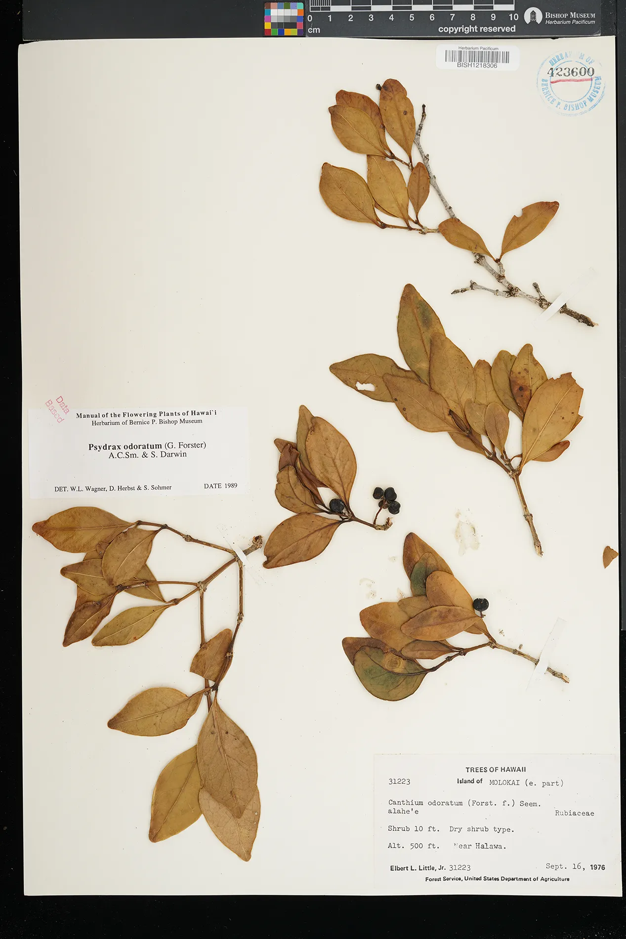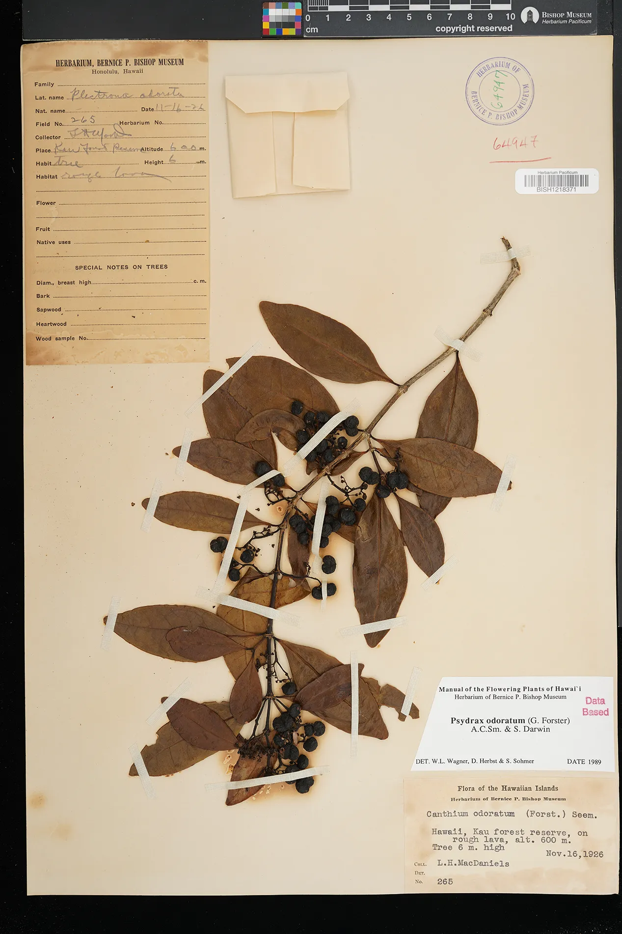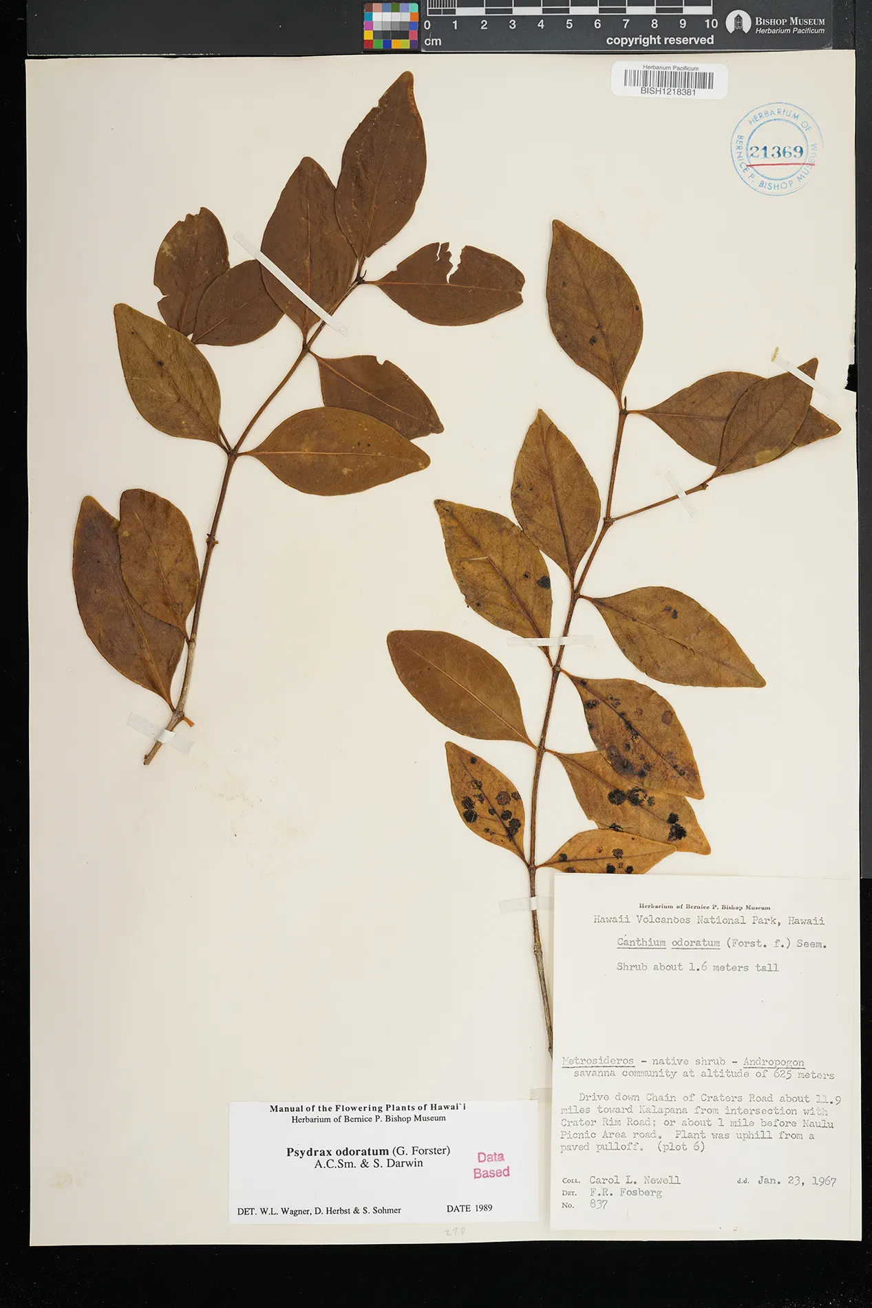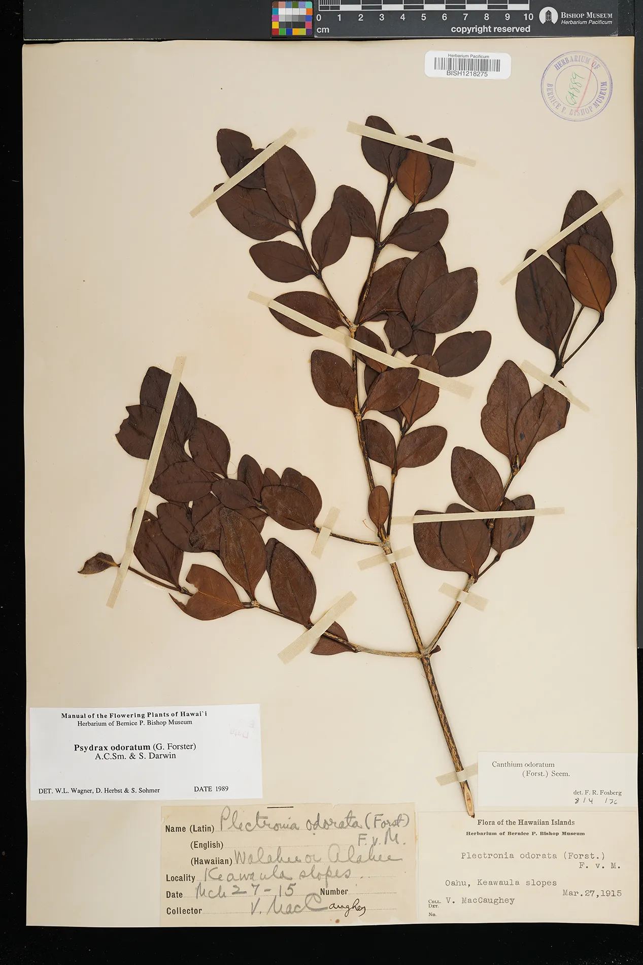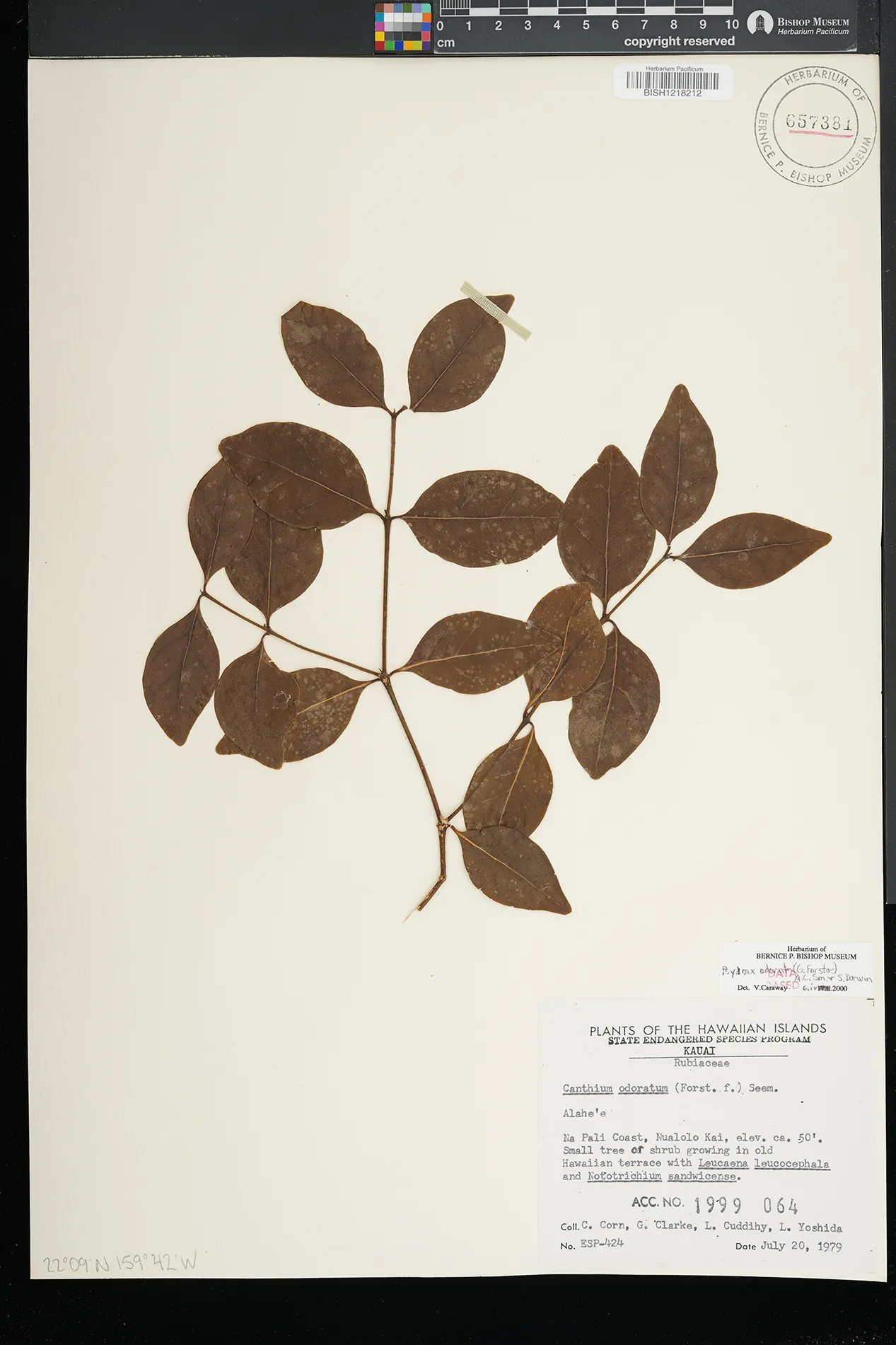 Wagner et al. 1990:1119 (K, O, Mo, L, M, H [as Canthium odoratum]); Smith 1988:230/Herbst & Wagner 1999:31 (COMBNOV, Syn. C. odoratum = P. odorata); Staples & Herbst 2005:484 (KEY), 499 (DESCR)