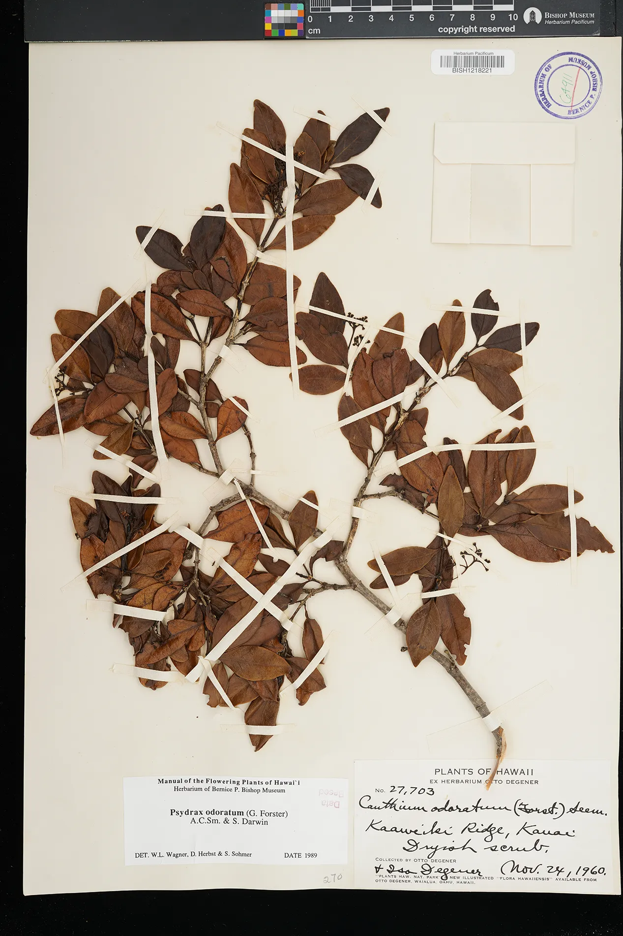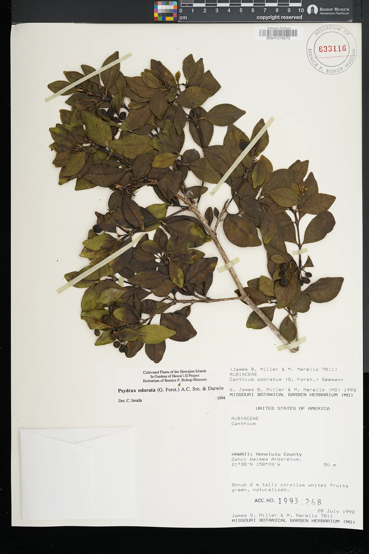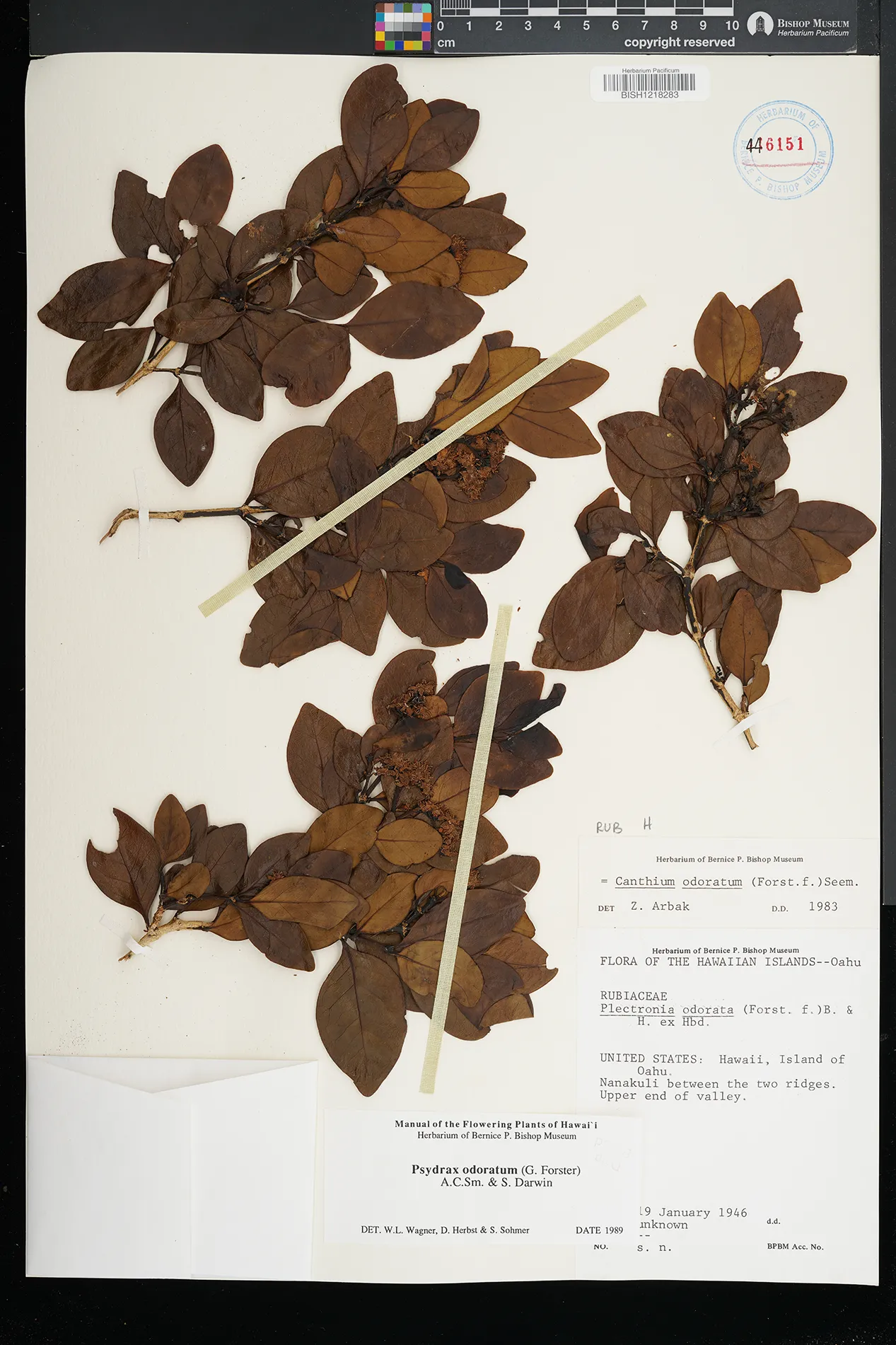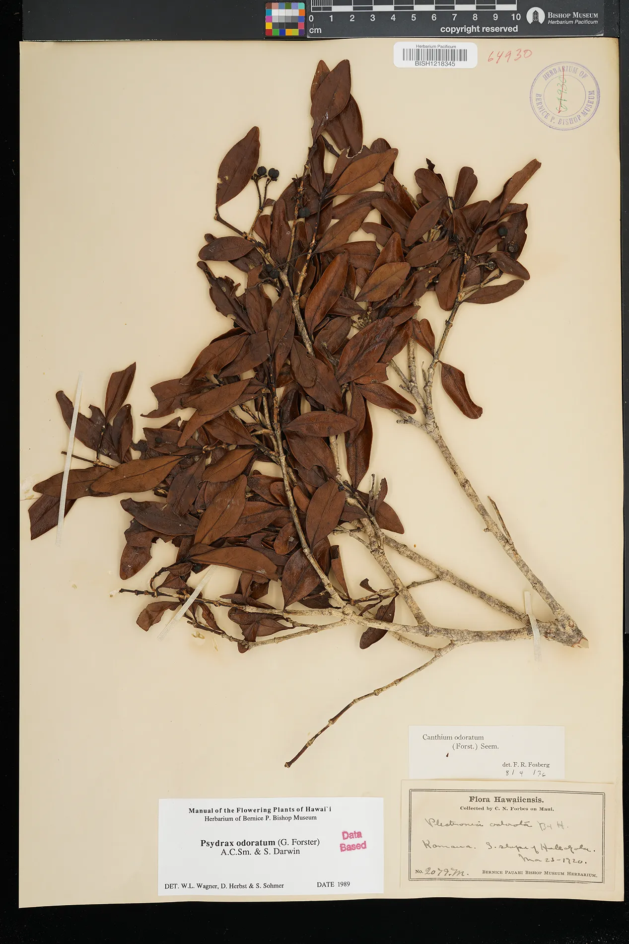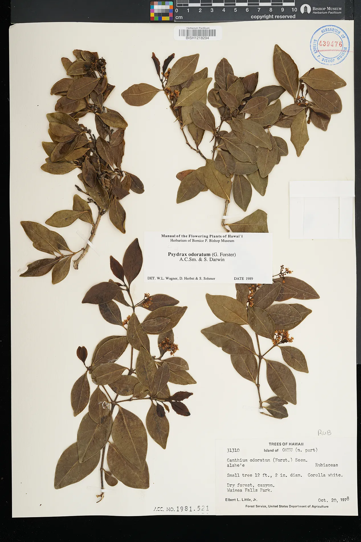 Wagner et al. 1990:1119 (K, O, Mo, L, M, H [as Canthium odoratum]); Smith 1988:230/Herbst & Wagner 1999:31 (COMBNOV, Syn. C. odoratum = P. odorata); Staples & Herbst 2005:484 (KEY), 499 (DESCR)