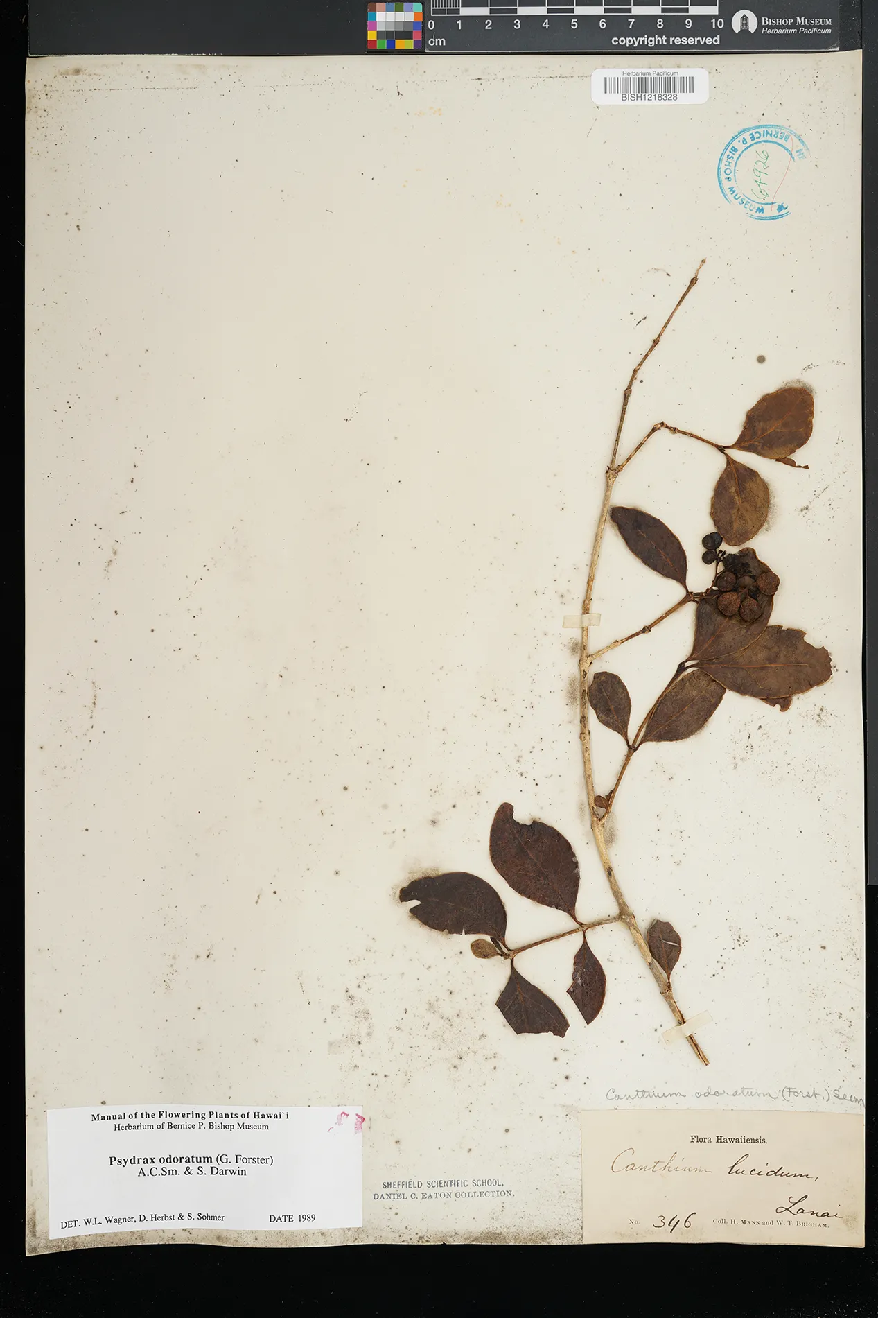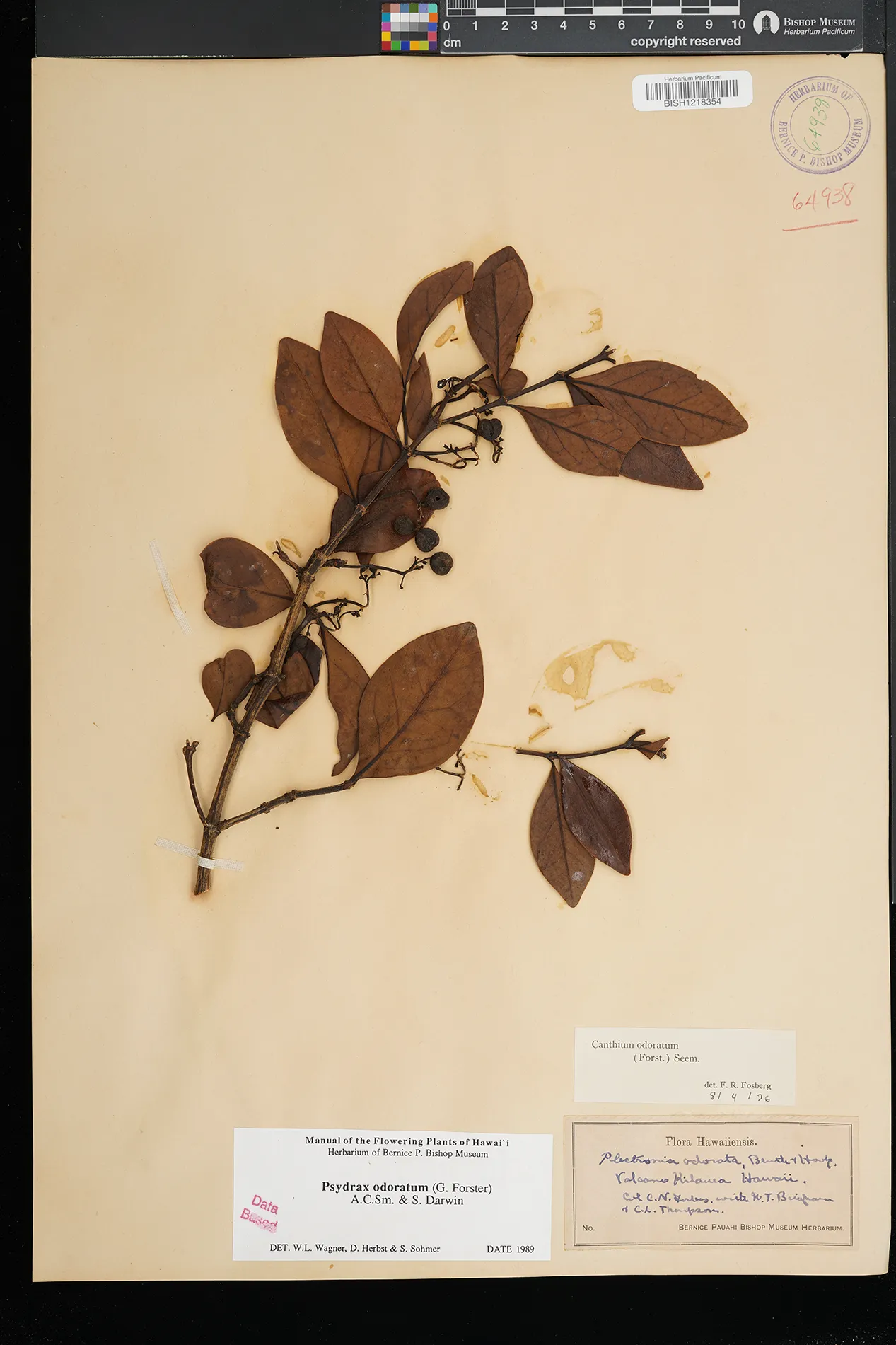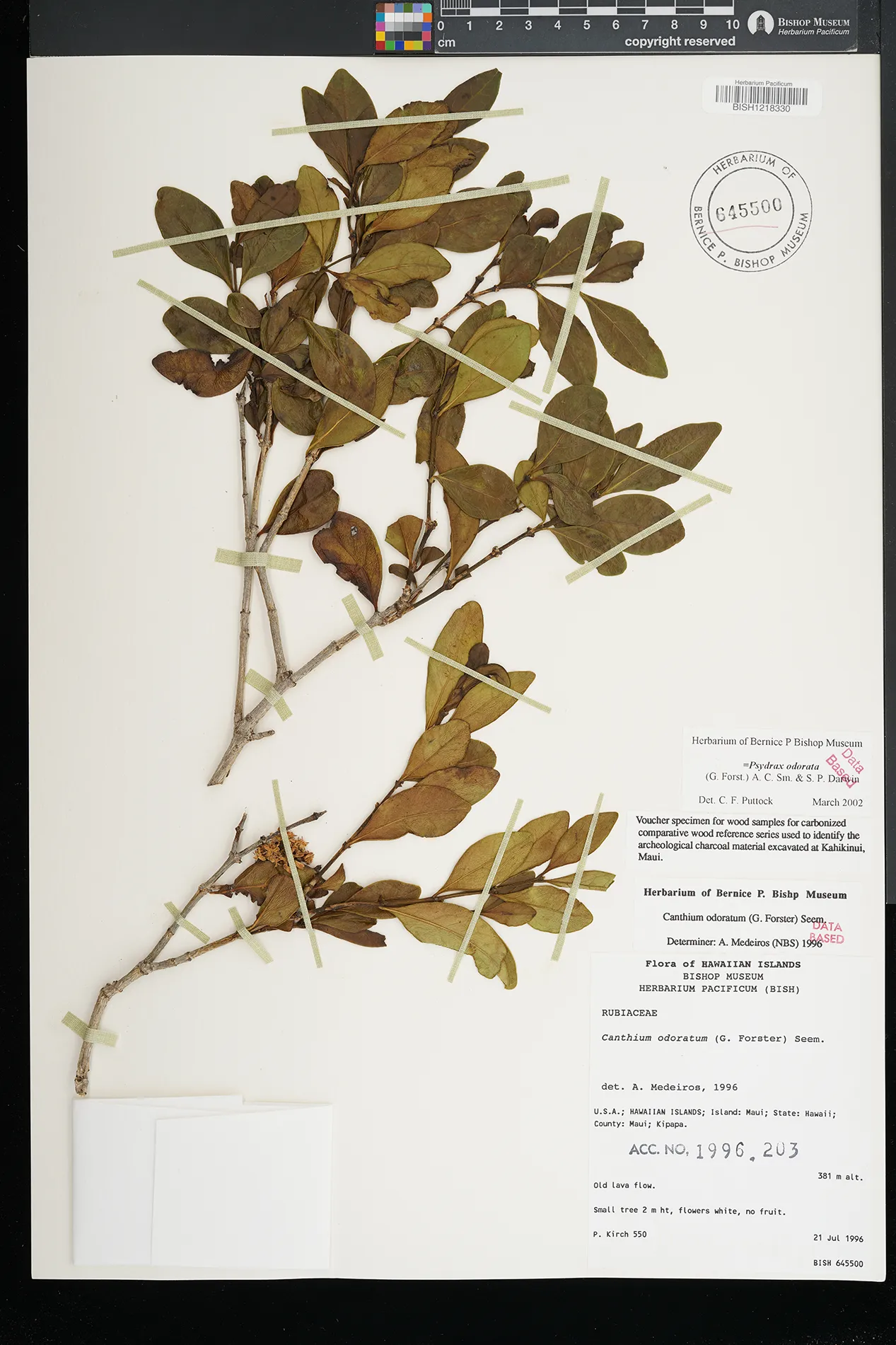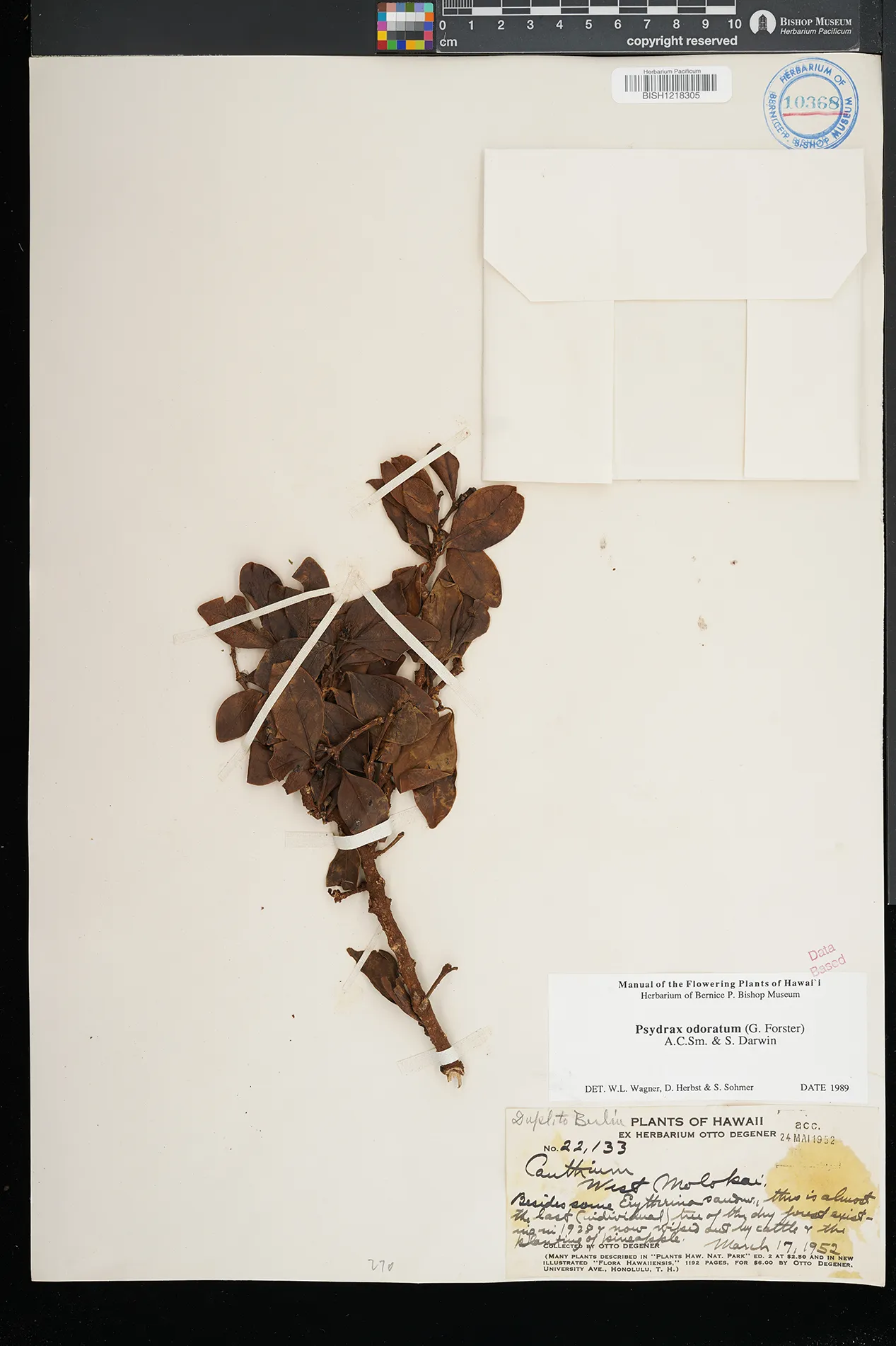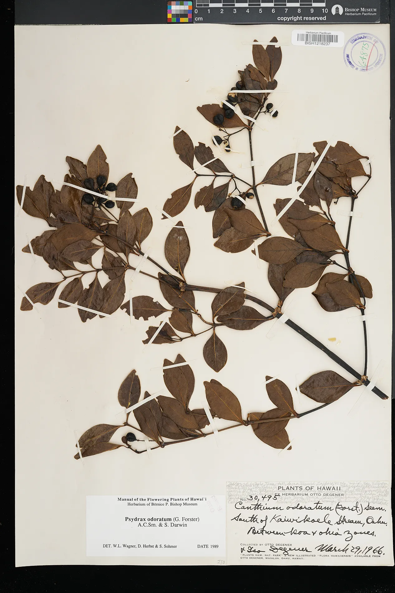 Wagner et al. 1990:1119 (K, O, Mo, L, M, H [as Canthium odoratum]); Smith 1988:230/Herbst & Wagner 1999:31 (COMBNOV, Syn. C. odoratum = P. odorata); Staples & Herbst 2005:484 (KEY), 499 (DESCR)