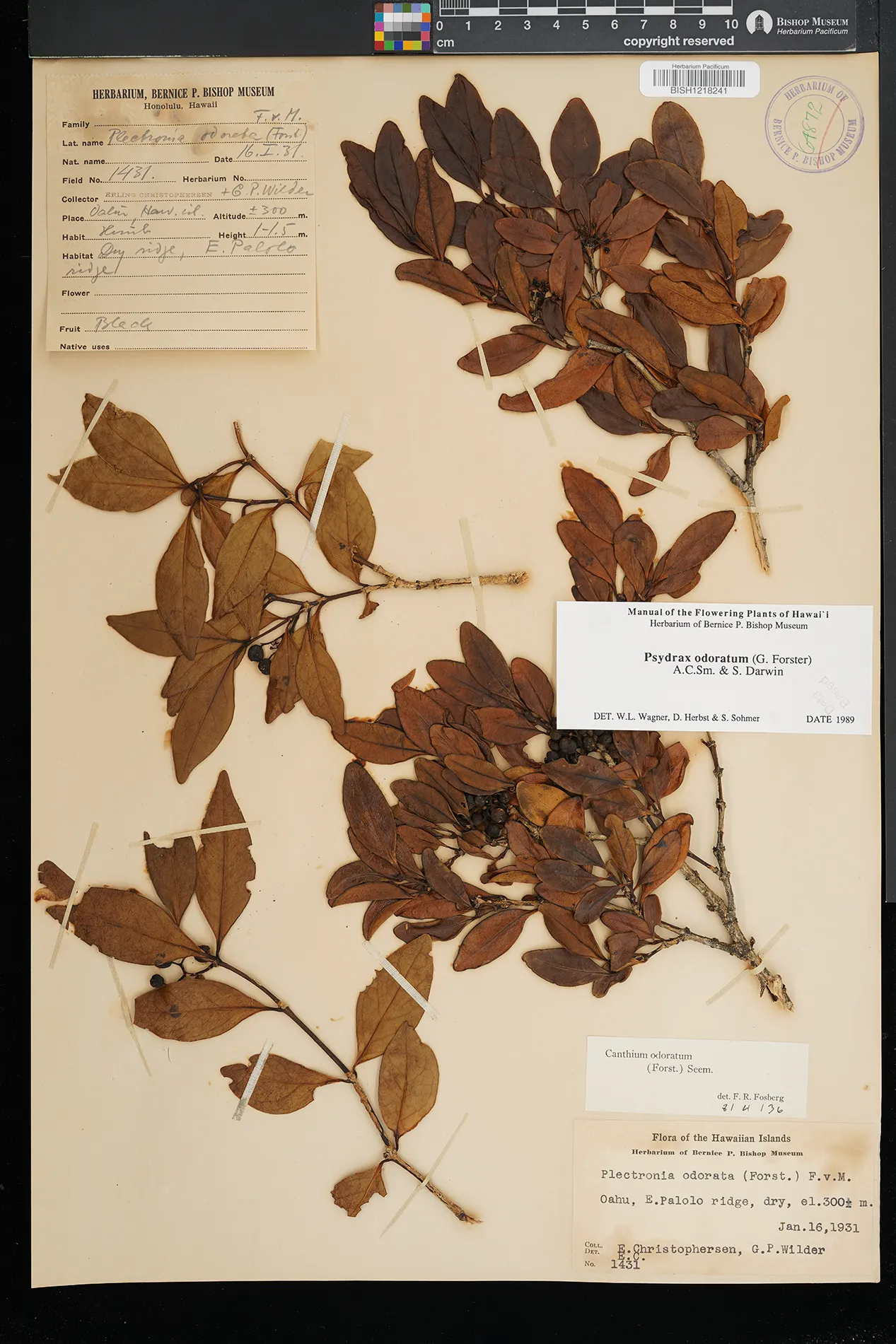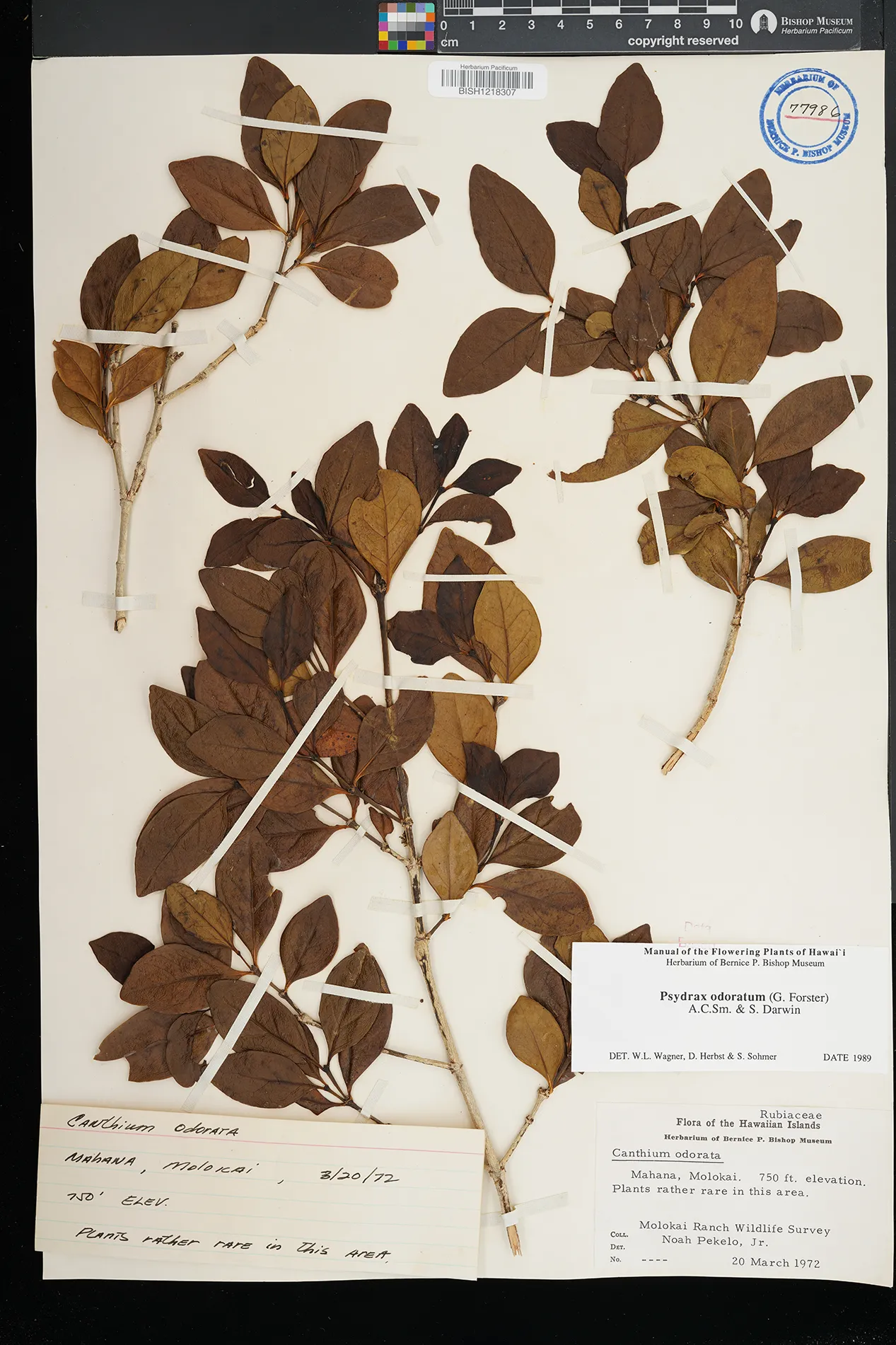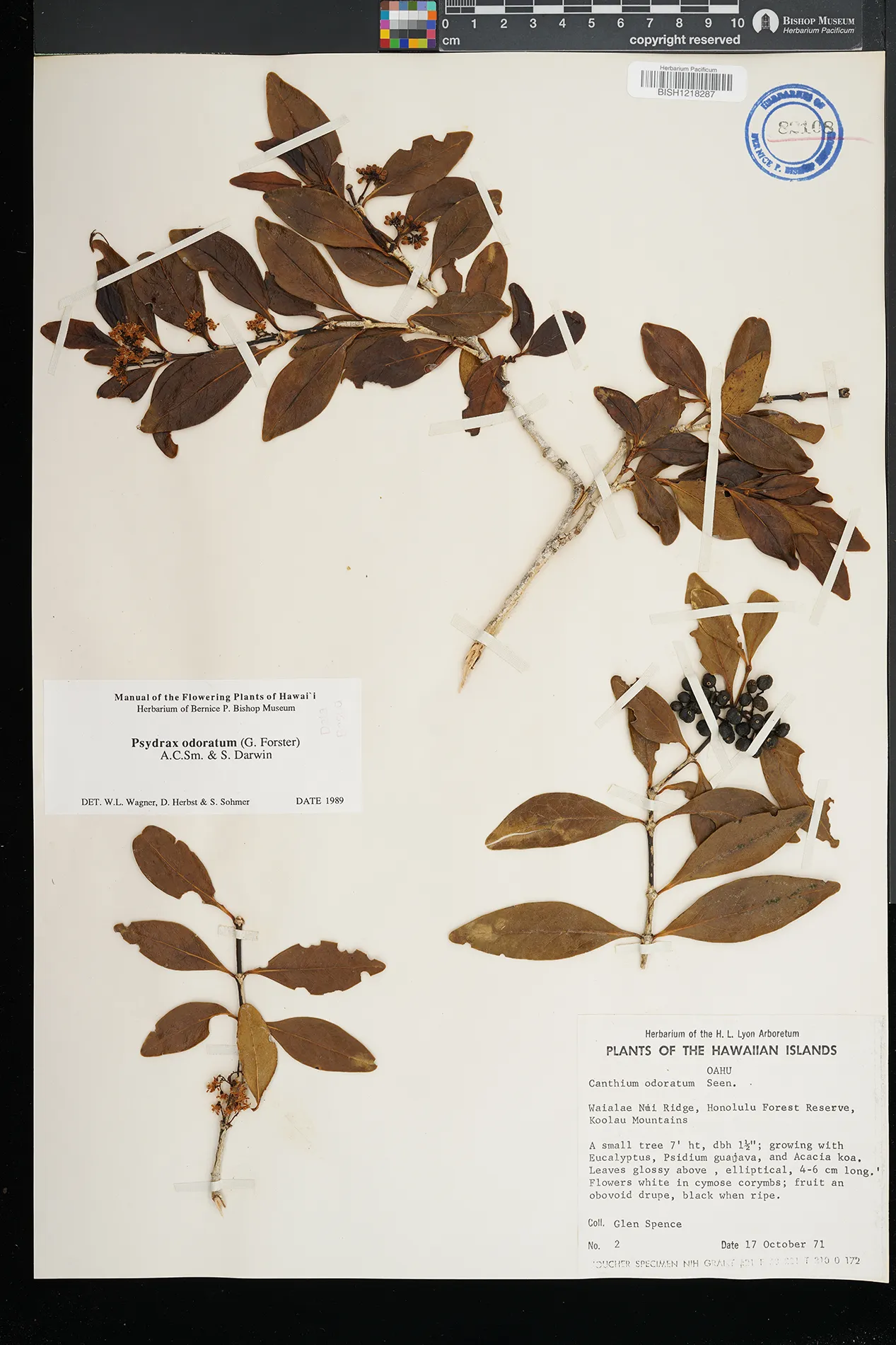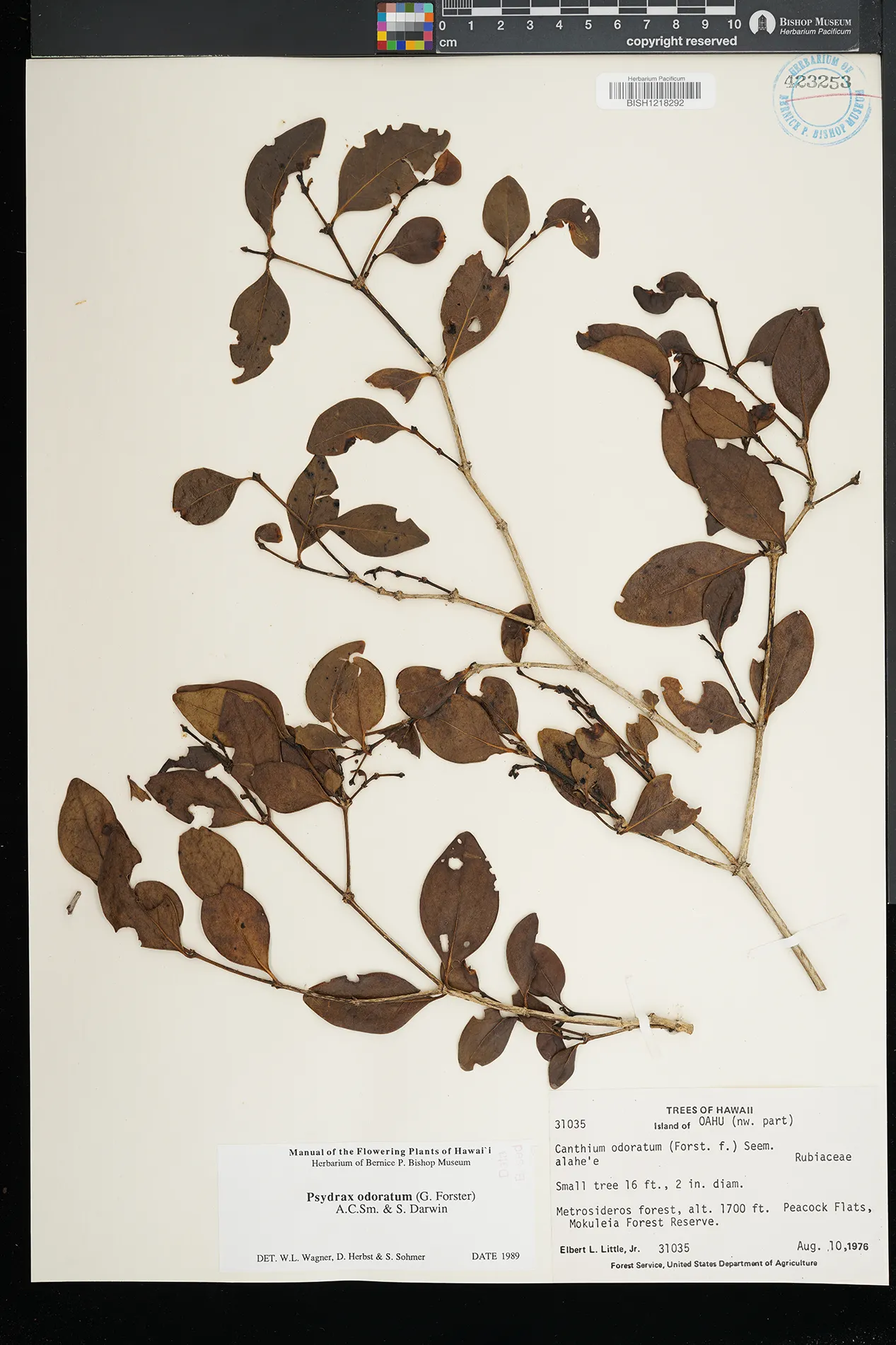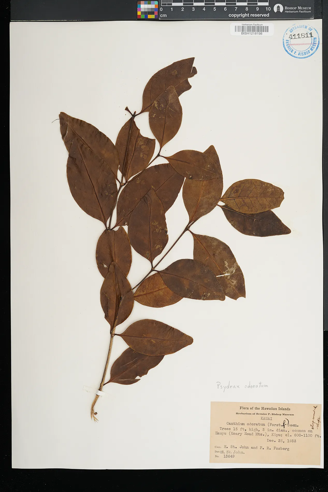 Wagner et al. 1990:1119 (K, O, Mo, L, M, H [as Canthium odoratum]); Smith 1988:230/Herbst & Wagner 1999:31 (COMBNOV, Syn. C. odoratum = P. odorata); Staples & Herbst 2005:484 (KEY), 499 (DESCR)