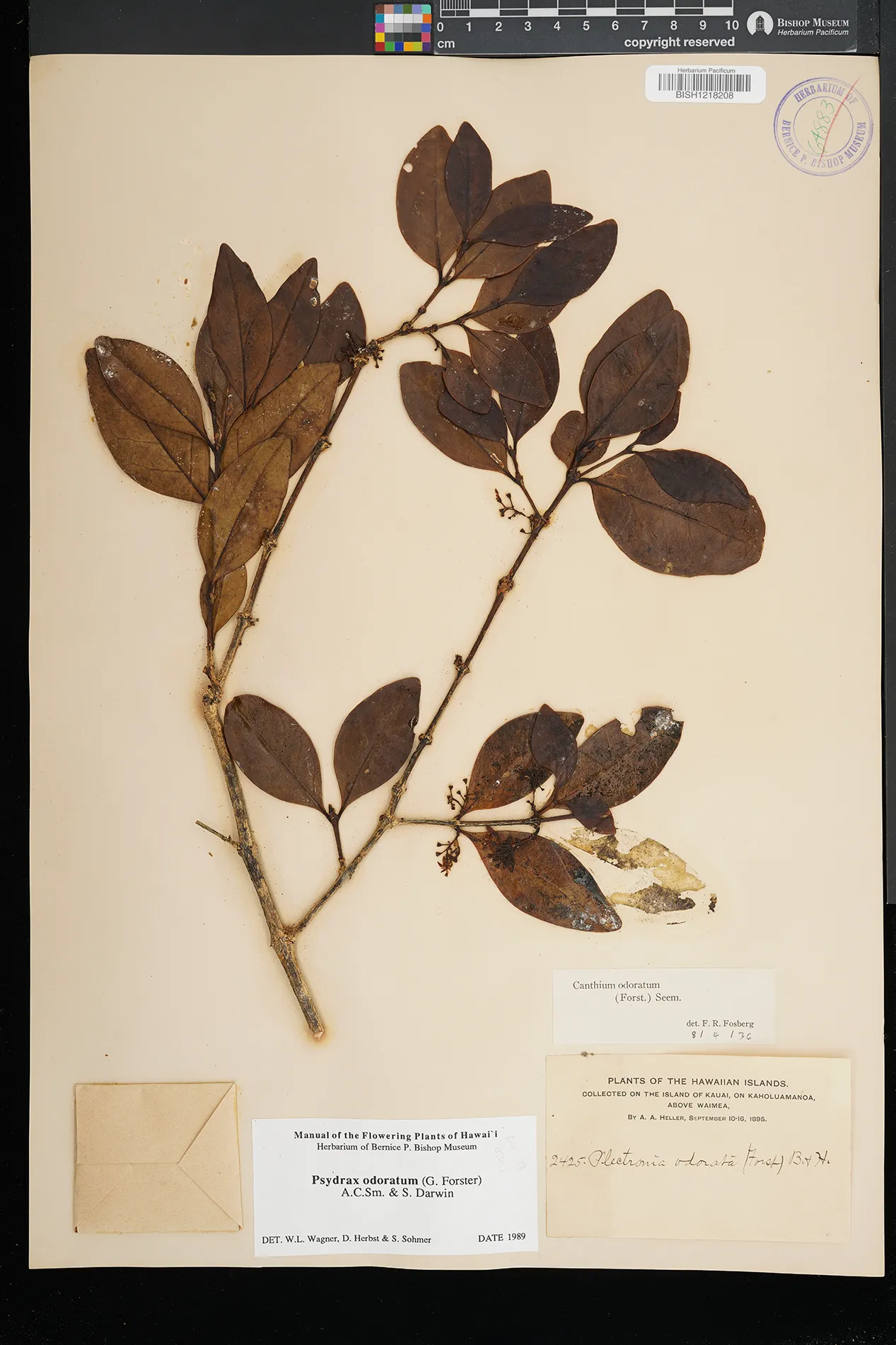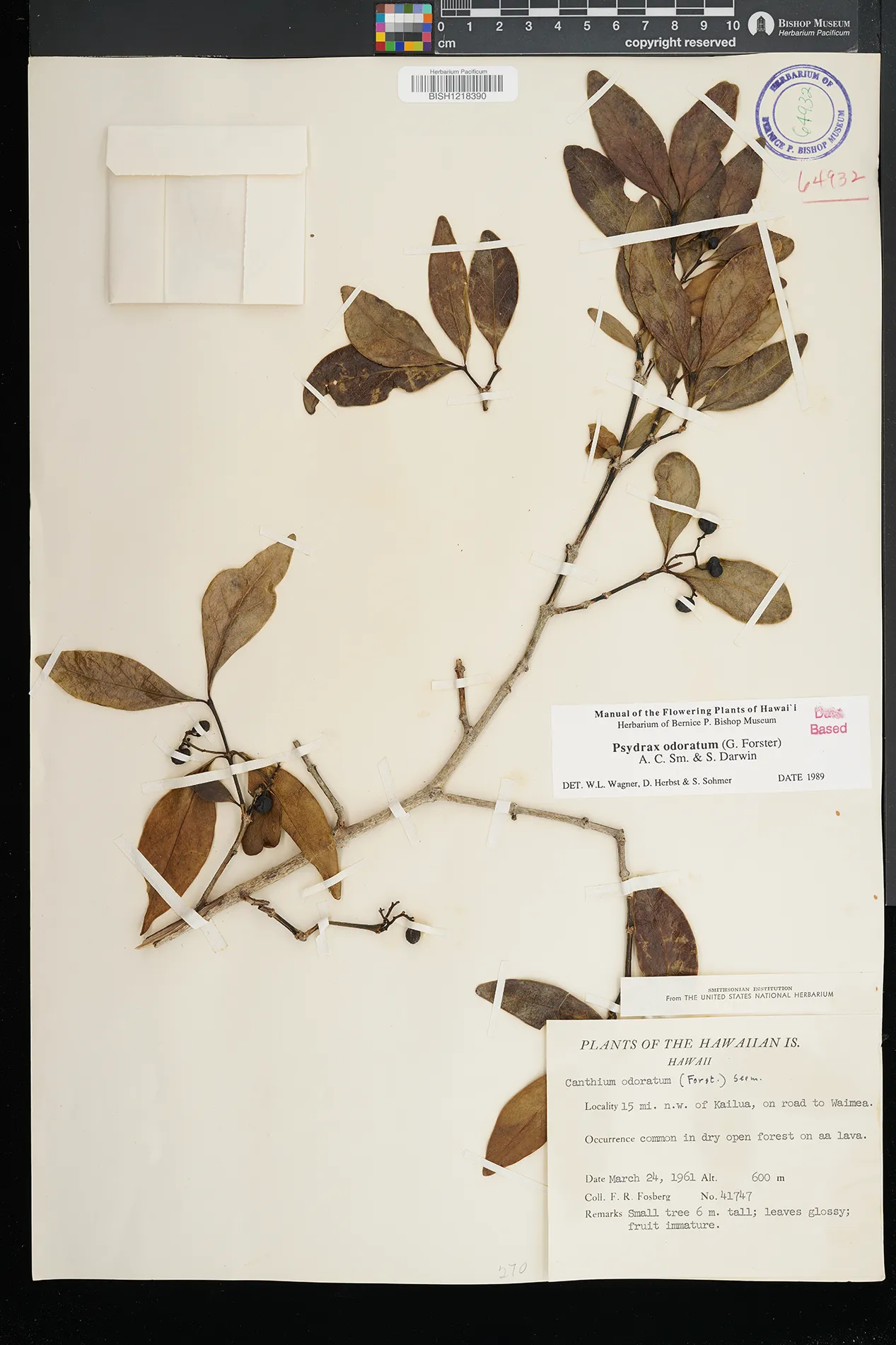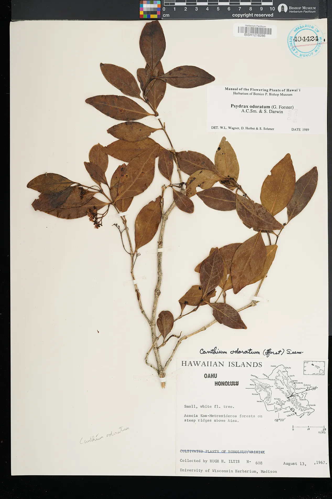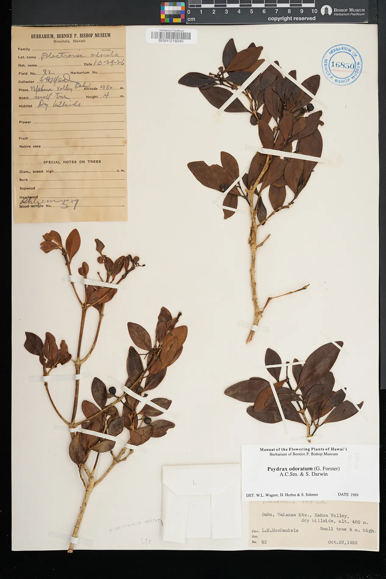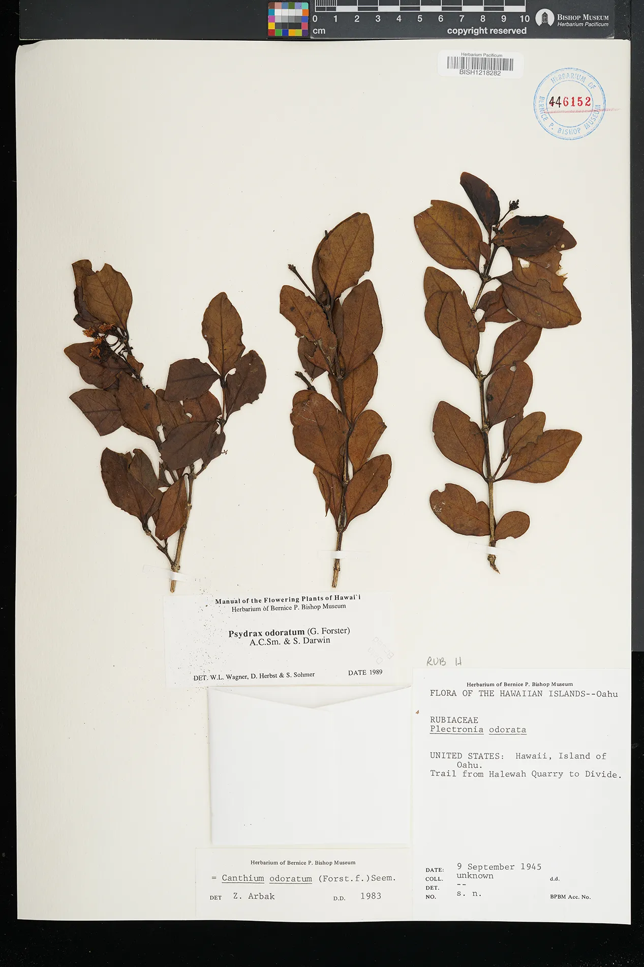 Wagner et al. 1990:1119 (K, O, Mo, L, M, H [as Canthium odoratum]); Smith 1988:230/Herbst & Wagner 1999:31 (COMBNOV, Syn. C. odoratum = P. odorata); Staples & Herbst 2005:484 (KEY), 499 (DESCR)