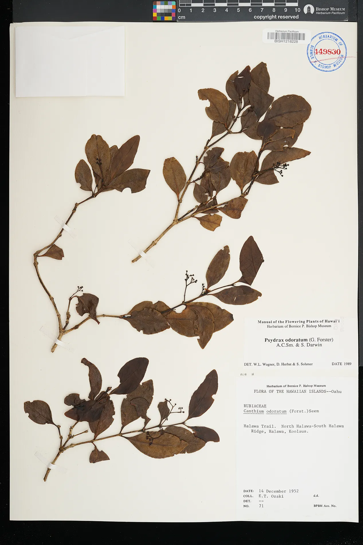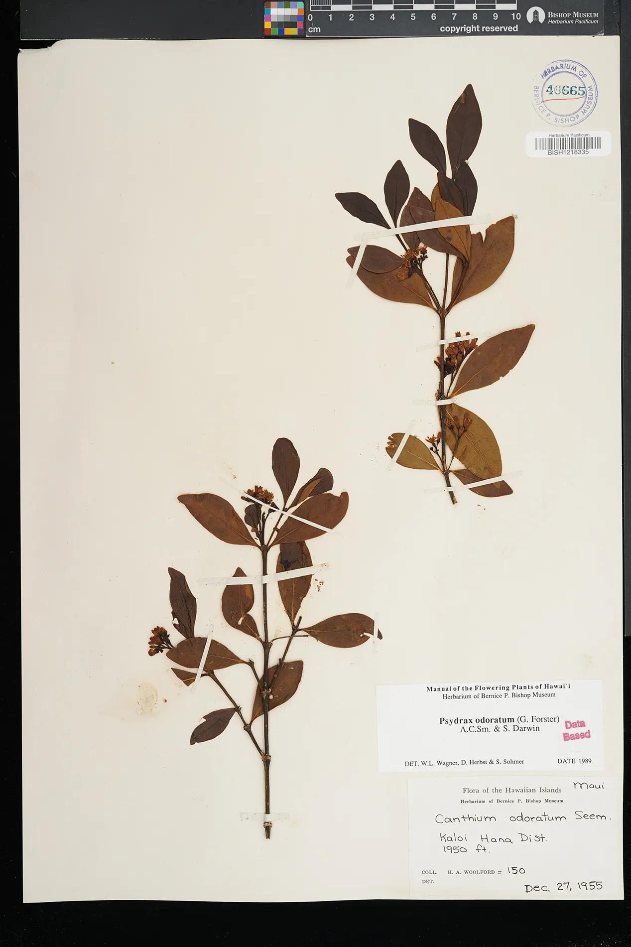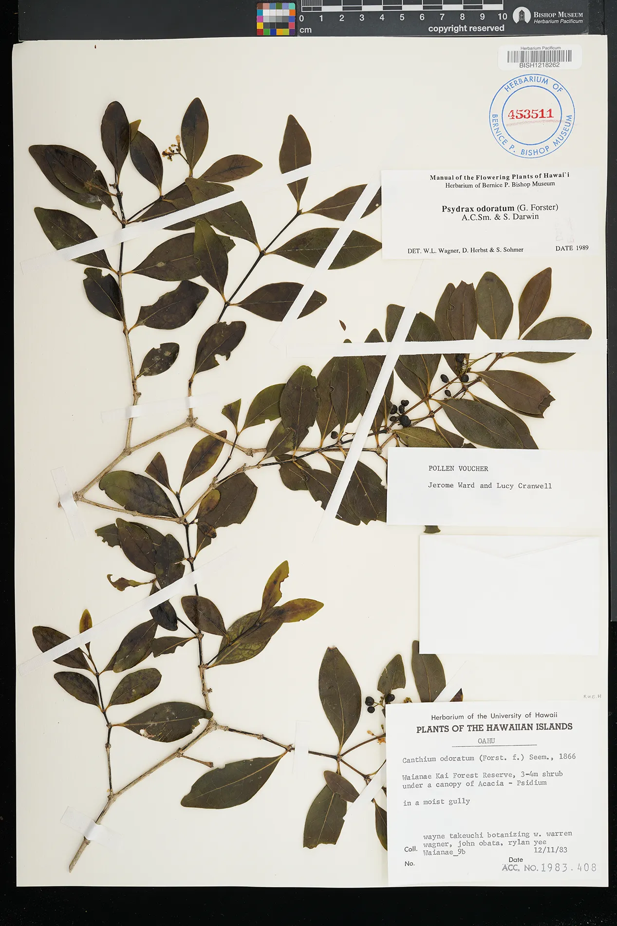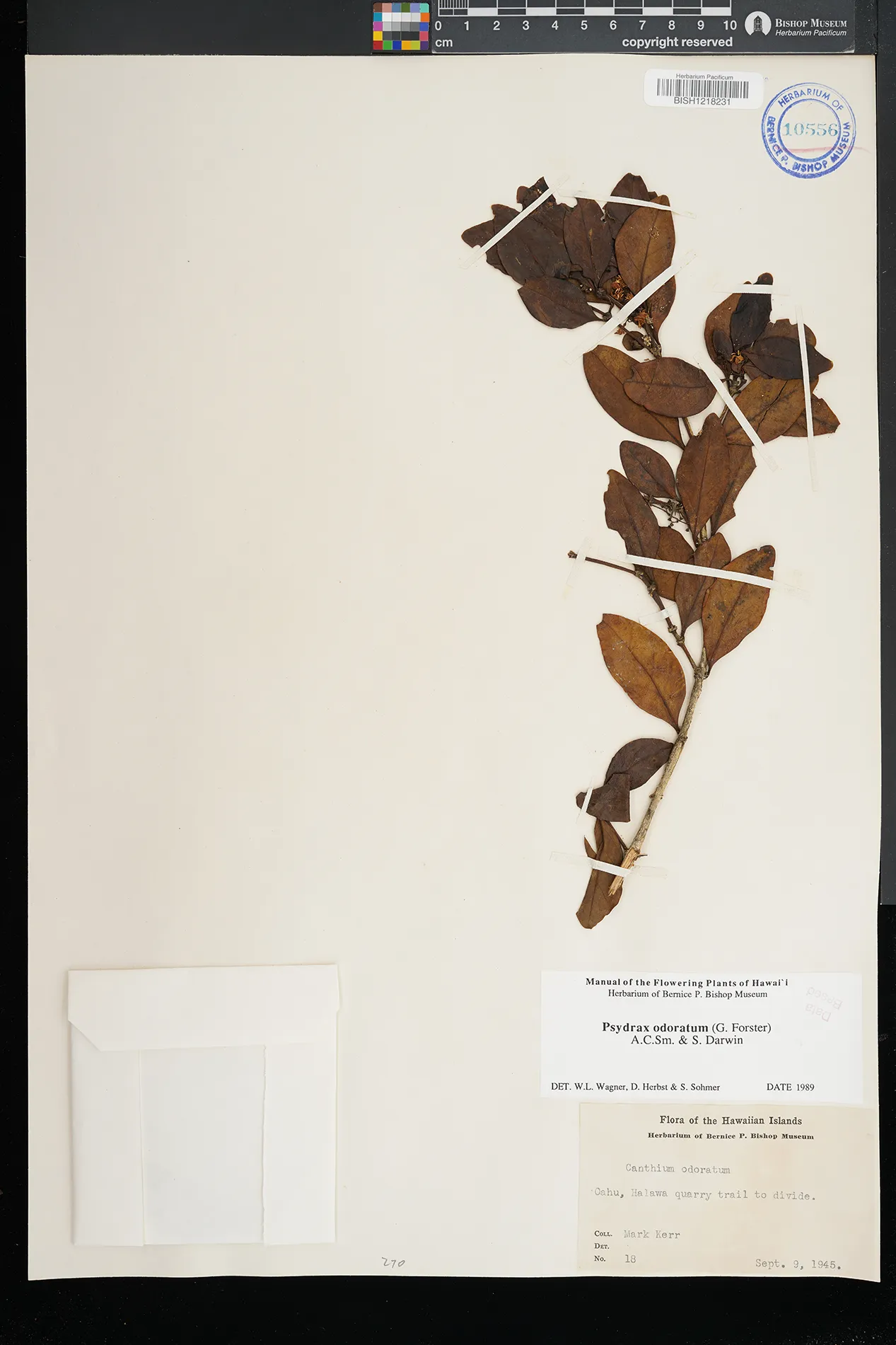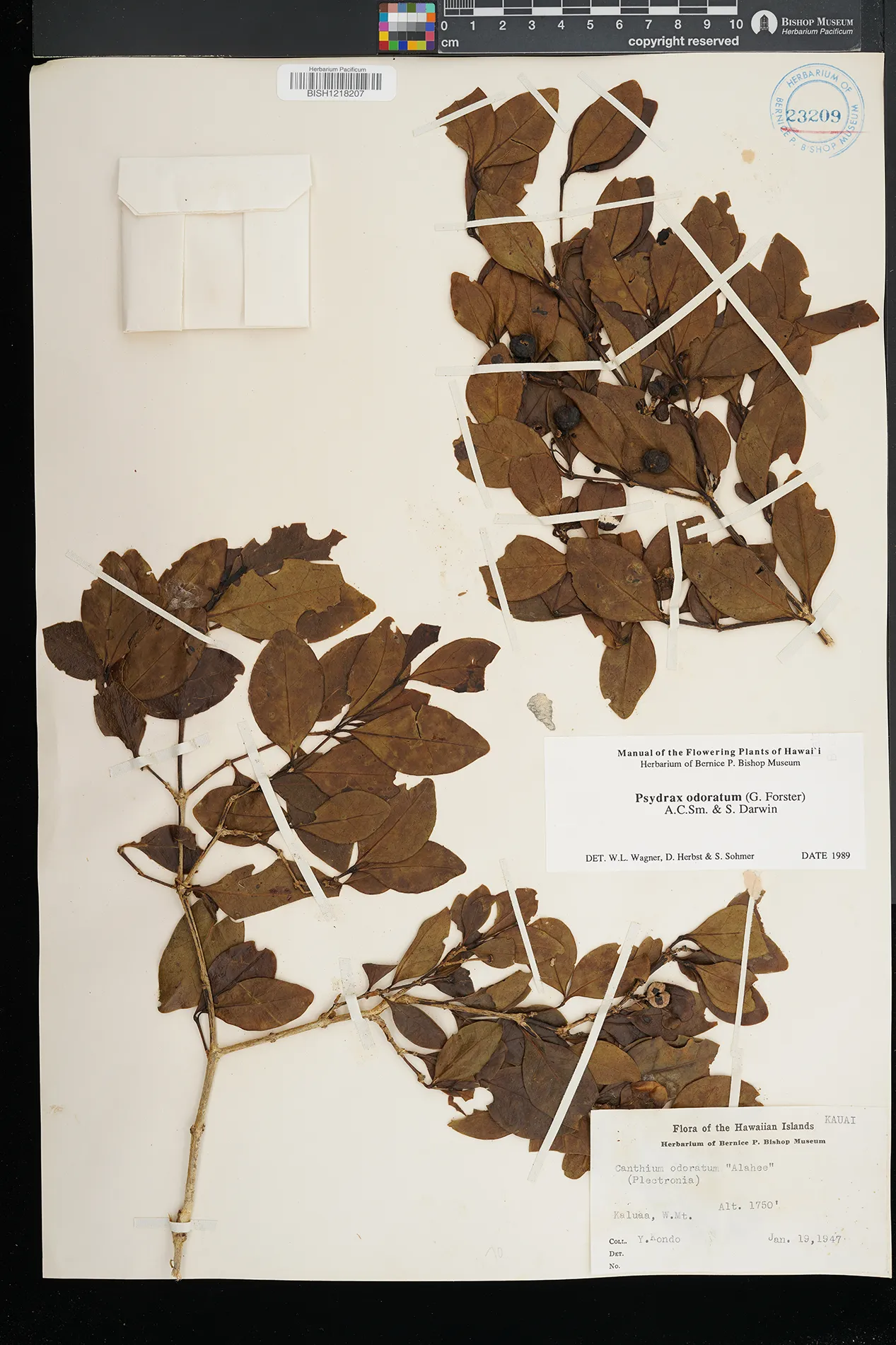 Wagner et al. 1990:1119 (K, O, Mo, L, M, H [as Canthium odoratum]); Smith 1988:230/Herbst & Wagner 1999:31 (COMBNOV, Syn. C. odoratum = P. odorata); Staples & Herbst 2005:484 (KEY), 499 (DESCR)