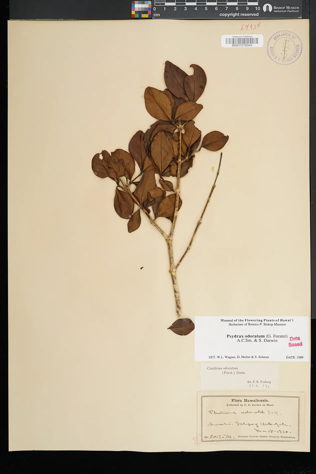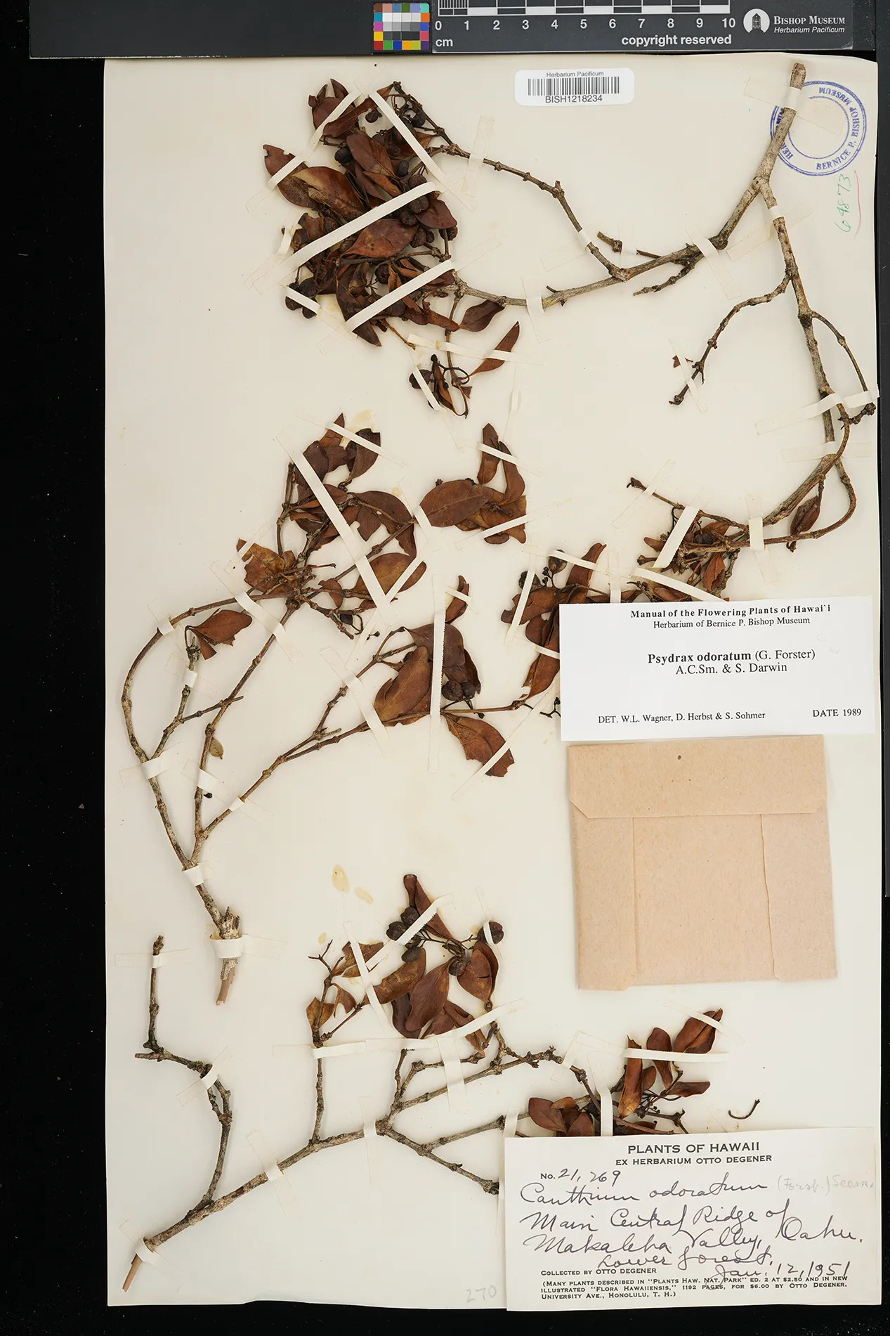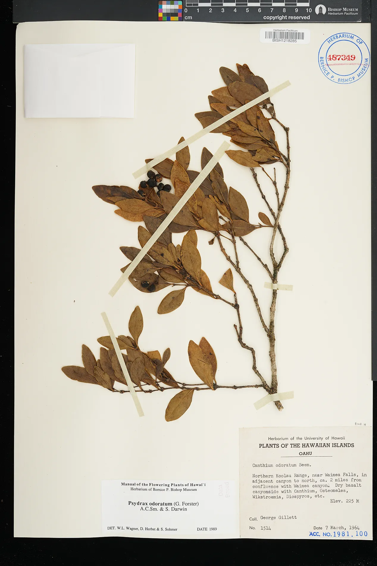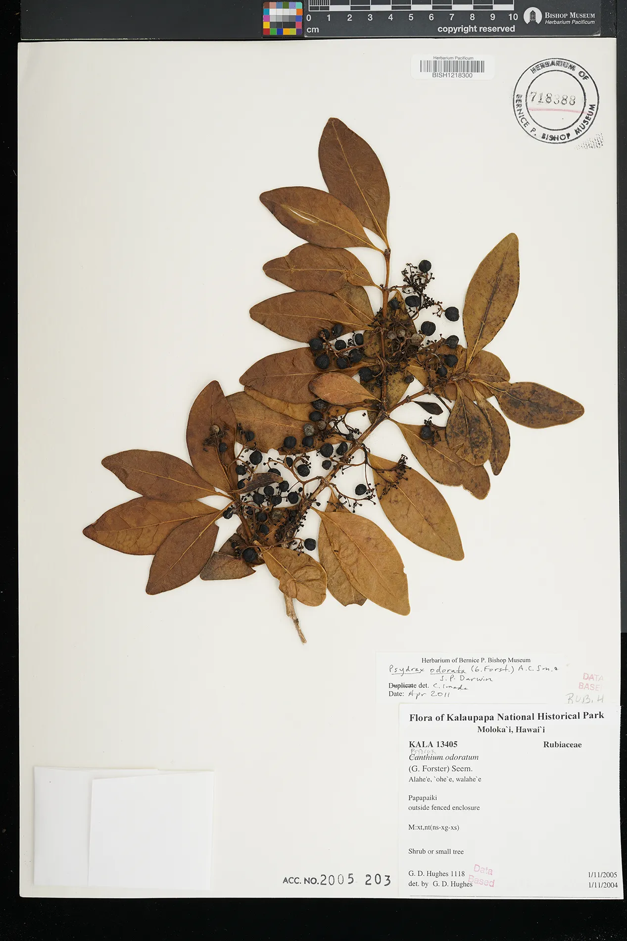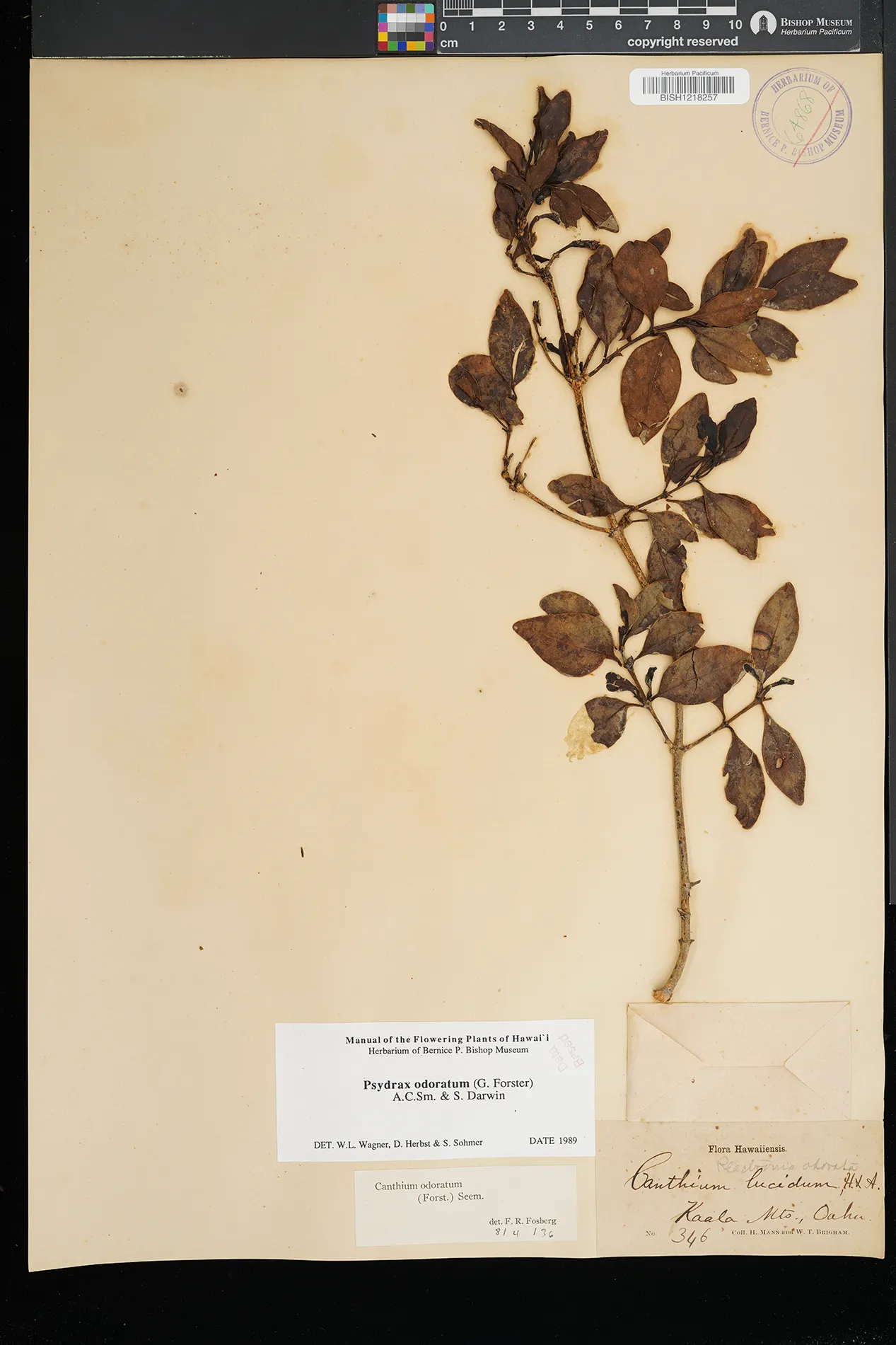 Wagner et al. 1990:1119 (K, O, Mo, L, M, H [as Canthium odoratum]); Smith 1988:230/Herbst & Wagner 1999:31 (COMBNOV, Syn. C. odoratum = P. odorata); Staples & Herbst 2005:484 (KEY), 499 (DESCR)