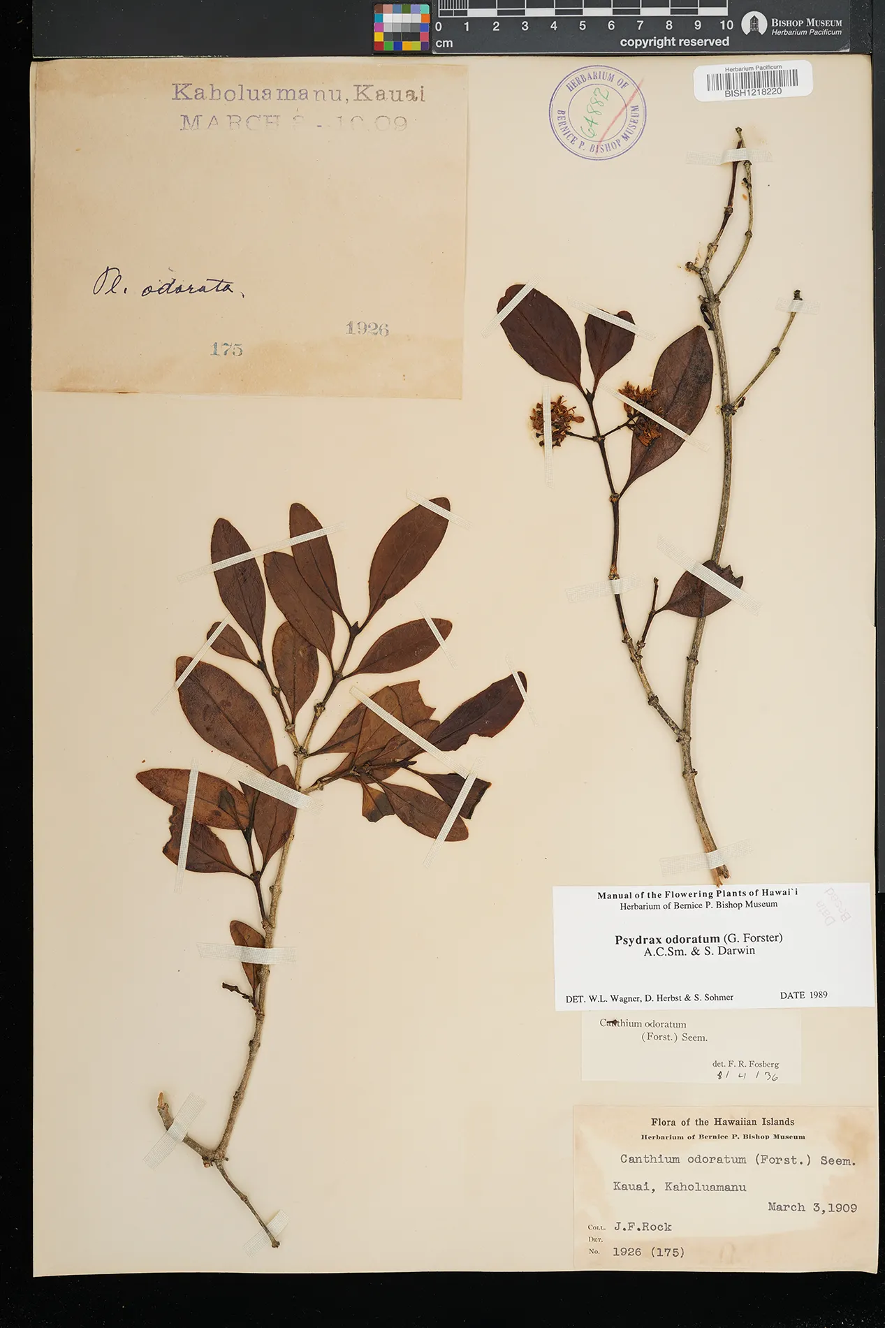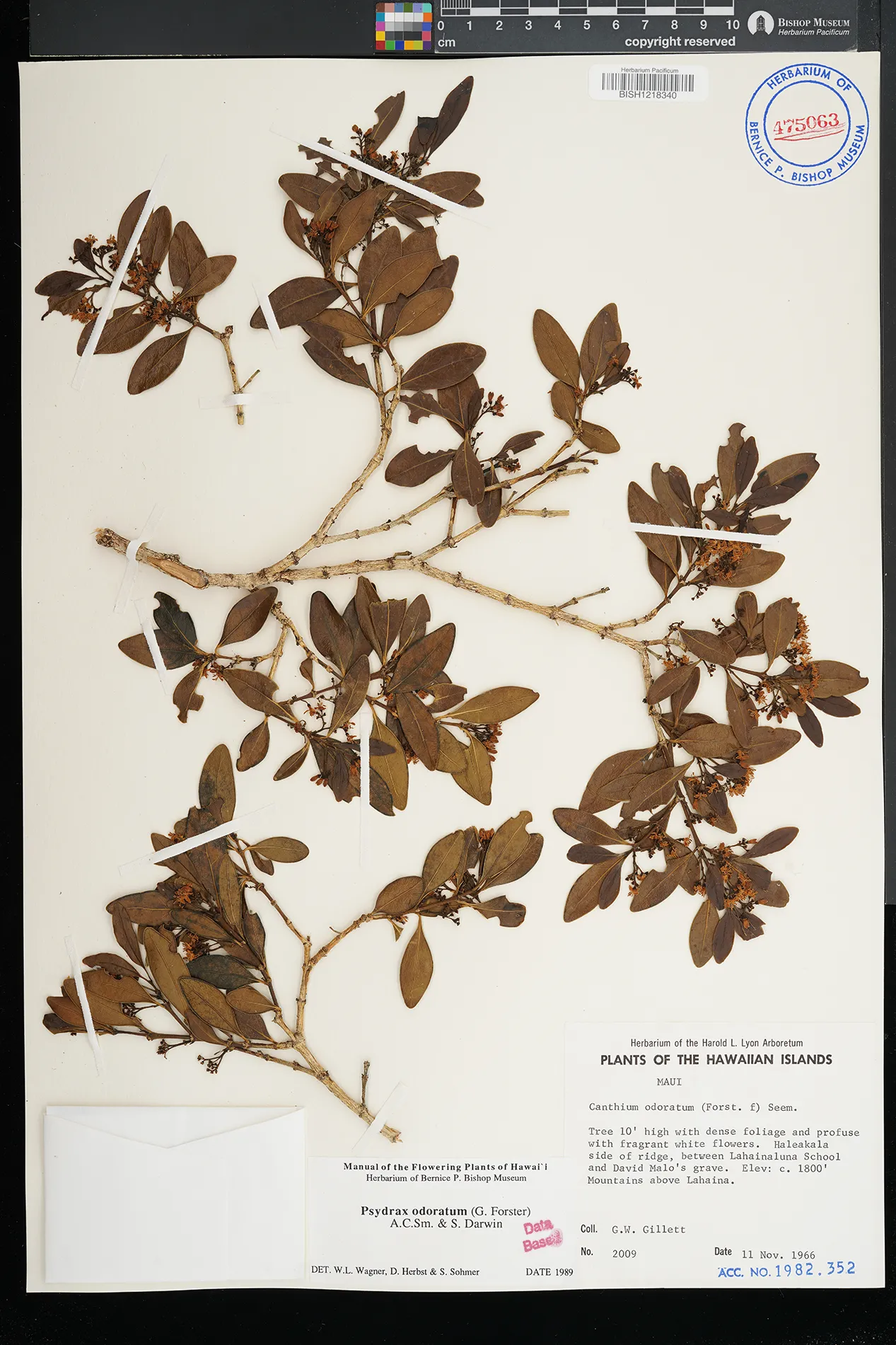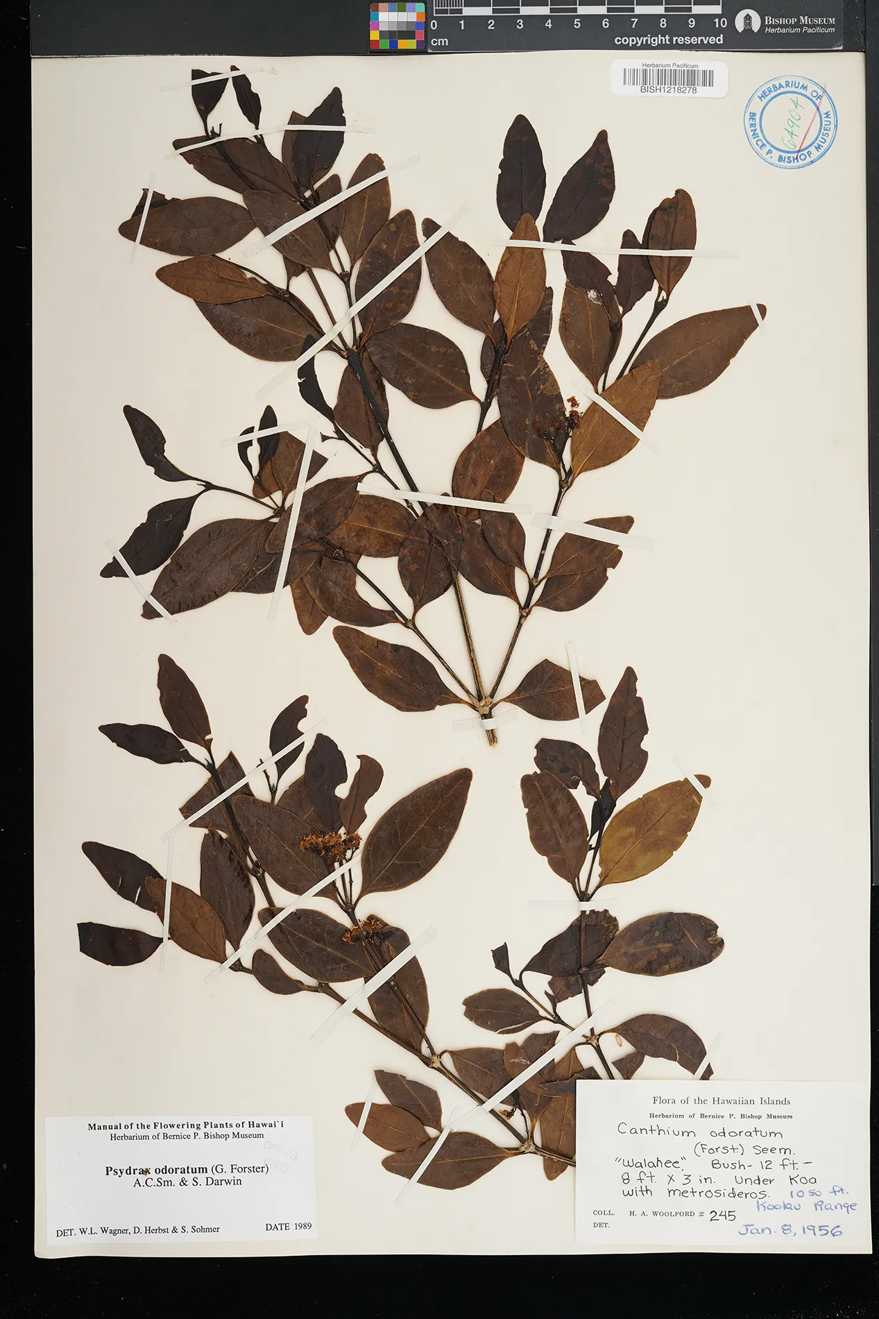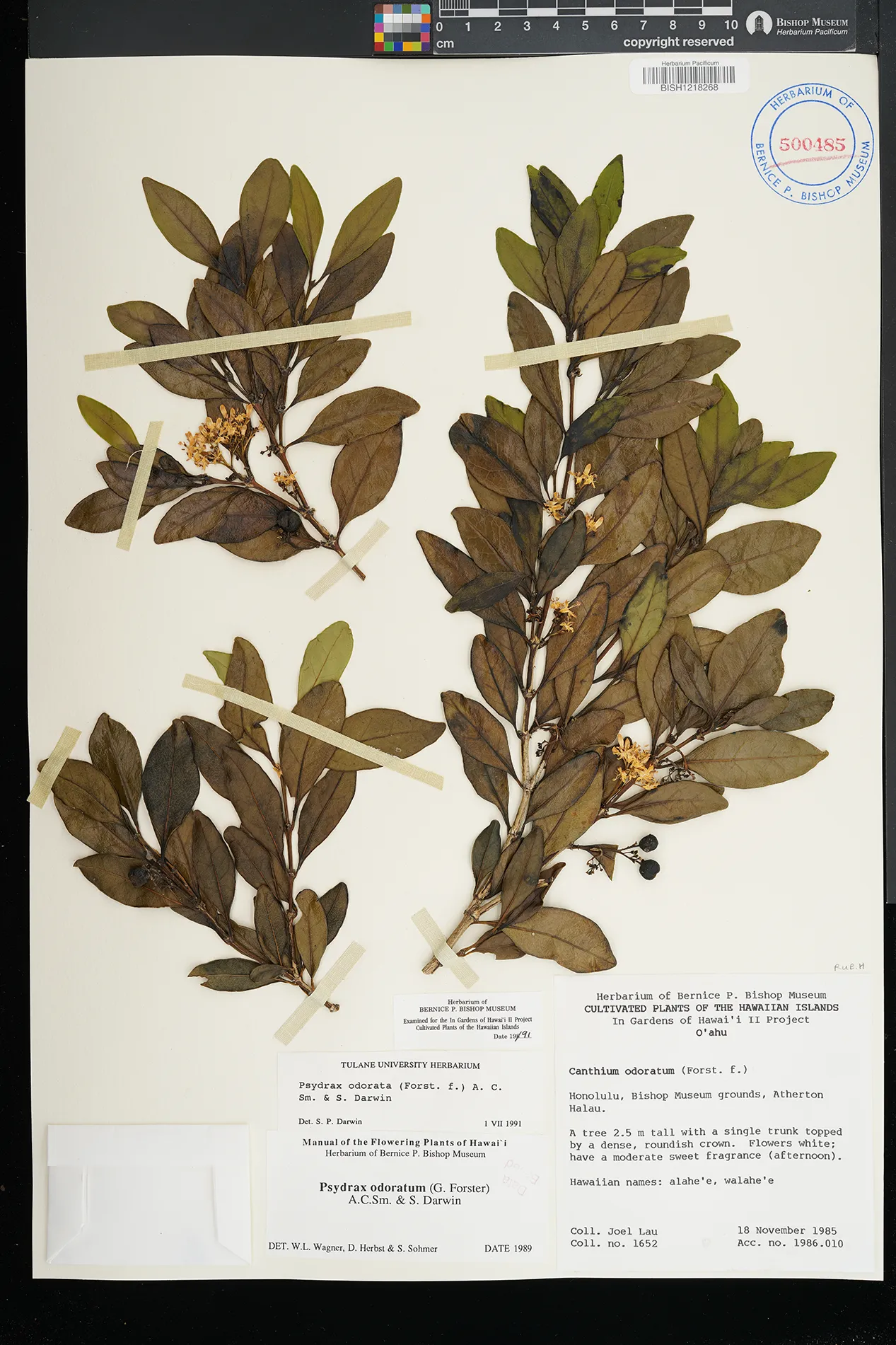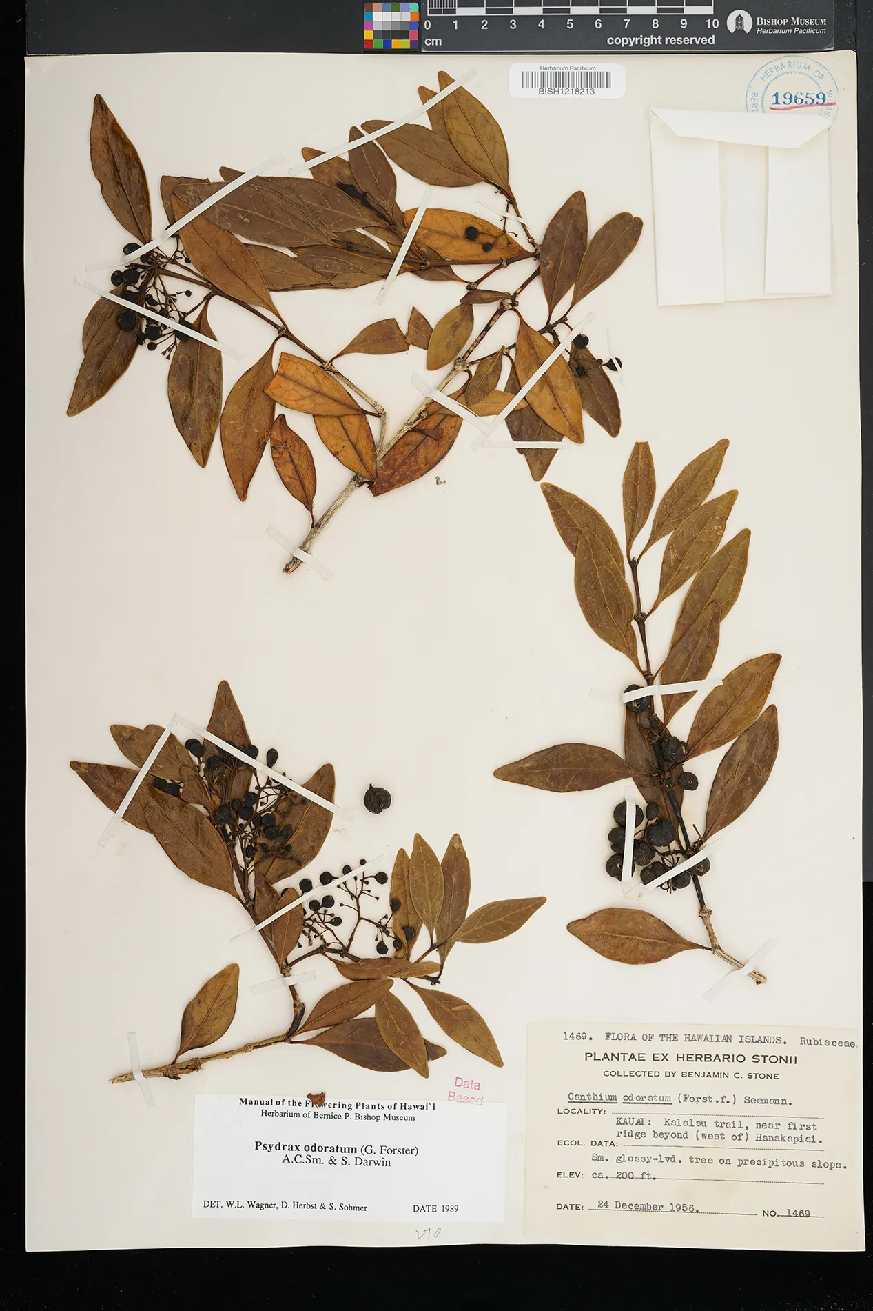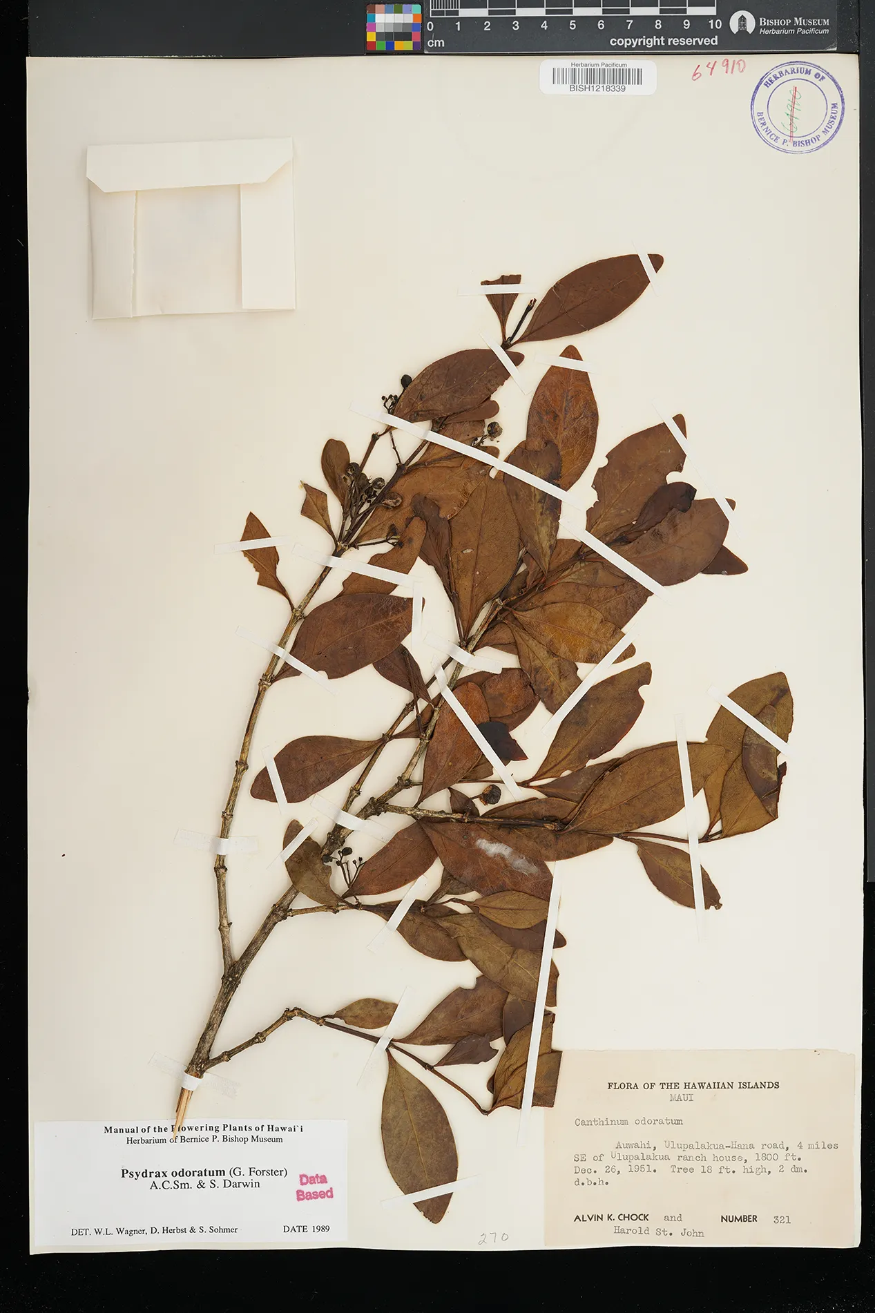 Wagner et al. 1990:1119 (K, O, Mo, L, M, H [as Canthium odoratum]); Smith 1988:230/Herbst & Wagner 1999:31 (COMBNOV, Syn. C. odoratum = P. odorata); Staples & Herbst 2005:484 (KEY), 499 (DESCR)