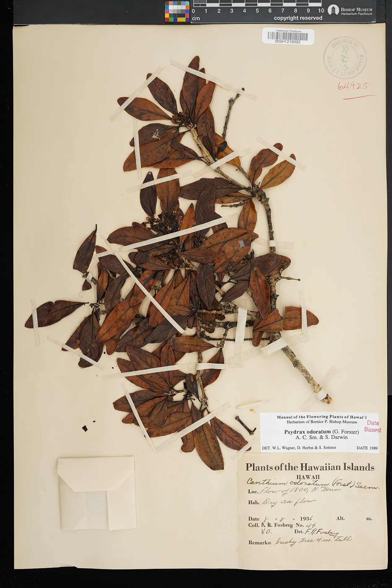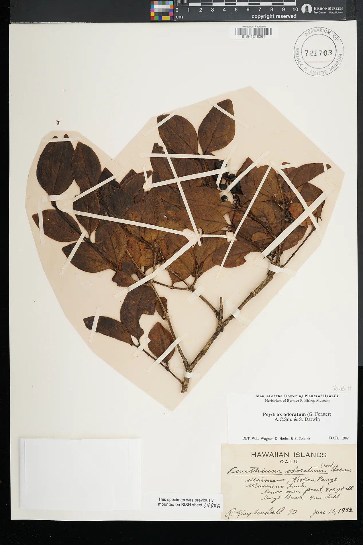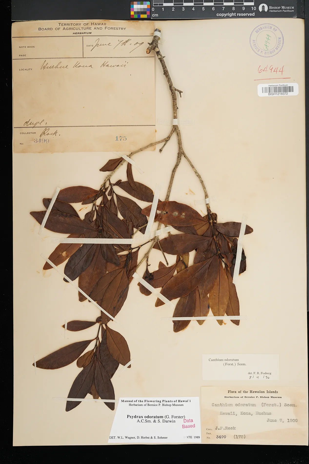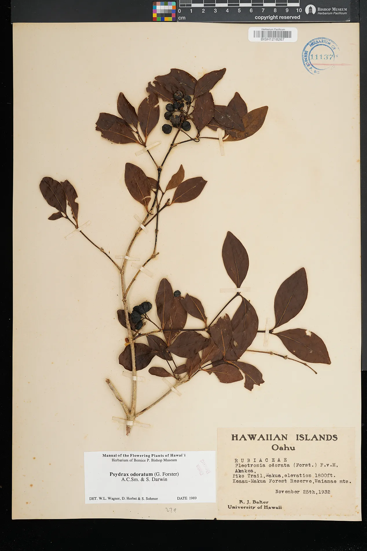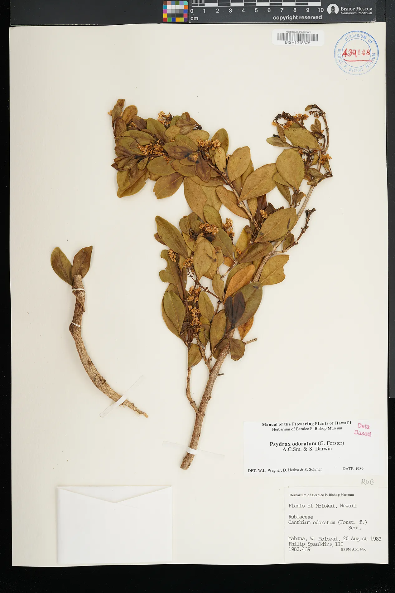 Wagner et al. 1990:1119 (K, O, Mo, L, M, H [as Canthium odoratum]); Smith 1988:230/Herbst & Wagner 1999:31 (COMBNOV, Syn. C. odoratum = P. odorata); Staples & Herbst 2005:484 (KEY), 499 (DESCR)