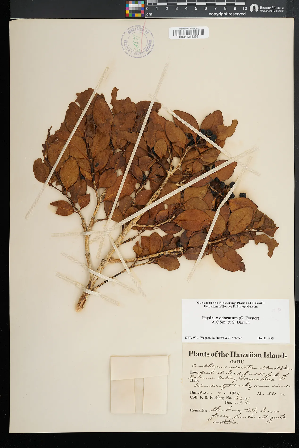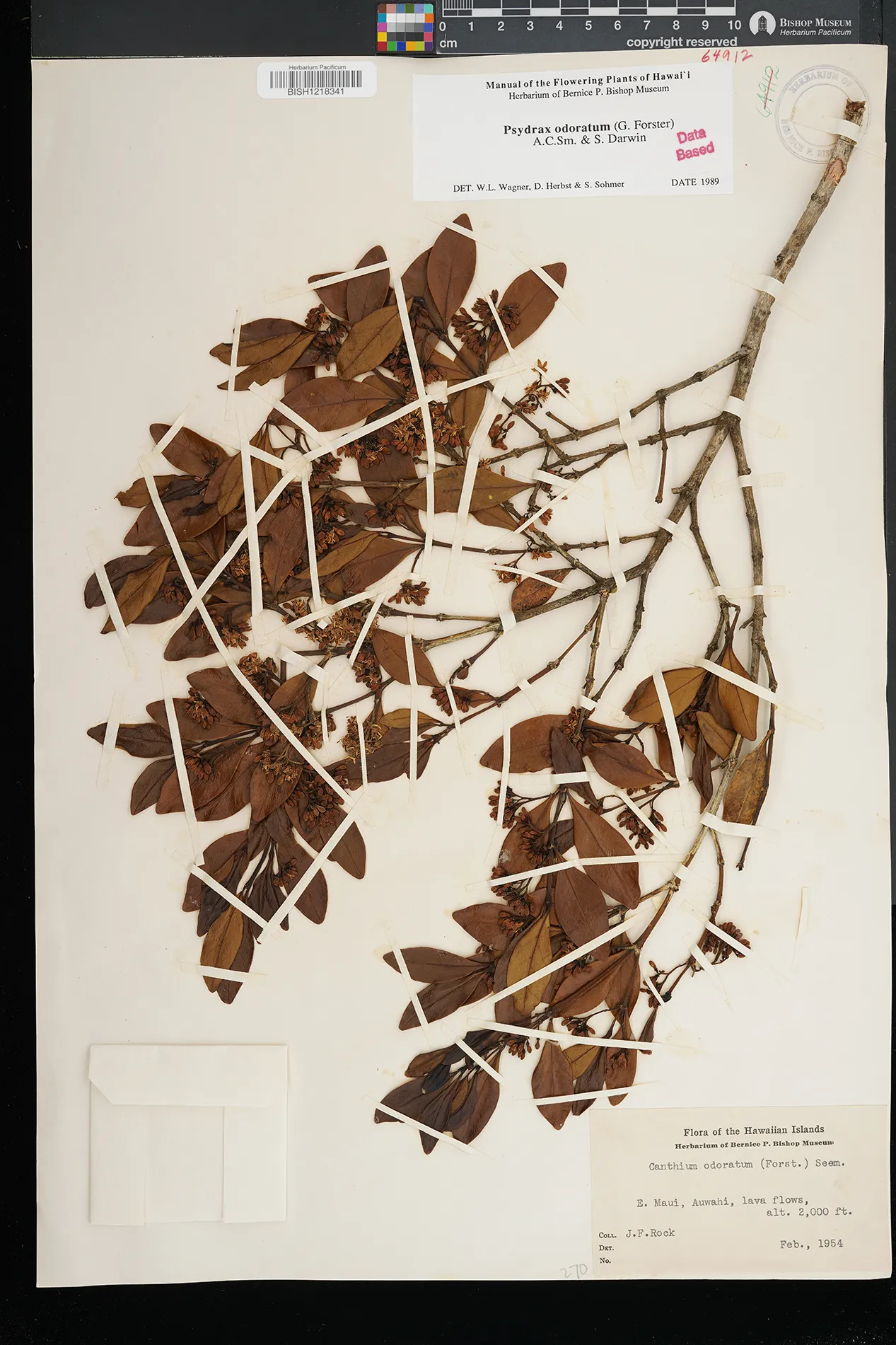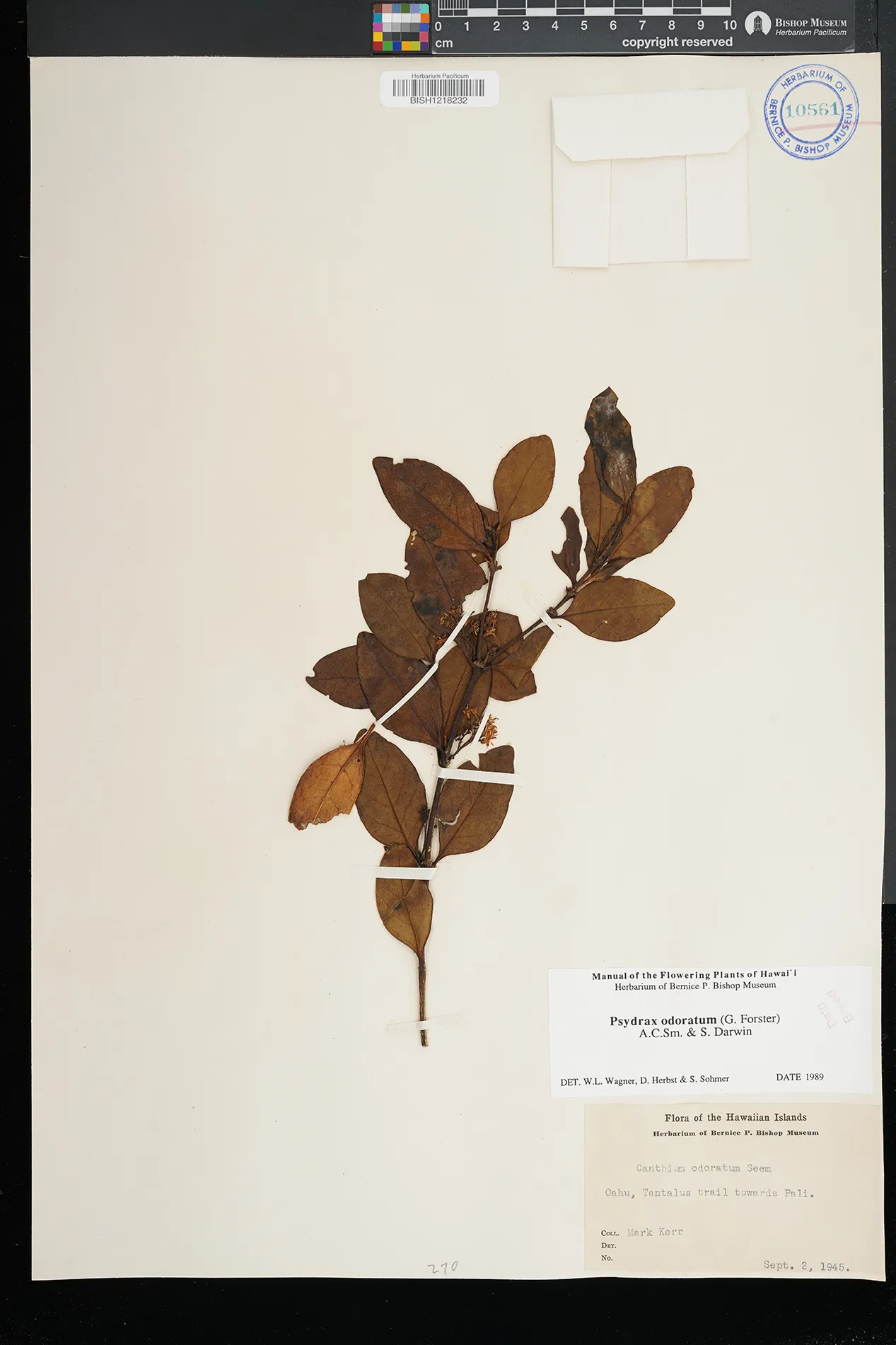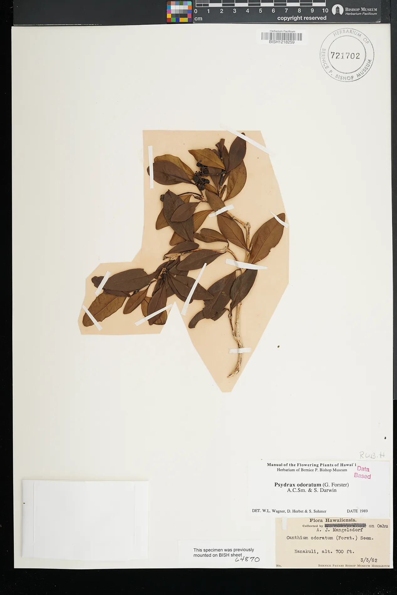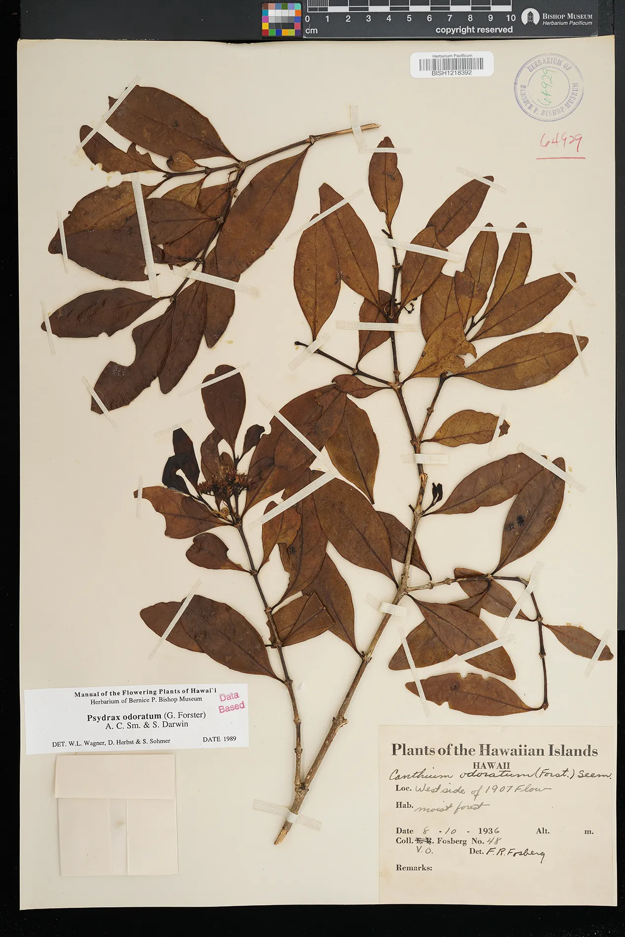 Wagner et al. 1990:1119 (K, O, Mo, L, M, H [as Canthium odoratum]); Smith 1988:230/Herbst & Wagner 1999:31 (COMBNOV, Syn. C. odoratum = P. odorata); Staples & Herbst 2005:484 (KEY), 499 (DESCR)