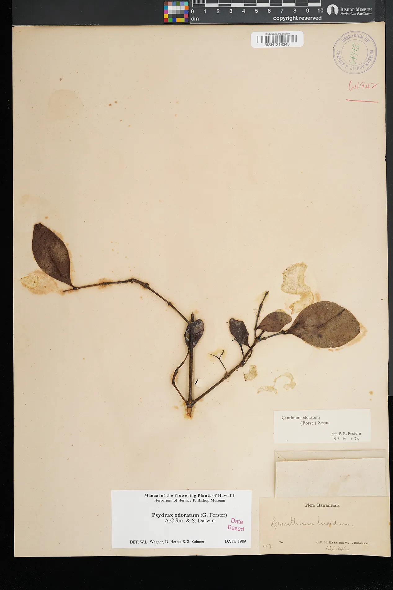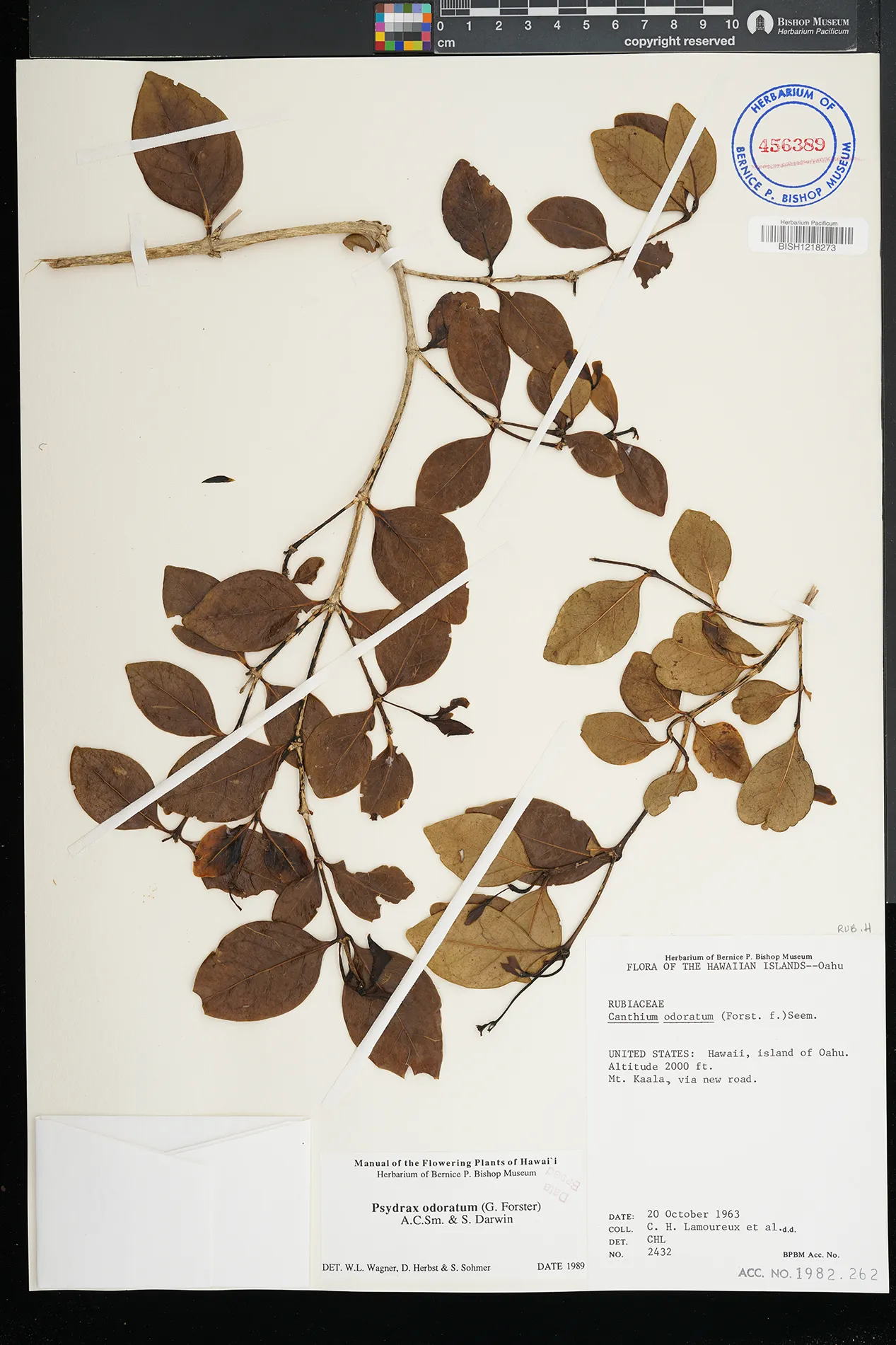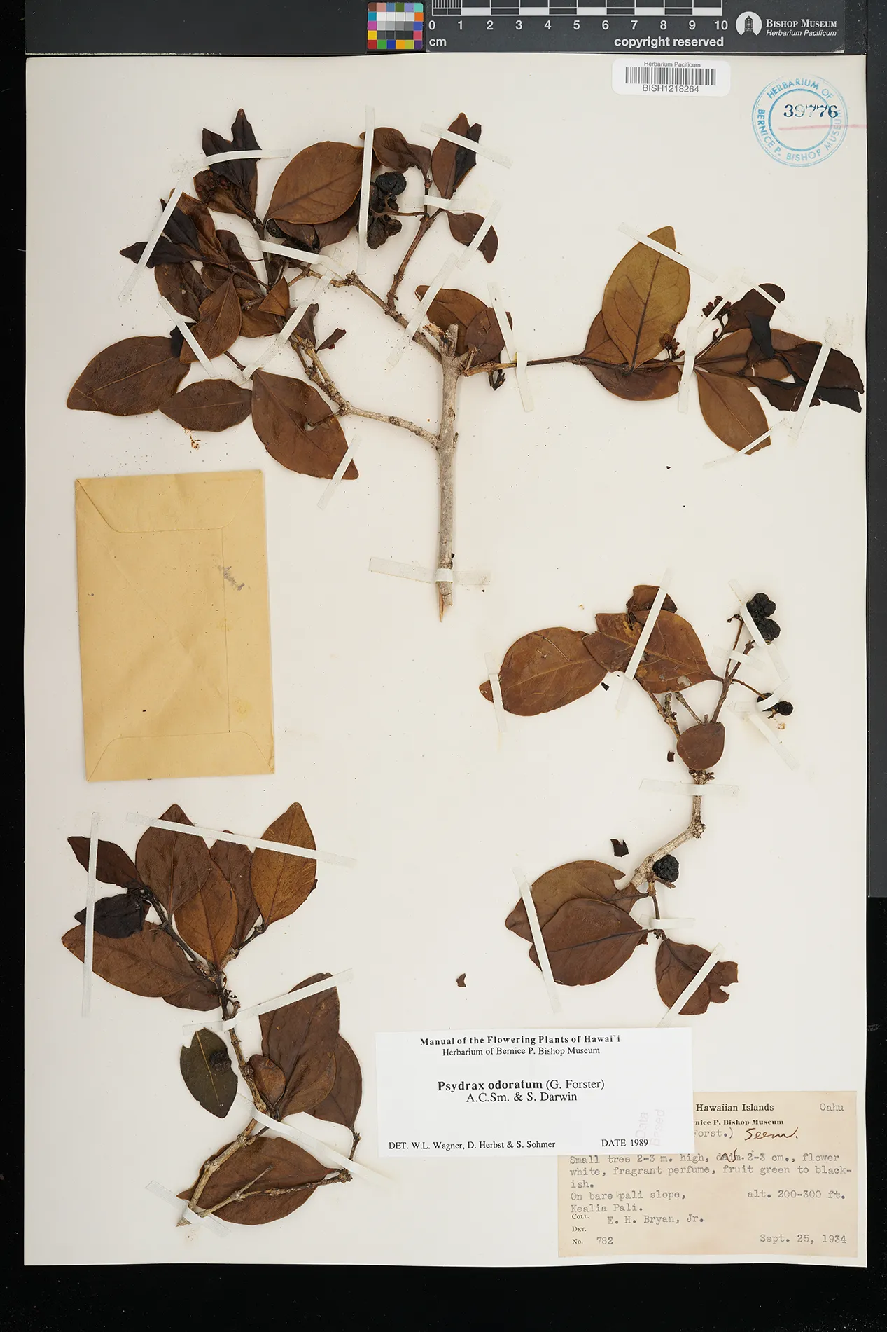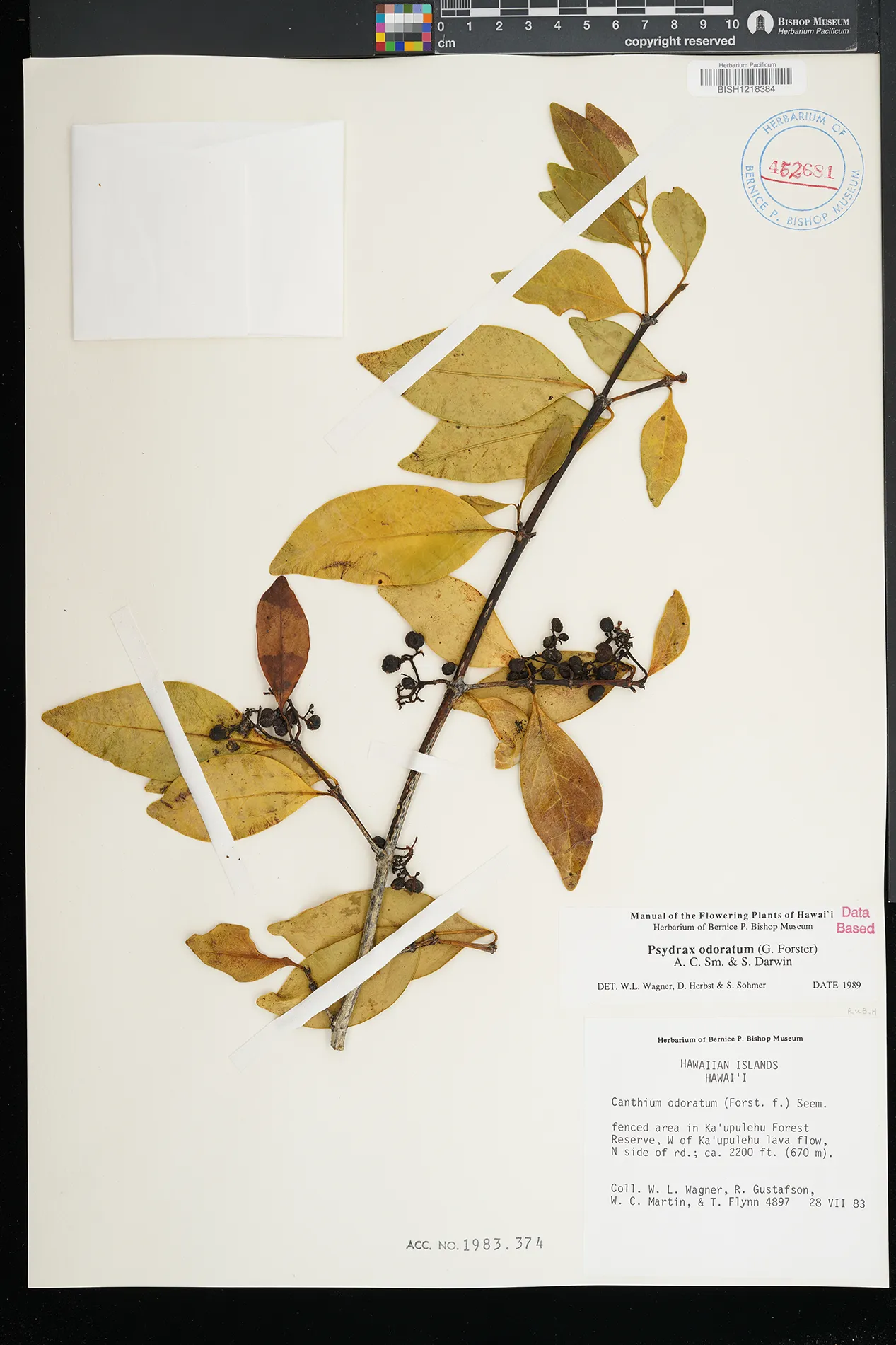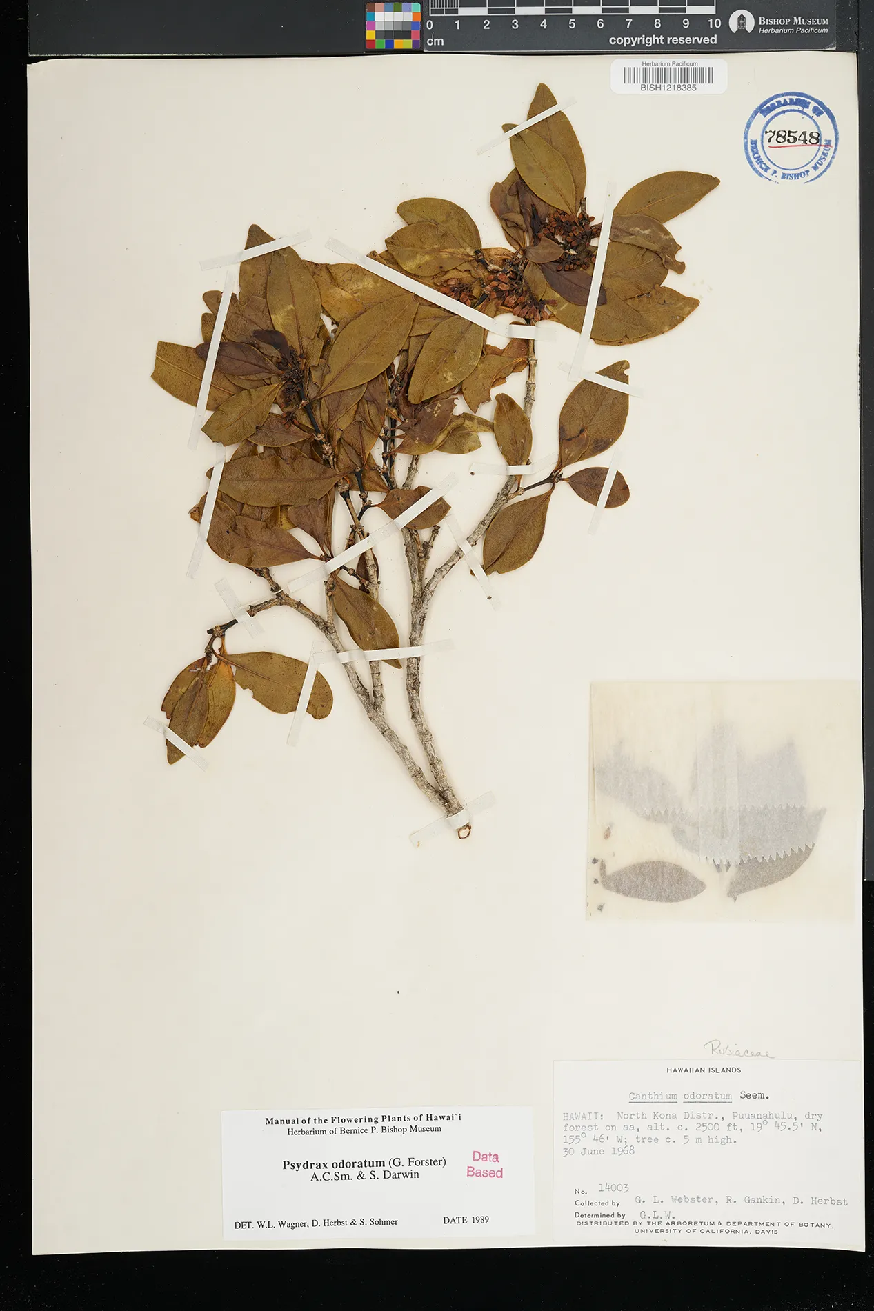 Wagner et al. 1990:1119 (K, O, Mo, L, M, H [as Canthium odoratum]); Smith 1988:230/Herbst & Wagner 1999:31 (COMBNOV, Syn. C. odoratum = P. odorata); Staples & Herbst 2005:484 (KEY), 499 (DESCR)