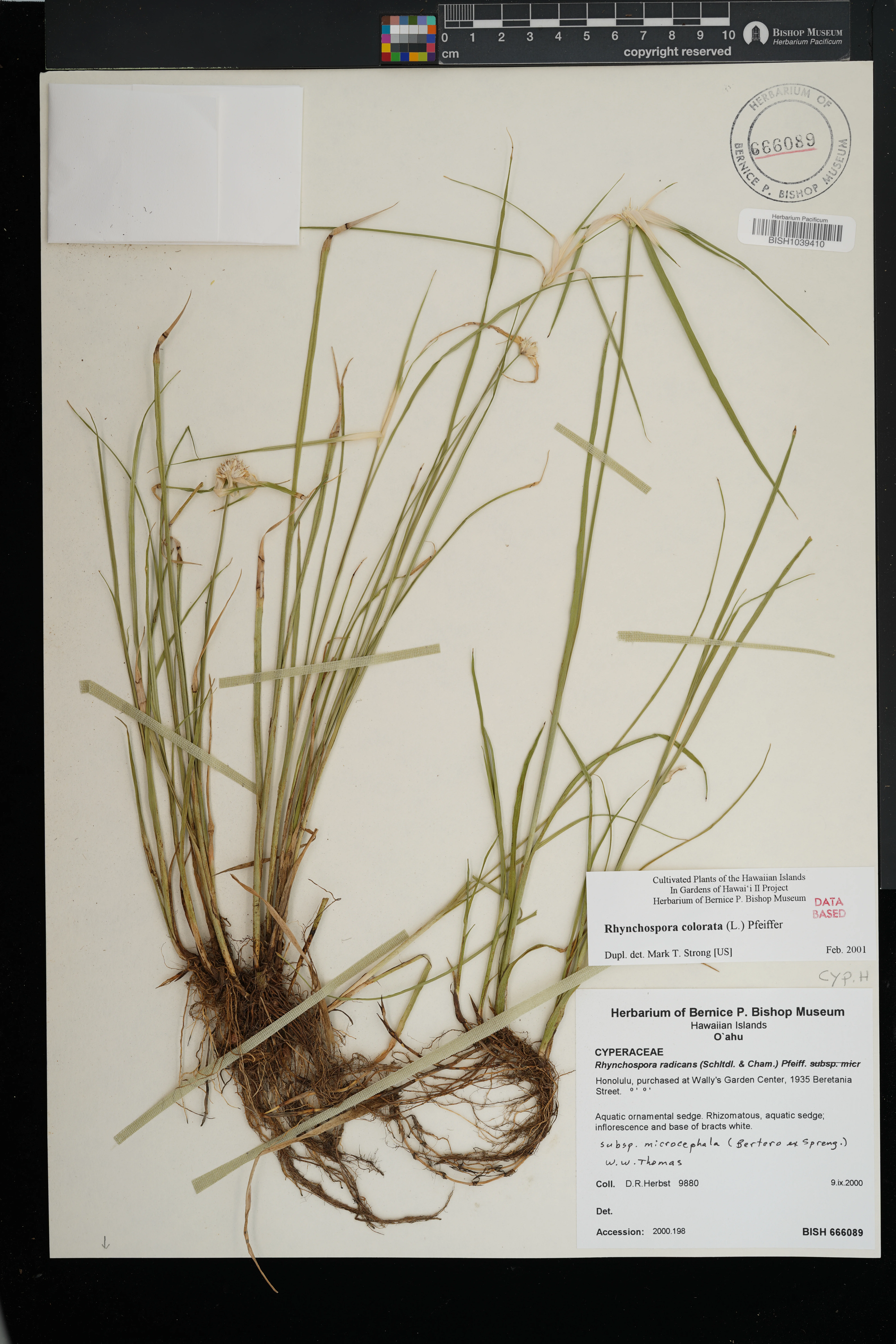 | 4 | Rhynchospora colorata | (L.) H.Pfeiff. | Honolulu, purchased at Wally's Garden Center, 1935 Beretania Street | Aquatic ornamental sedge. | PRESERVED_SPECIMEN | Herbst, D.R. | 9880 | Oahu | BISH | 9/9/2000 |