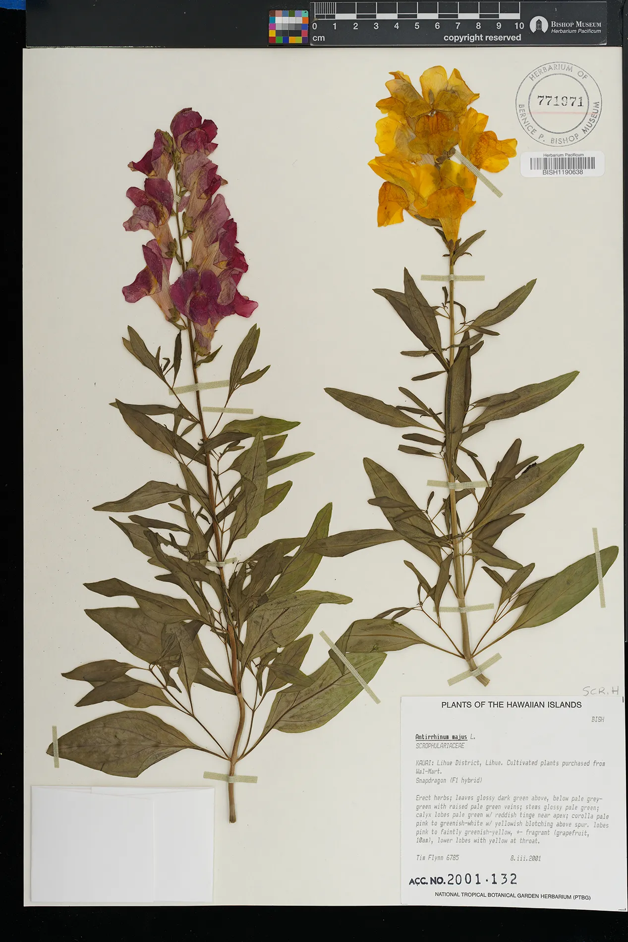 | 2 | Antirrhinum majus | L. | KAUAI: Lihue District, Lihue. Cultivated plants purchased fr om Wal-Mart. Snapdragon (F1 hybrid) | PRESERVED_SPECIMEN | Tim Flynn | 6785 | Kauai | PTBG | 3/8/2001 | |