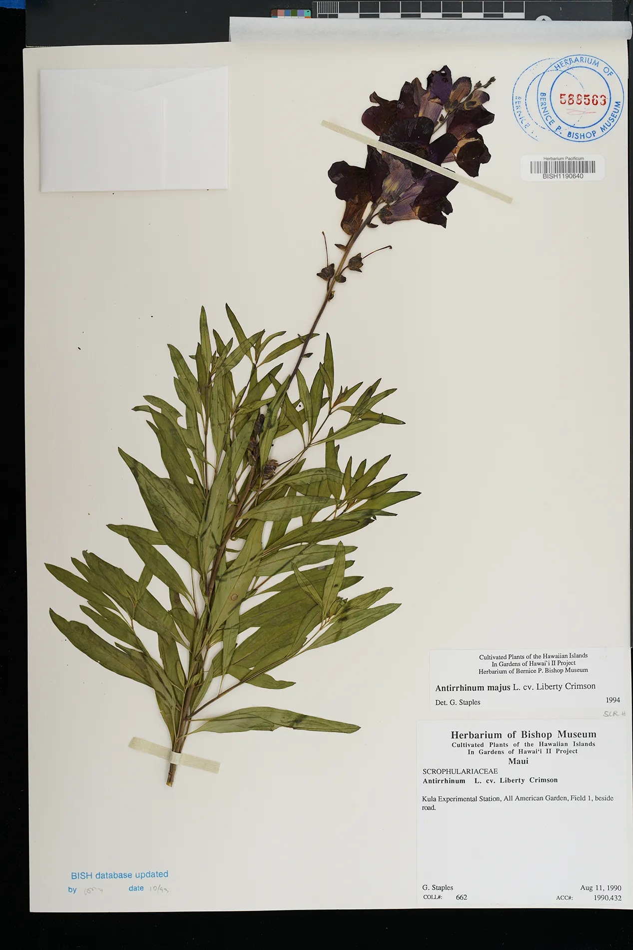 | 3 | Antirrhinum majus | L. | honolulu, 42 coelho way | in Kipuka with Pipturus, Metrosideros, Peperomia, Eupatorium | PRESERVED_SPECIMEN | neal, m.c. | Maui | BISH | 6/13/1950 | |