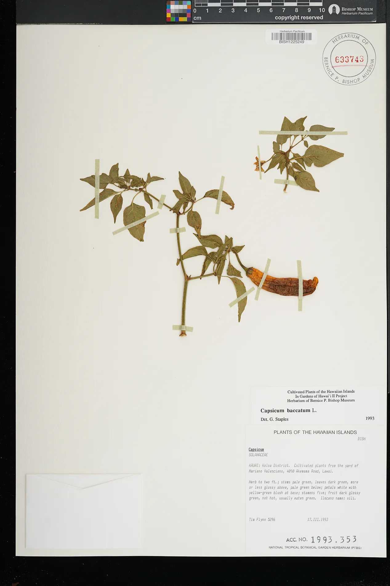 | 4 | Capsicum baccatum | L. | honolulu, foster community garden, foster botanical gardens | PRESERVED_SPECIMEN | mayeda, c.s. | collector number: 53 | Oahu | BISH | 6/10/1991 | |