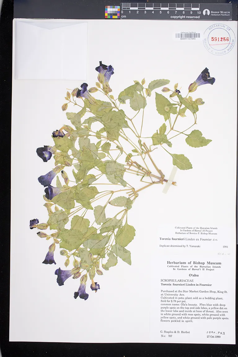 | 10 | Torenia fournieri | Linden ex E.Fourn. | Purchased at the Star Market Garden Shop, King St. at University Ave | cultivated in pots. | PRESERVED_SPECIMEN | Staples, G. | 707 | Oahu | BISH | 10/27/1990 |