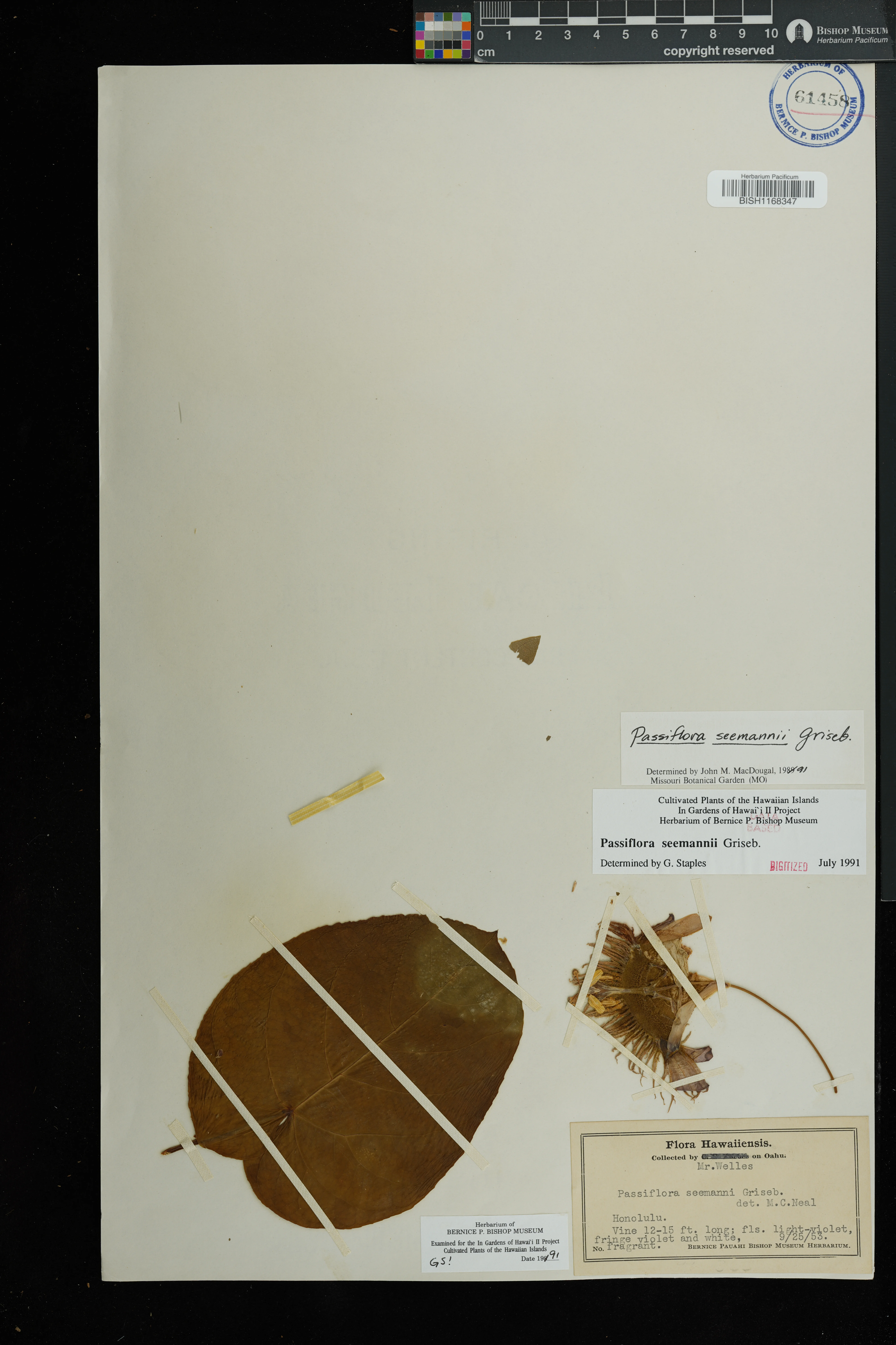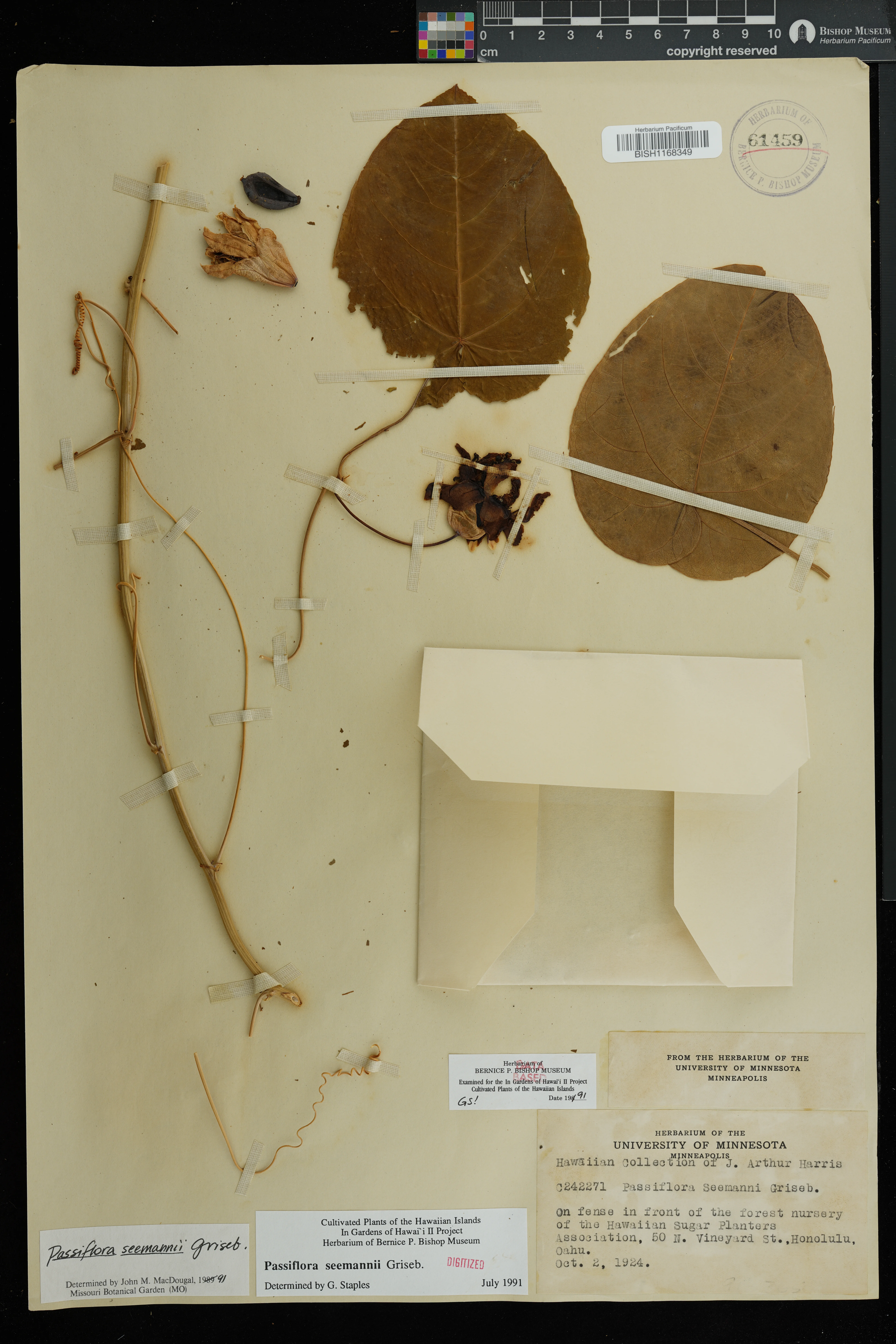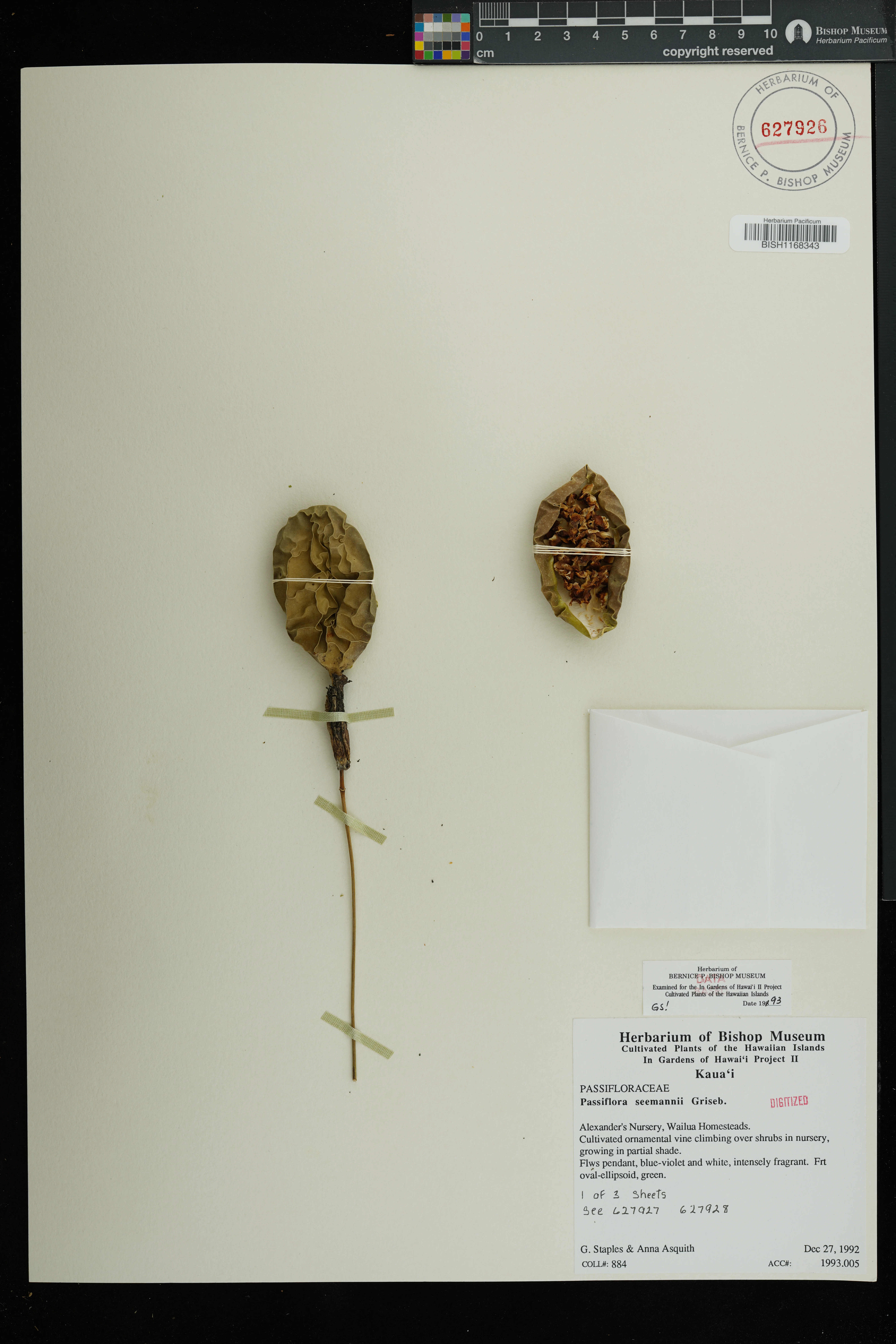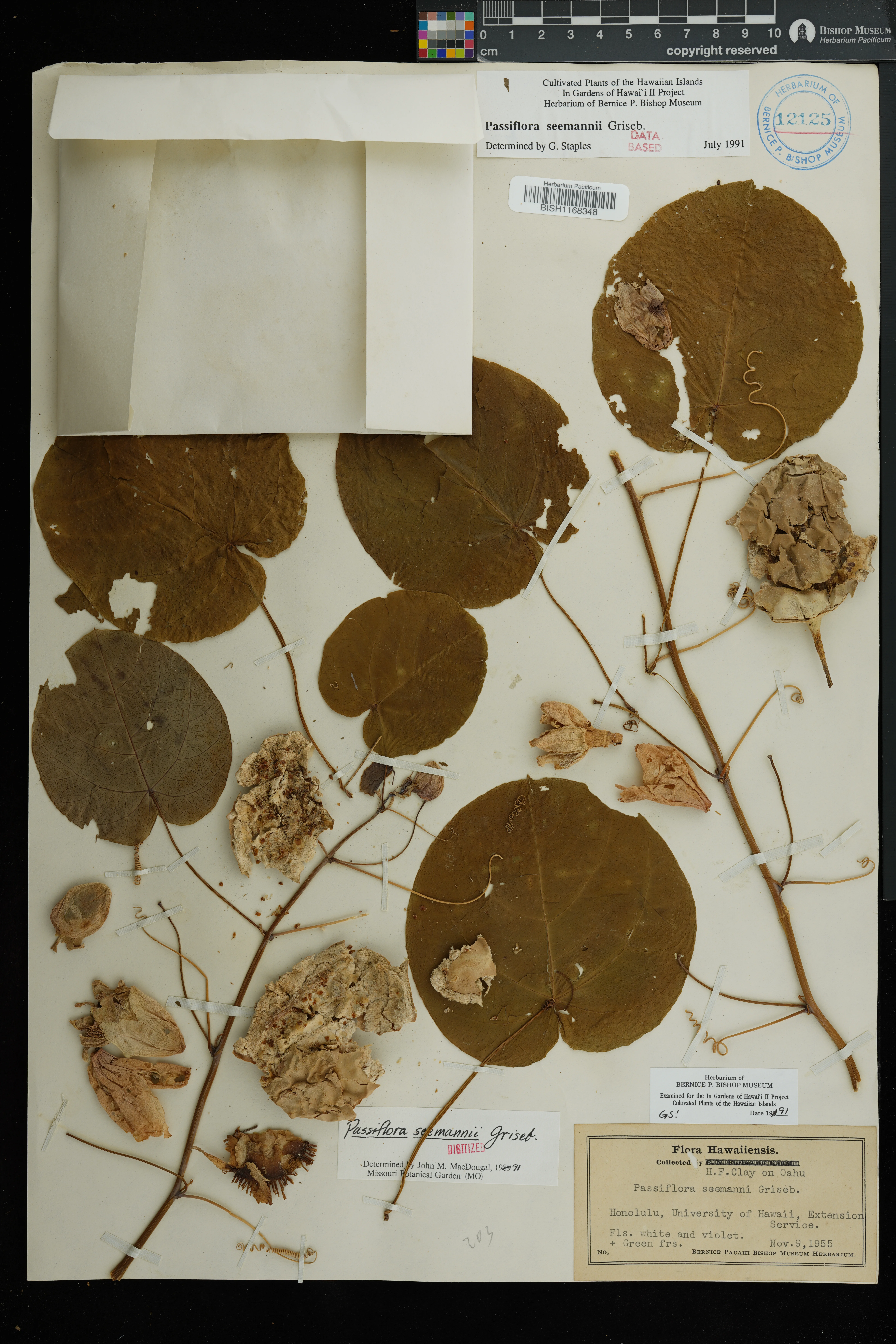 | 4 | Passiflora seemannii | Griseb. | near wailua | PRESERVED_SPECIMEN | welles | Hawaii | BISH | 12/15/1952 | ||