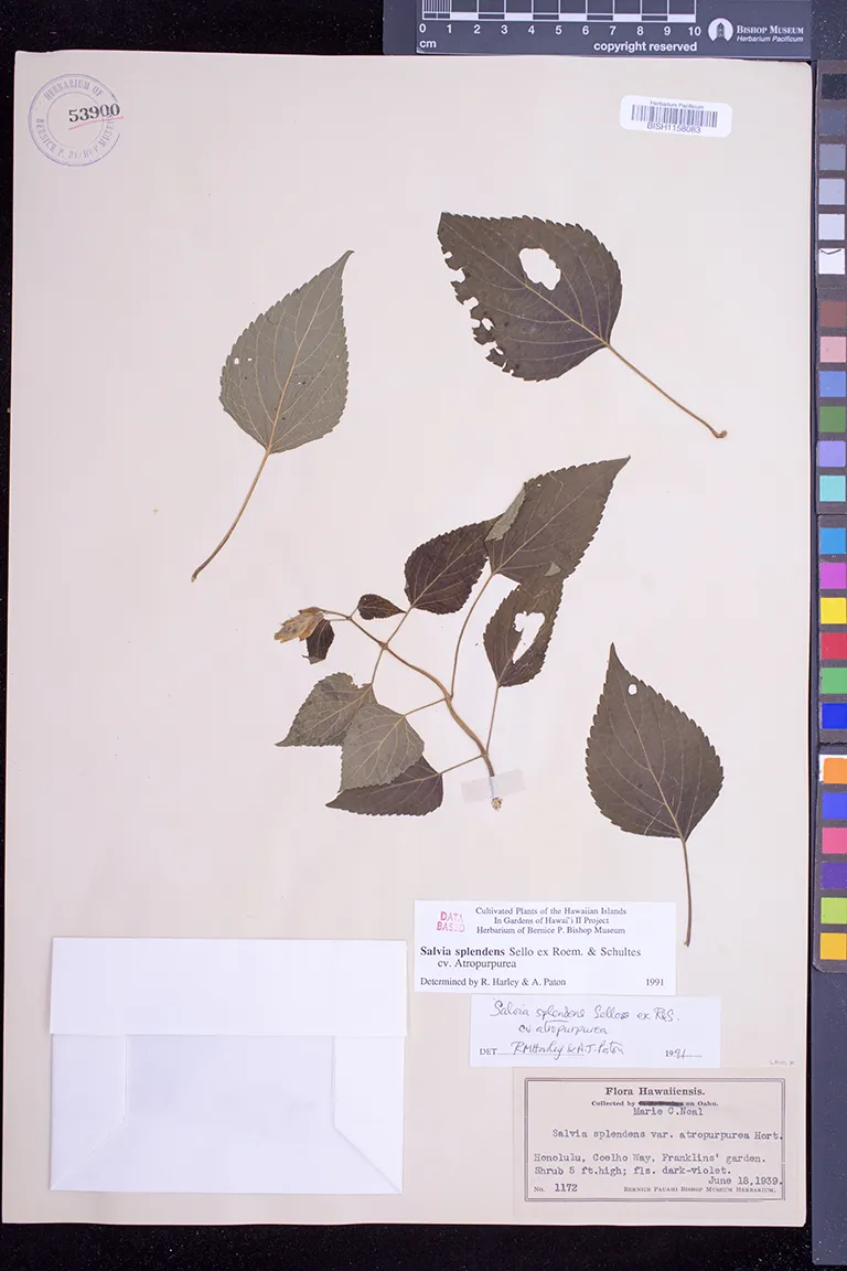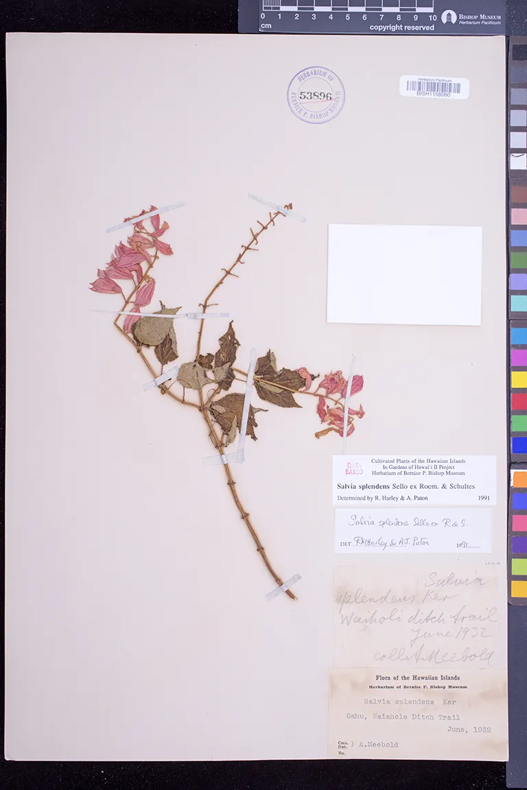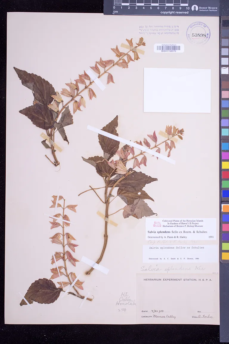 | 6 | Salvia splendens | Sellow ex Nees | honolulu, coelho way, franklins' garden | PRESERVED_SPECIMEN | neal, m.c. | collector number: 1172 | Oahu | BISH | 6/18/1939 | |
