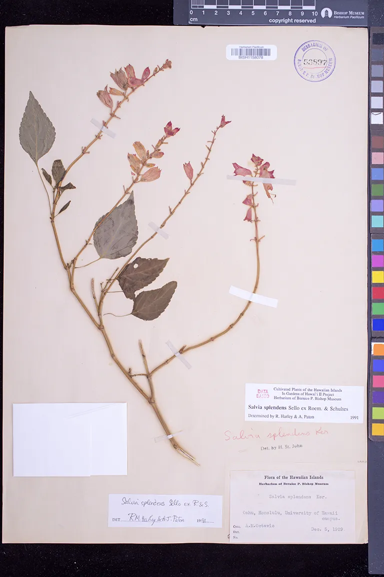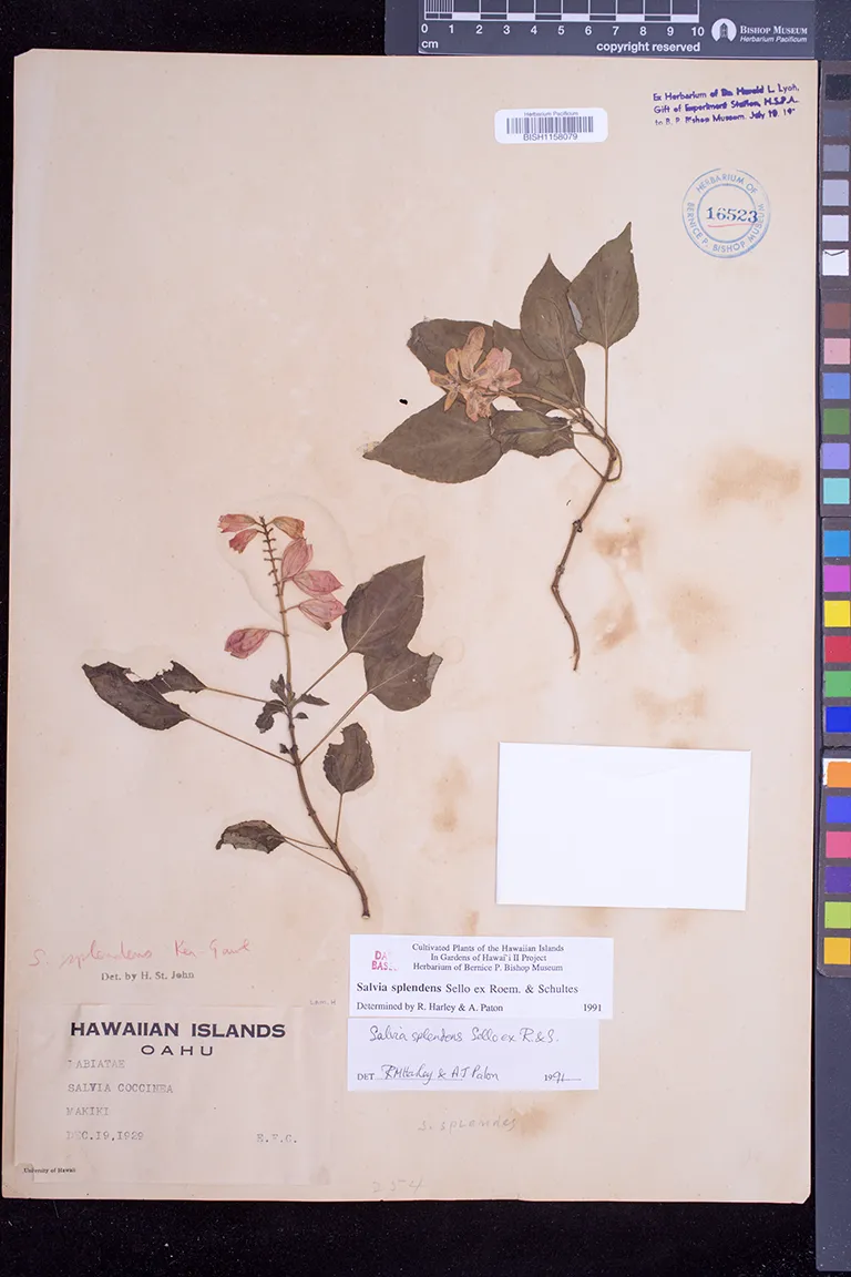 | 13 | Salvia splendens | Sellow ex Nees | makiki | PRESERVED_SPECIMEN | caum, e.l. | Oahu | BISH | 12/19/1929 | ||