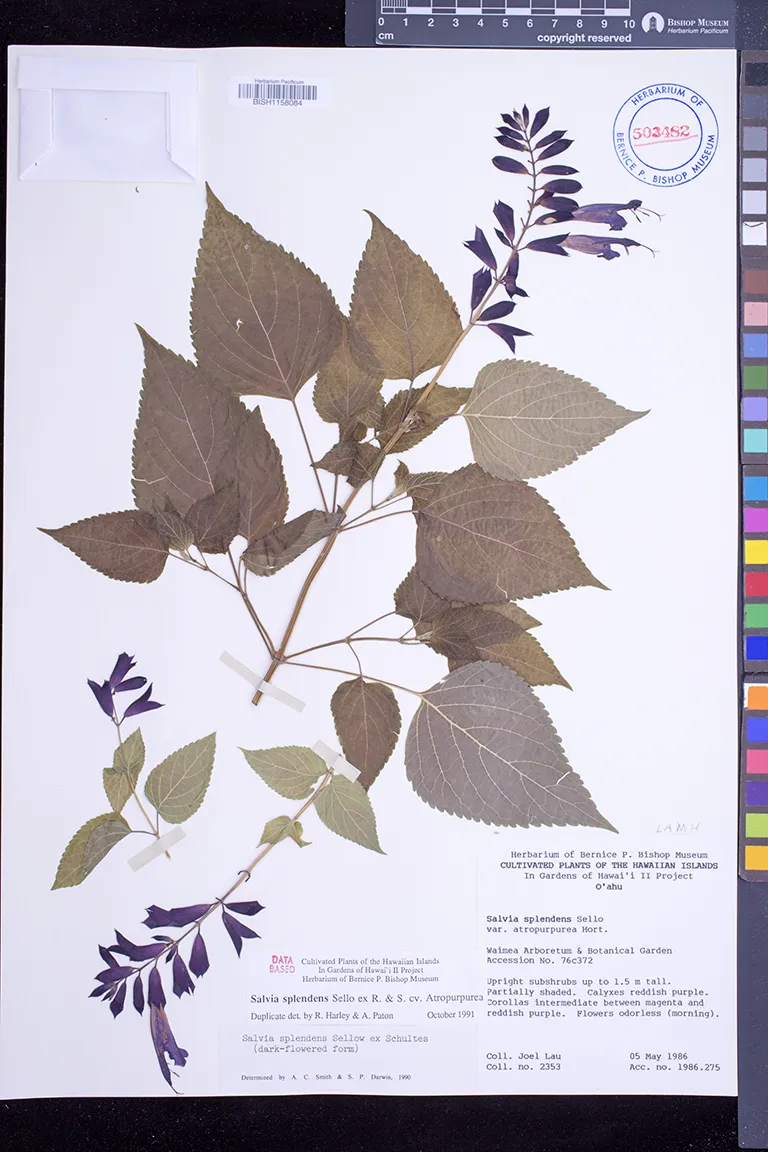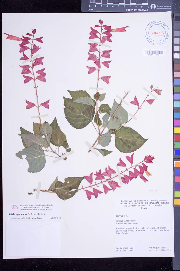 | 14 | Salvia splendens | Sellow ex Nees | waimea arboretum & botanical garden | PRESERVED_SPECIMEN | lau, j. | collector number: 2353 | Oahu | BISH | 5/5/1986 | |