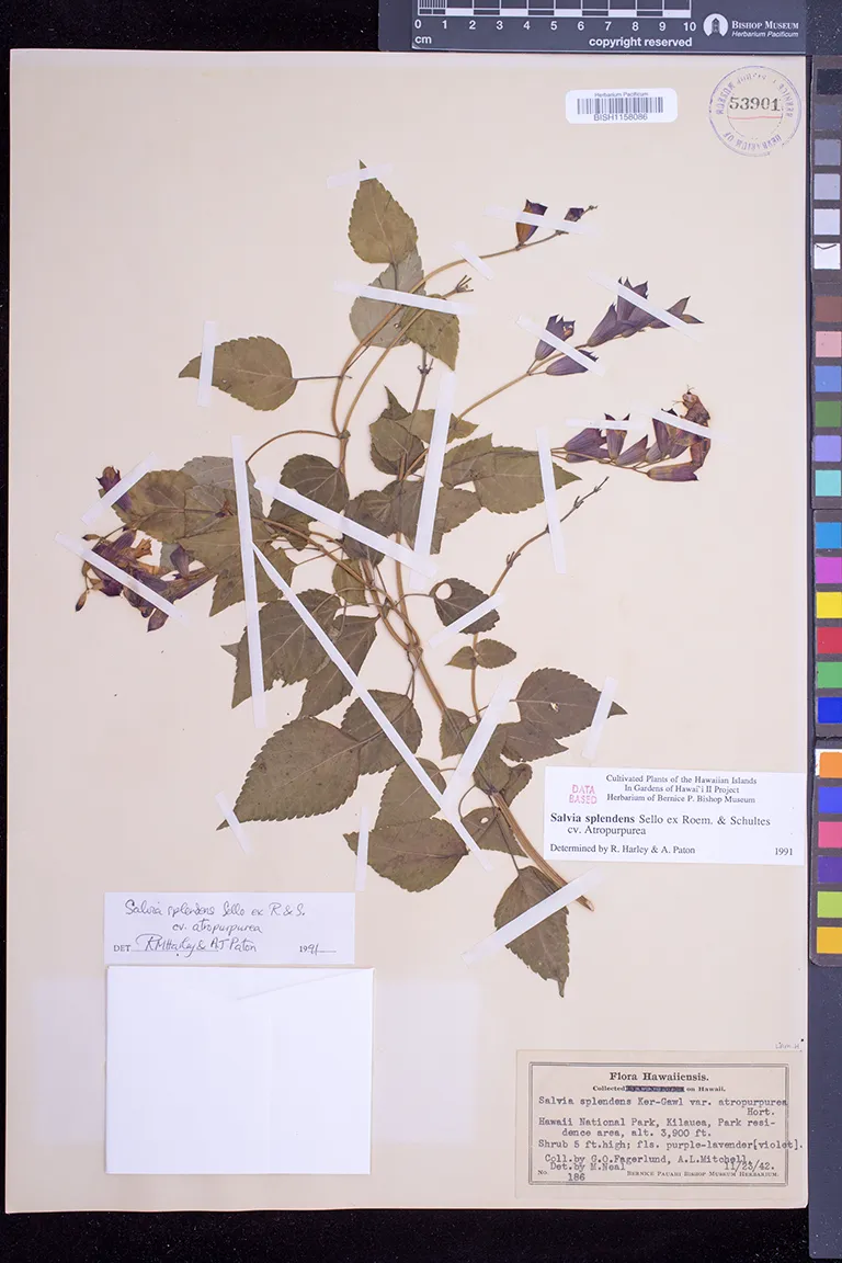 | 2 | Salvia splendens | Sellow ex Nees | Hawaii National Park, Kilauea, Park residence area | PRESERVED_SPECIMEN | Fagerlund, G.O. | 186 | Hawaii | BISH | 11/23/1942 | |