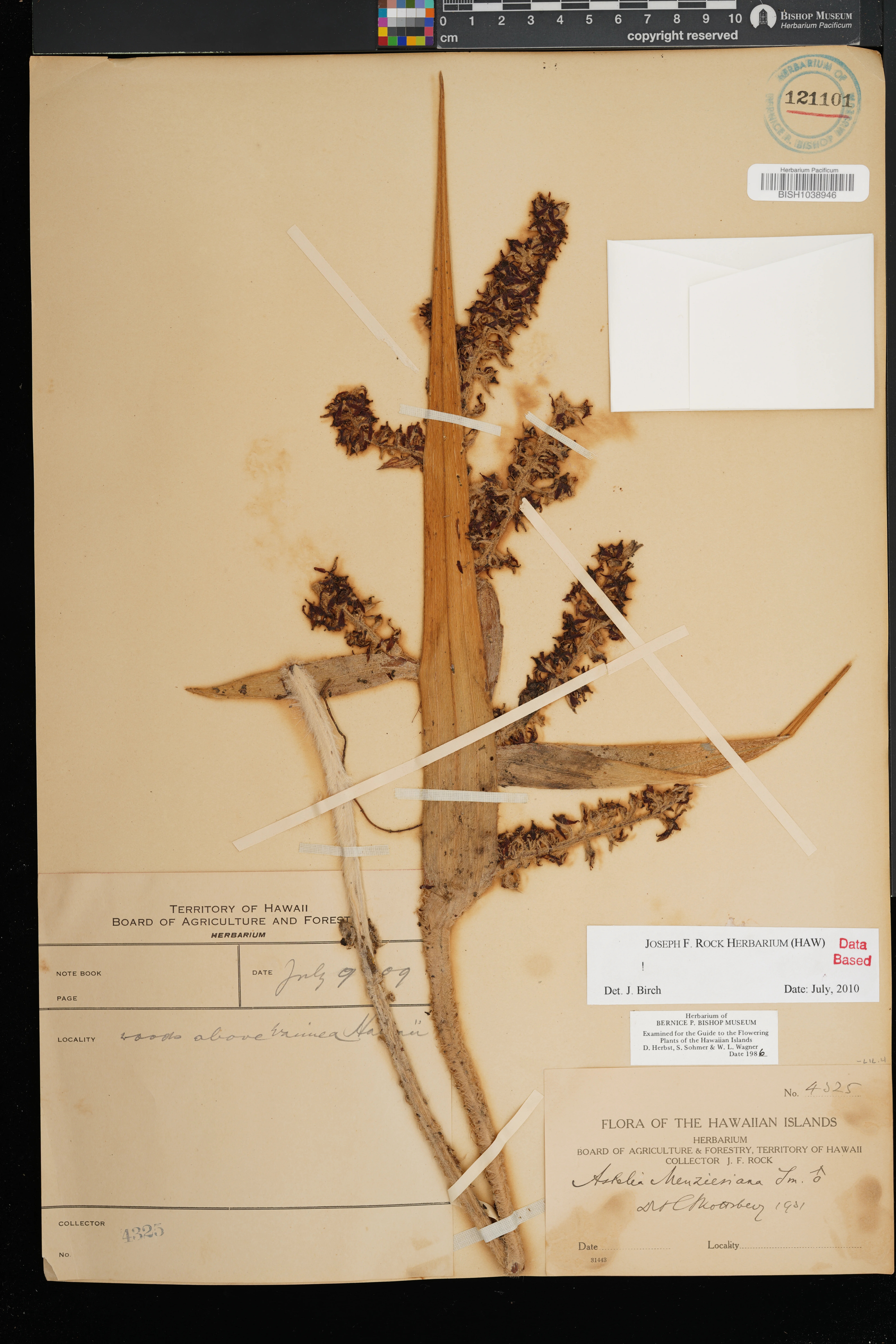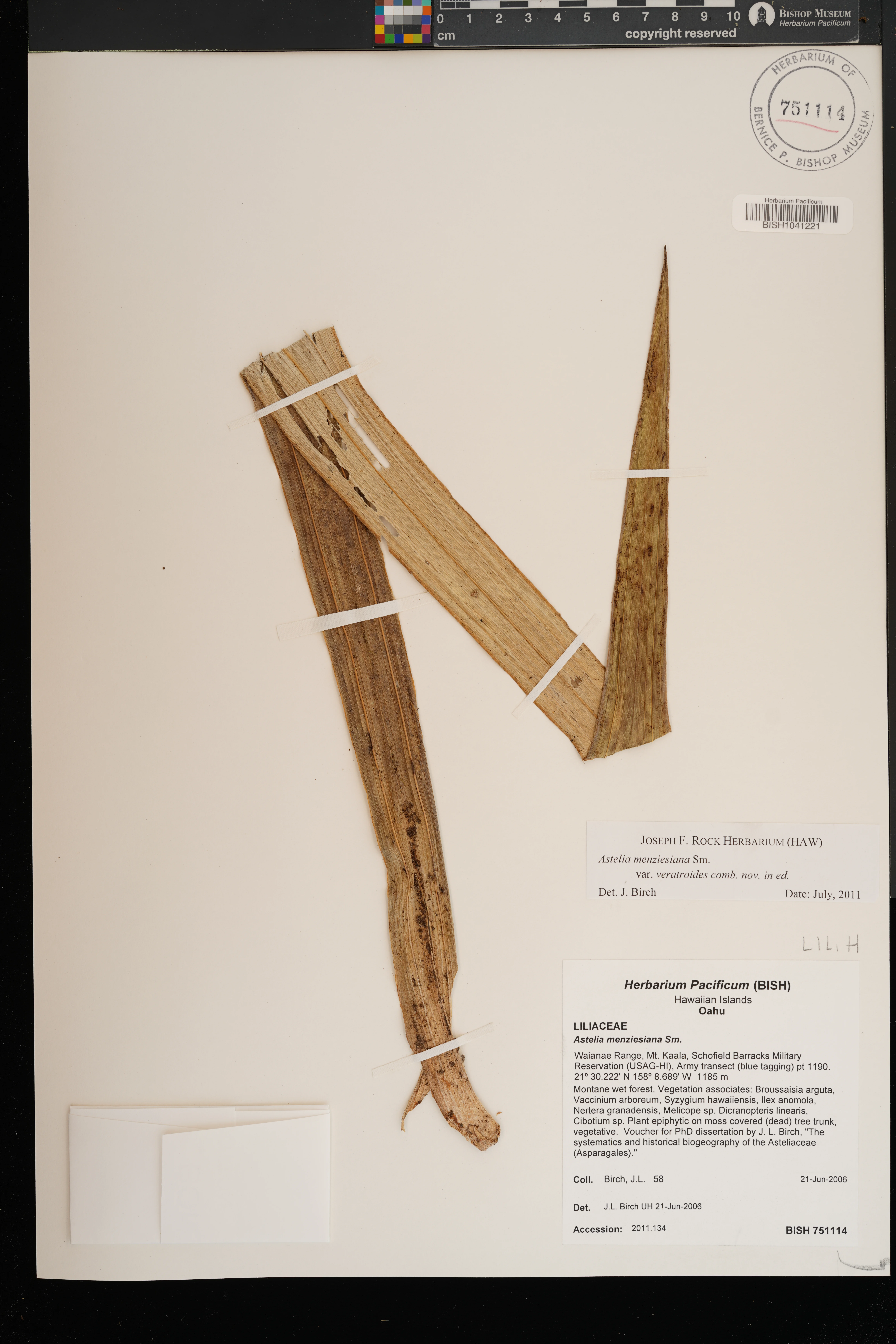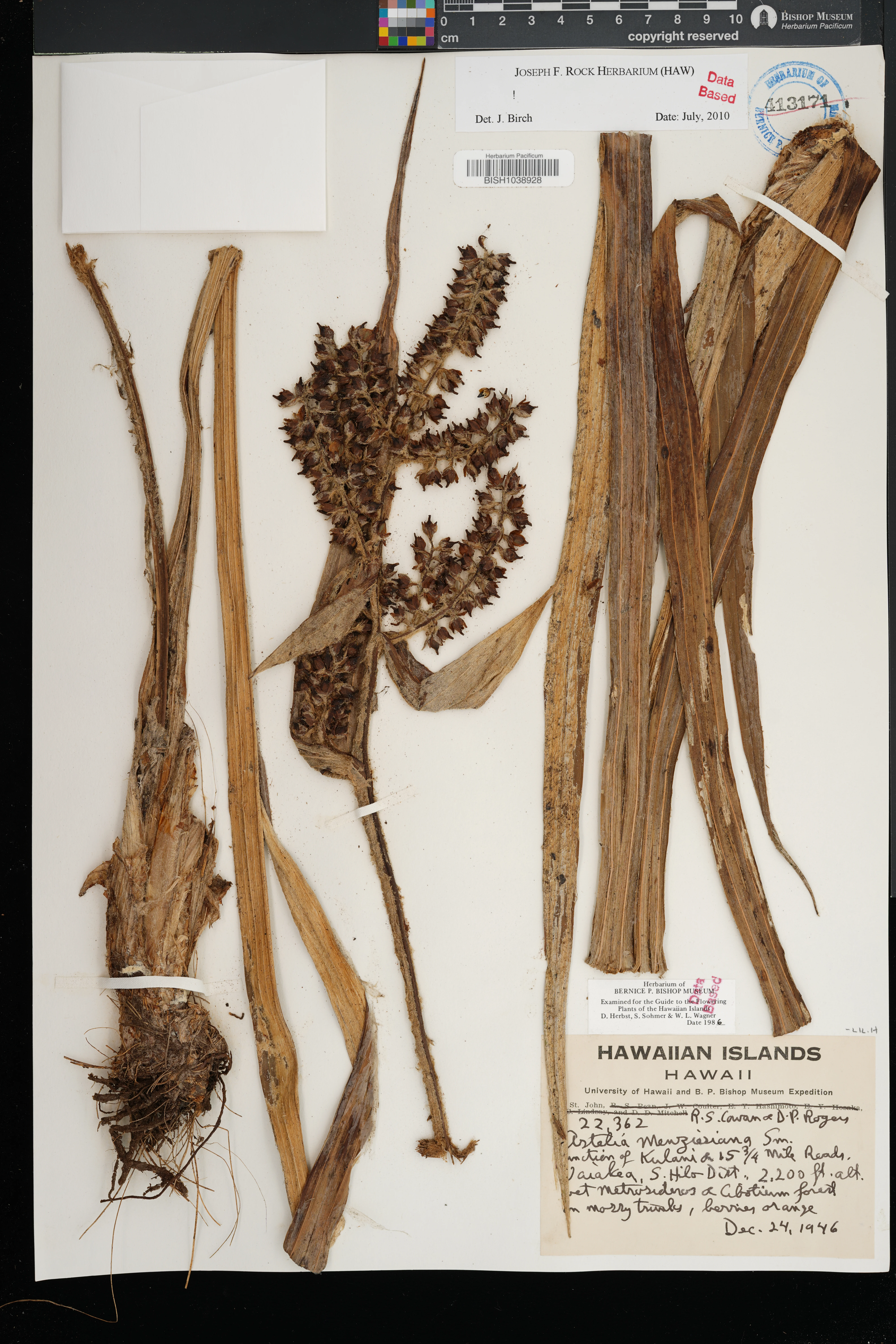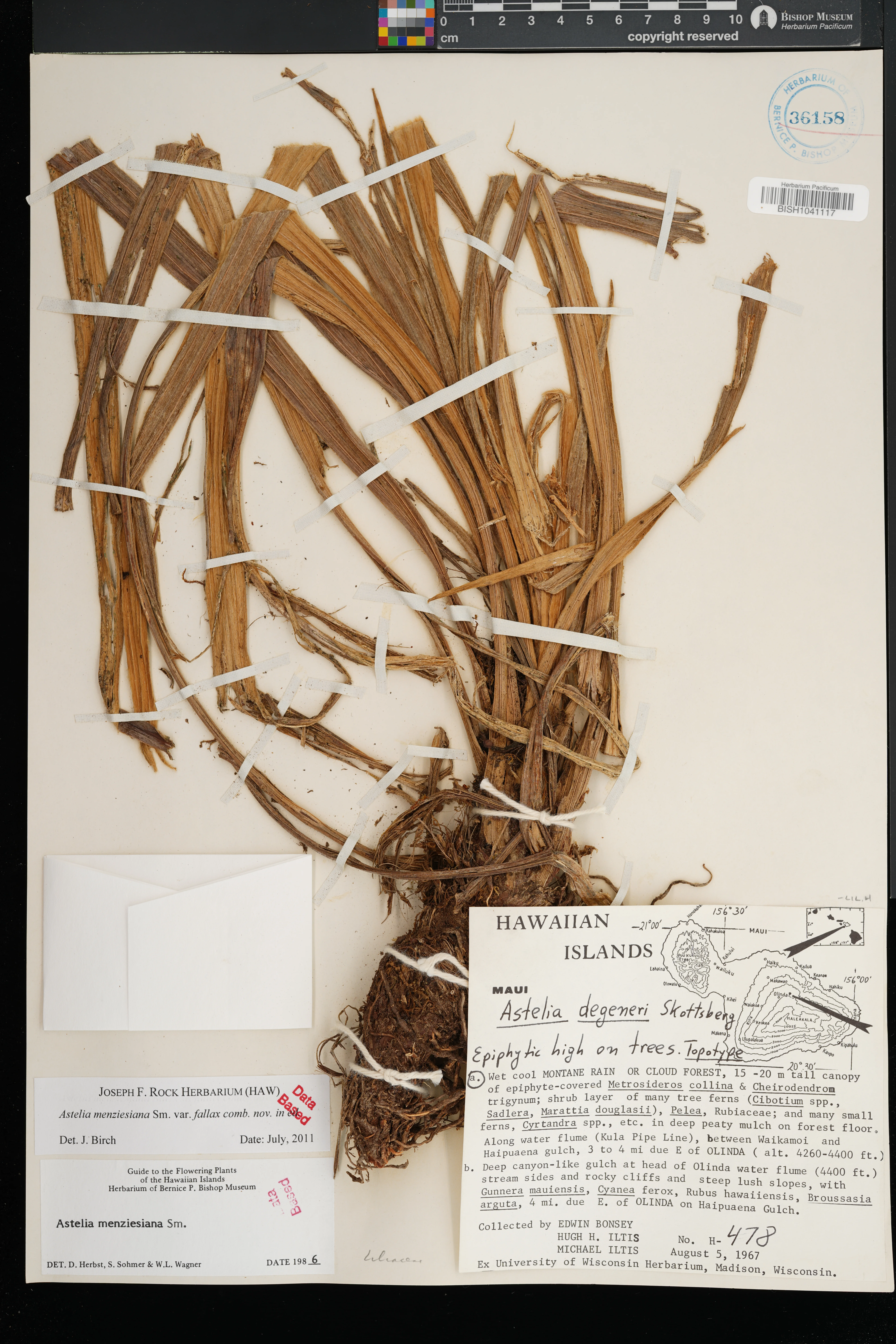 Growing with Viola robusta, Adenophorus, and Peperomia. Closed Metrosideros forest with Broussaisia, Cibotium, Cheirodendron, Ilex, and Cyrtandra. |