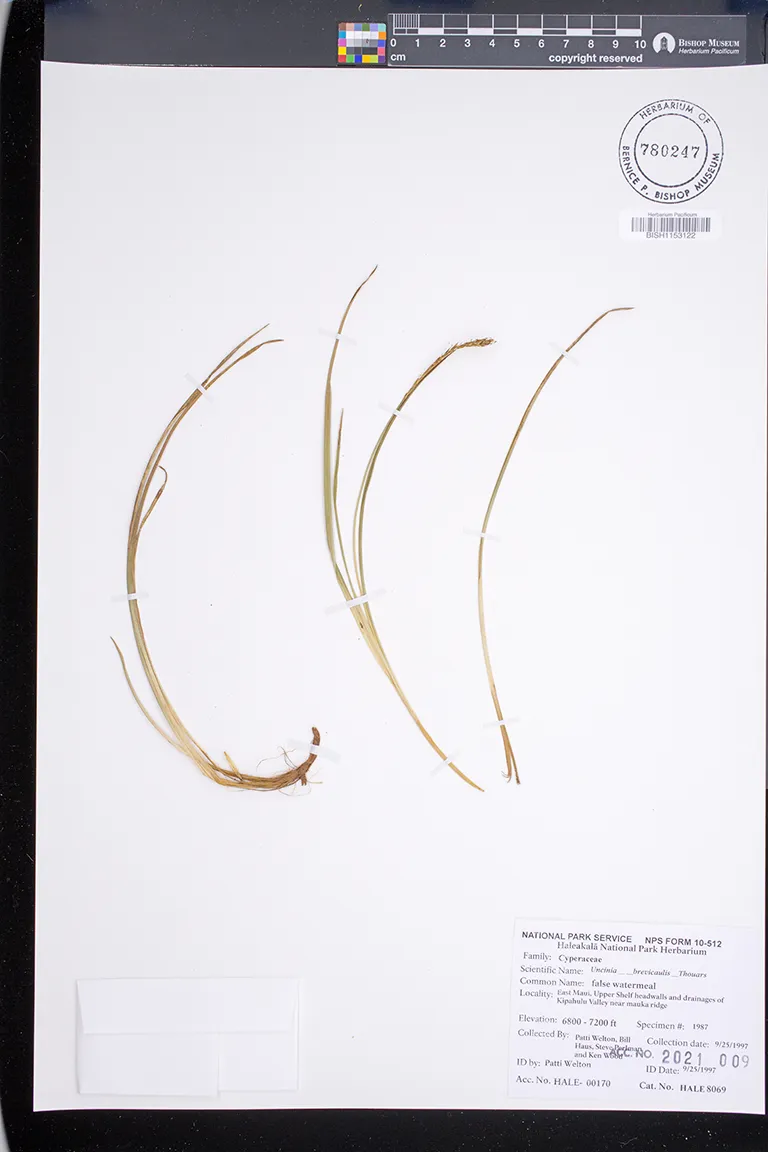 7 Carex brevicaulis Thouars Kipahulu valley, National Park lands, Puu Alaea region and ridge up to summit of Pohaku Palaha and Lauulu. Deschampsia nubigena subalpine mesic grassland with forest patches on steep slopes, and headwater riparian zones. PRESERVED_SPECIMEN K. R. Wood 6787 Maui PTBG 9/26/1997