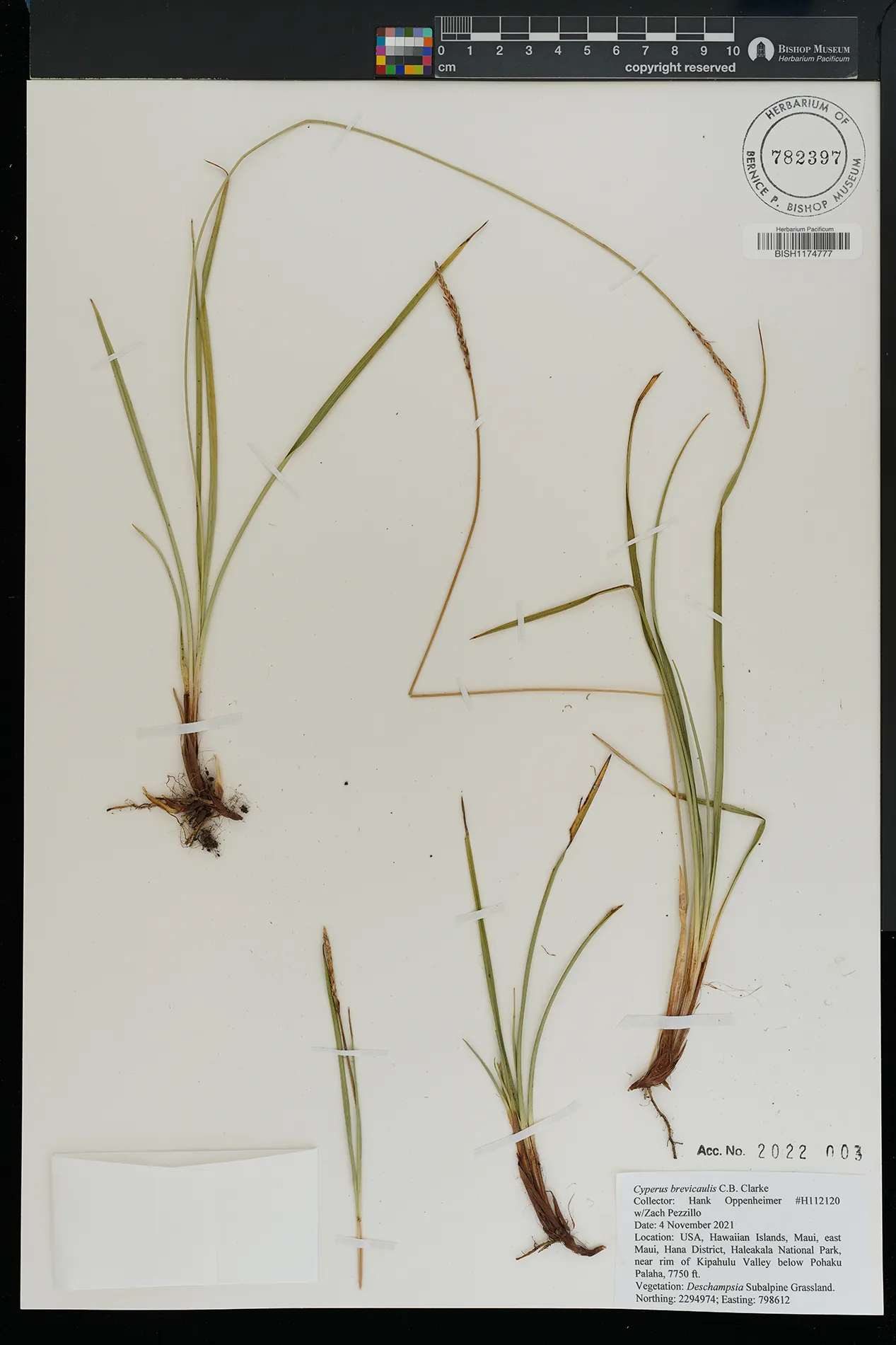 3 Carex brevicaulis Thouars Oili Puu off Halemauu Trail, National Park lands. Deschampsia nubigena subalpine mesic grassland and forested gulches. In subalpine grassland. PRESERVED_SPECIMEN K. R. Wood 6748 Maui PTBG 9/24/1997