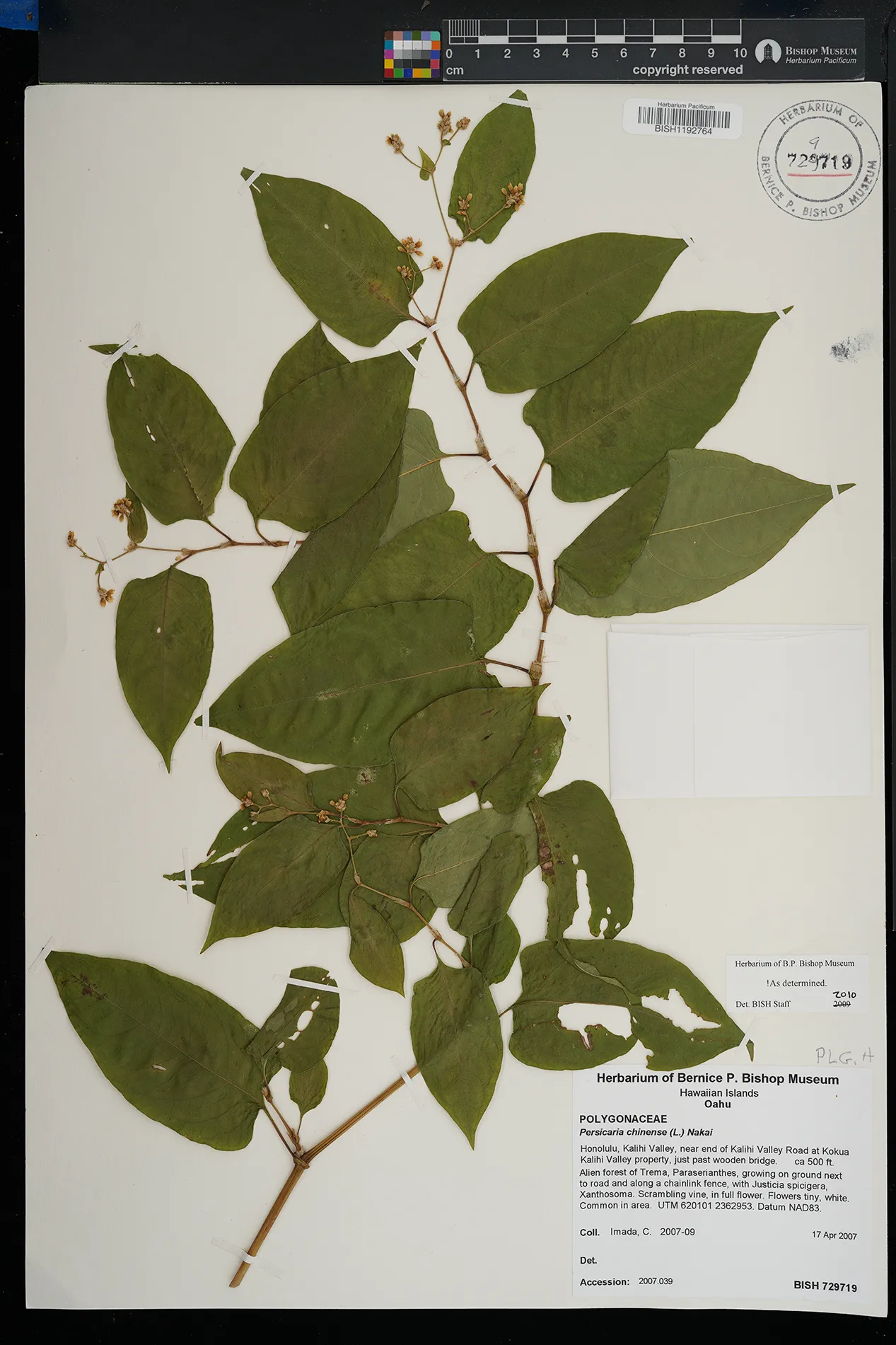 6 Persicaria chinensis (L.) H.Gross Honolulu, Kalihi Valley, near end of Kalihi Valley Road at Kokua Kalihi Valley property, just past wooden bridge Alien forest of Trema, Paraserianthes, growing on ground next to road and along a chainlink fence, with Justicia spicigera, Xanthosoma. PRESERVED_SPECIMEN Imada, C.T. 2007-09 Oahu BISH 4/17/2007