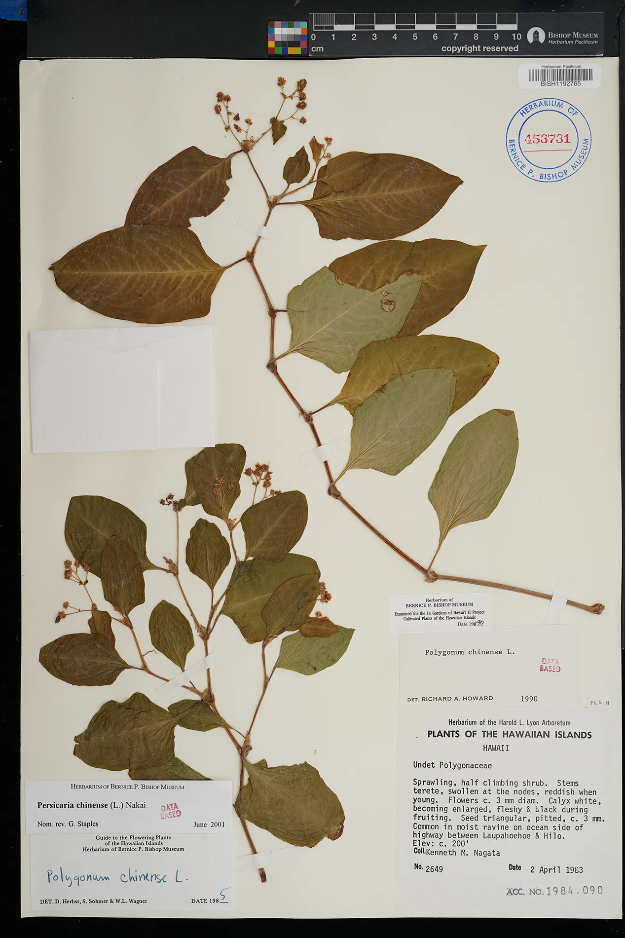 1 Persicaria chinensis (L.) H.Gross Makai side of hwy., between Laupahoehoe and Hilo in moist ravine PRESERVED_SPECIMEN Nagata, K.M. 2649 Hawaii BISH 4/2/1983