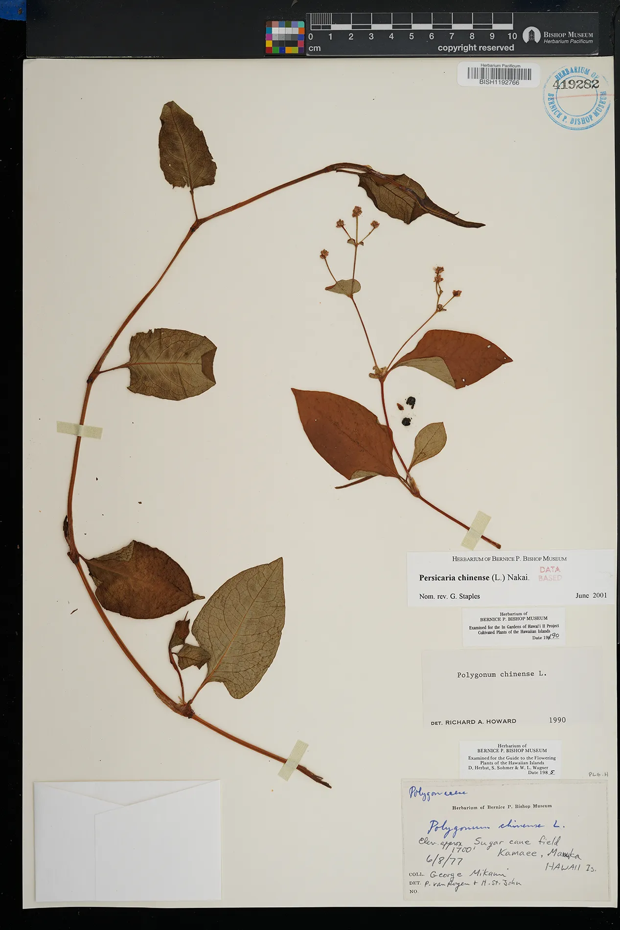2 Persicaria chinensis (L.) H.Gross Kamaee, Manuka sugar cane field PRESERVED_SPECIMEN Mikami, G. s.n. Hawaii BISH 6/8/1977