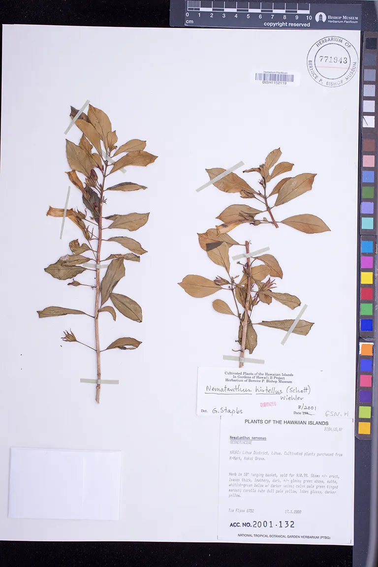 | 2 | Nematanthus fornix | (Vell.) Chautems | lihue, k-mart, kukui grove | PRESERVED_SPECIMEN | flynn, t. | collector number: 6752 | Kauai | BISH | 10/17/2000 | |