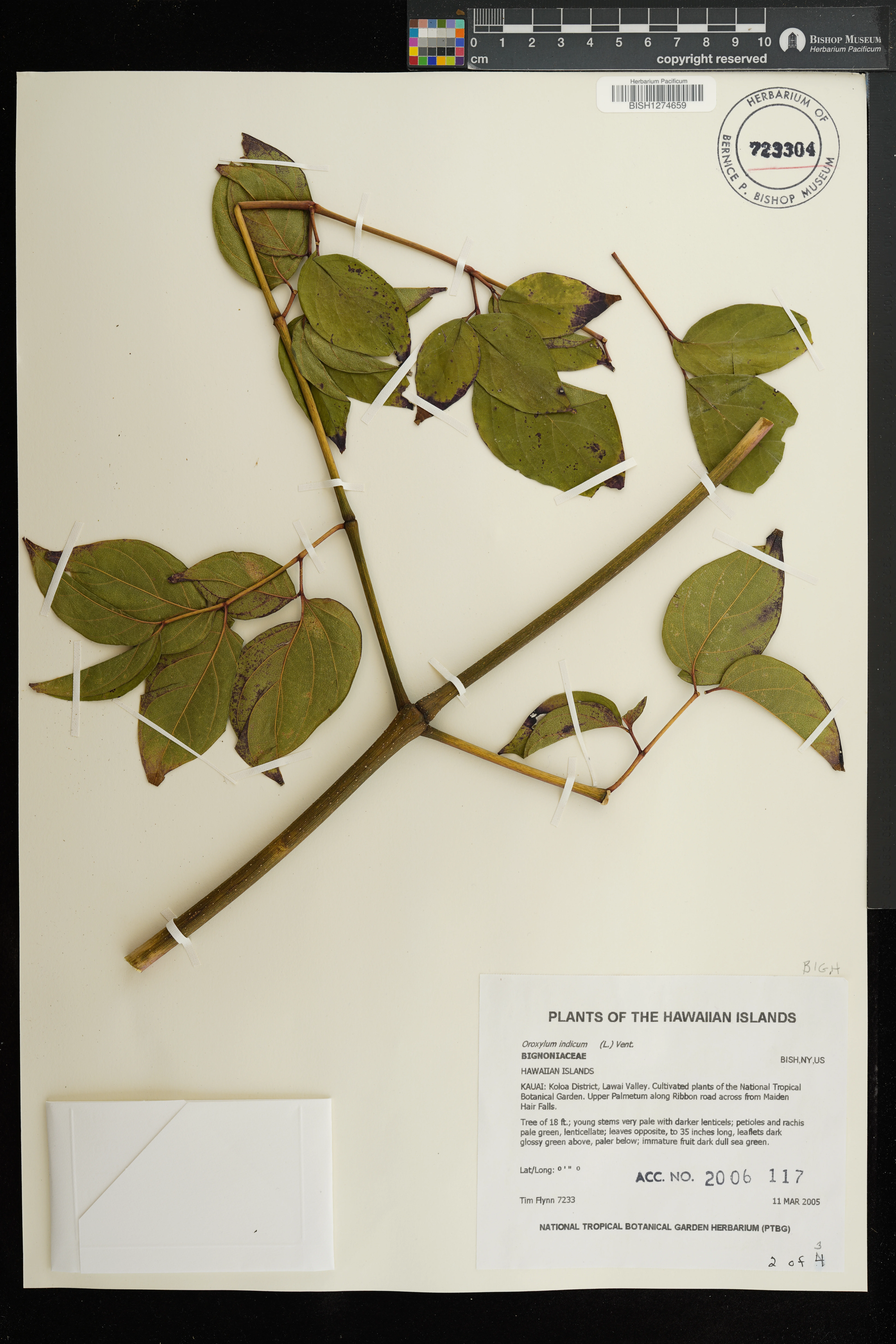 | 4 | Oroxylum indicum | (L.) Kurz | Lawai Valley. Cultivated plants of the National Tropical Botanical Garden. Upper Palmetum along Ribbon Road across from Maiden Hair Falls. | PRESERVED_SPECIMEN | Flynn, T. W. | 7233 - Sheet 2 | Kauai | US | 3/11/2005 | |