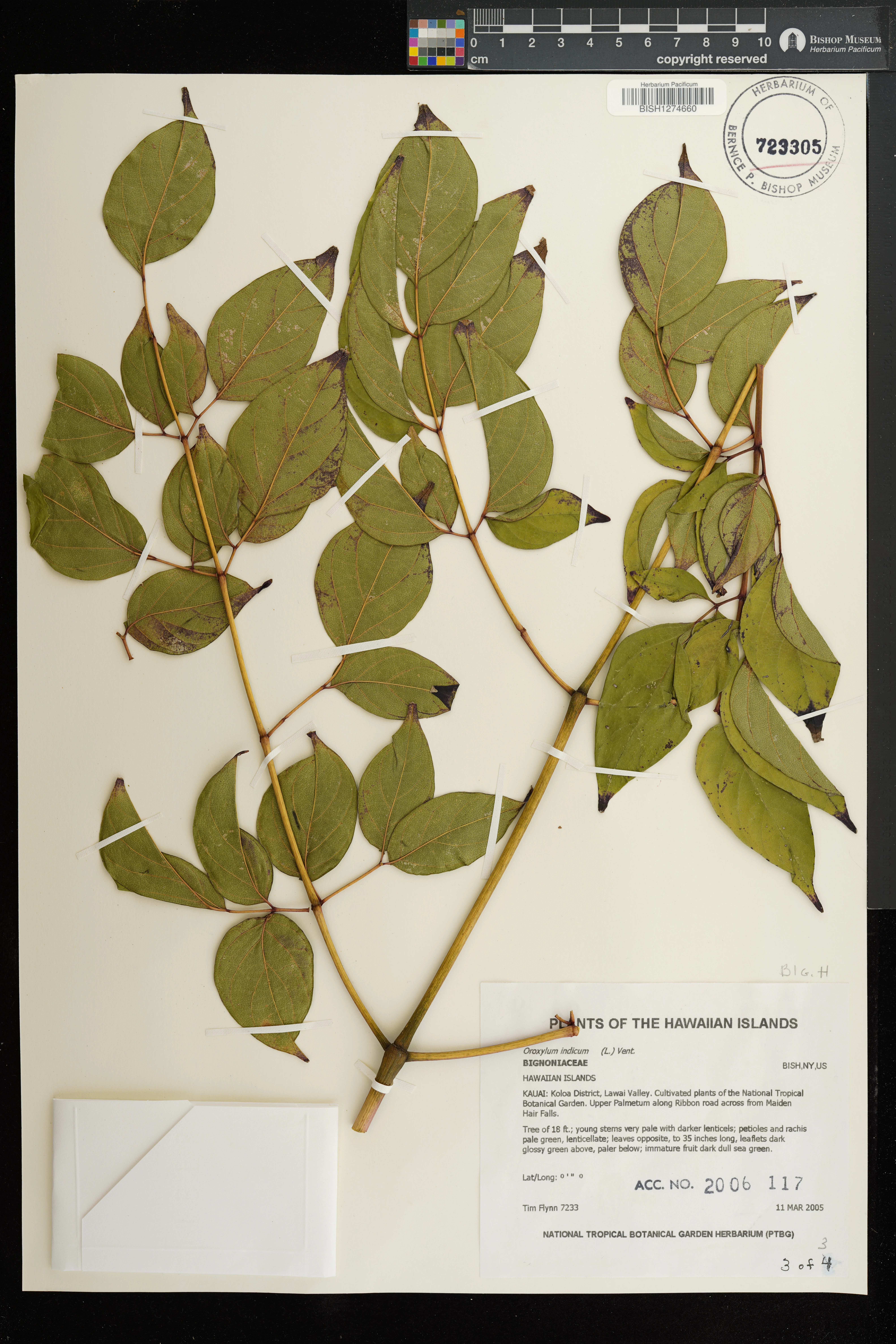| 6 | Oroxylum indicum | (L.) Kurz | Lawai Valley. Cultivated plants of the National Tropical Botanical Garden. Upper Palmetum along Ribbon road across from Maiden Hair Falls. | PRESERVED_SPECIMEN | Tim Flynn | 7233 | Kauai | PTBG | 3/11/2005 | |