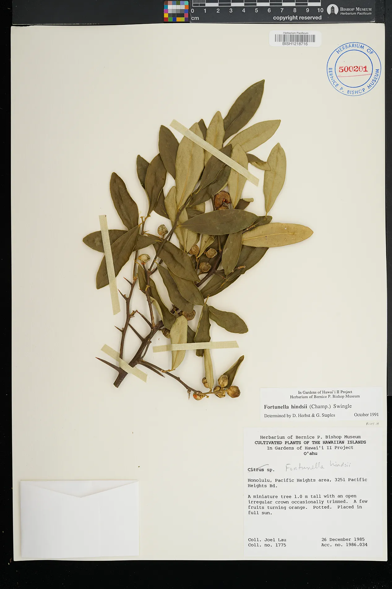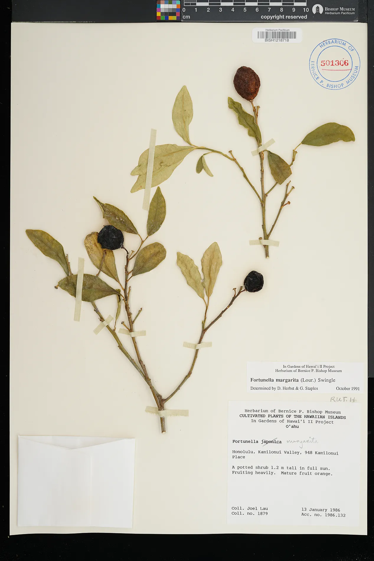 | 1 | Citrus japonica | Thunb. | kamilonui valley, 948 kamilonui place | Potted in full sun | PRESERVED_SPECIMEN | lau, j. | collector number: 1879 | Oahu | BISH | 1/13/1986 |