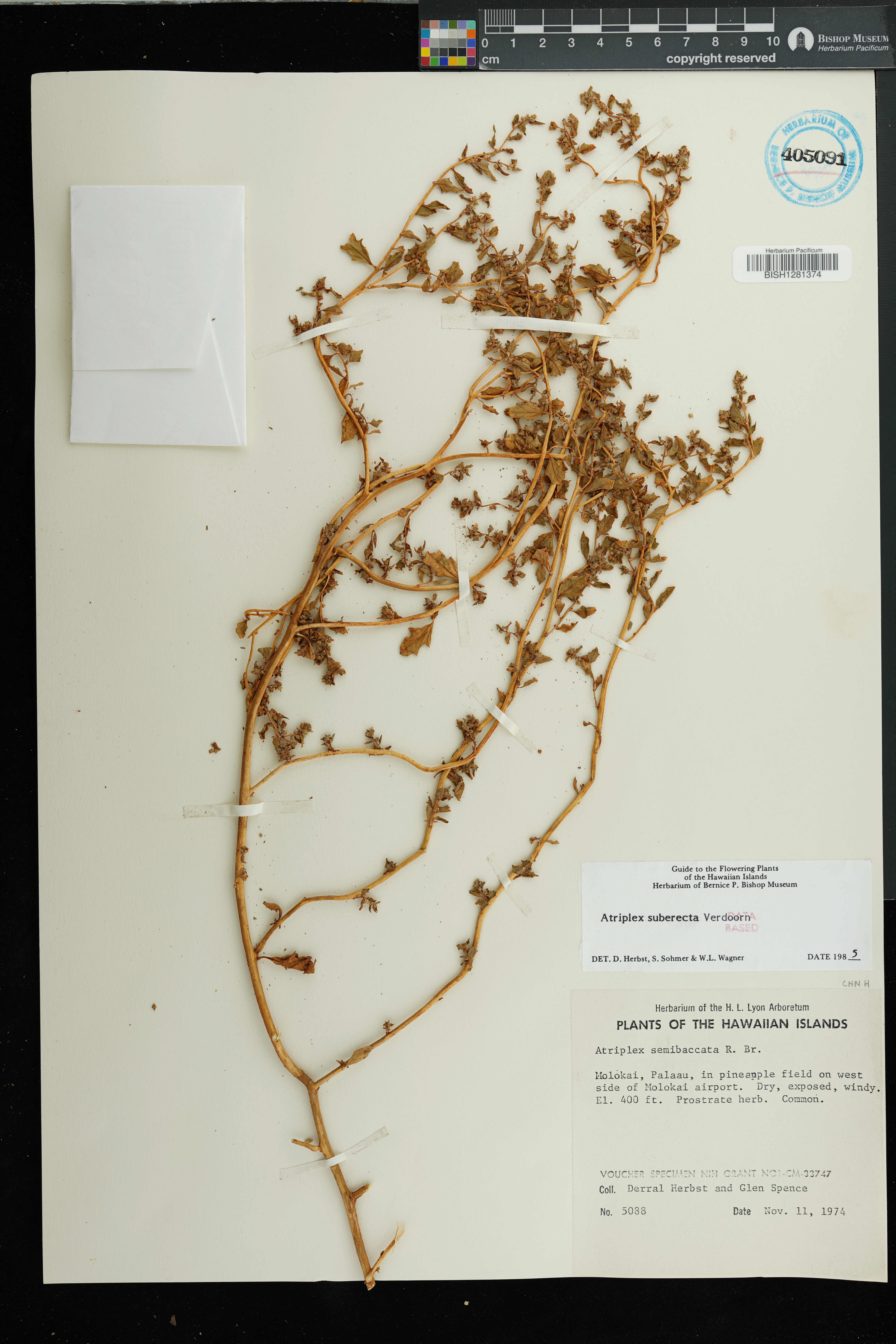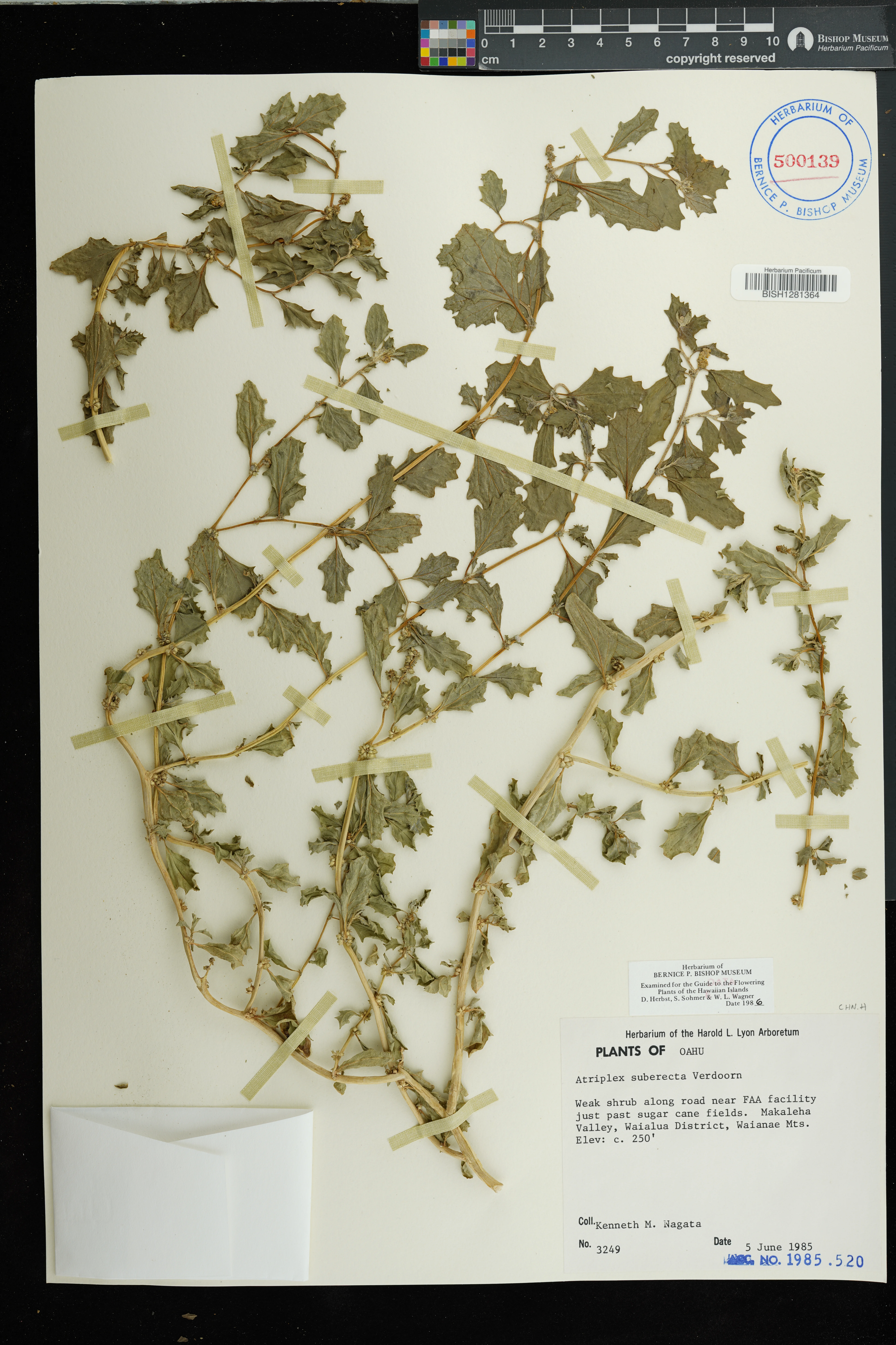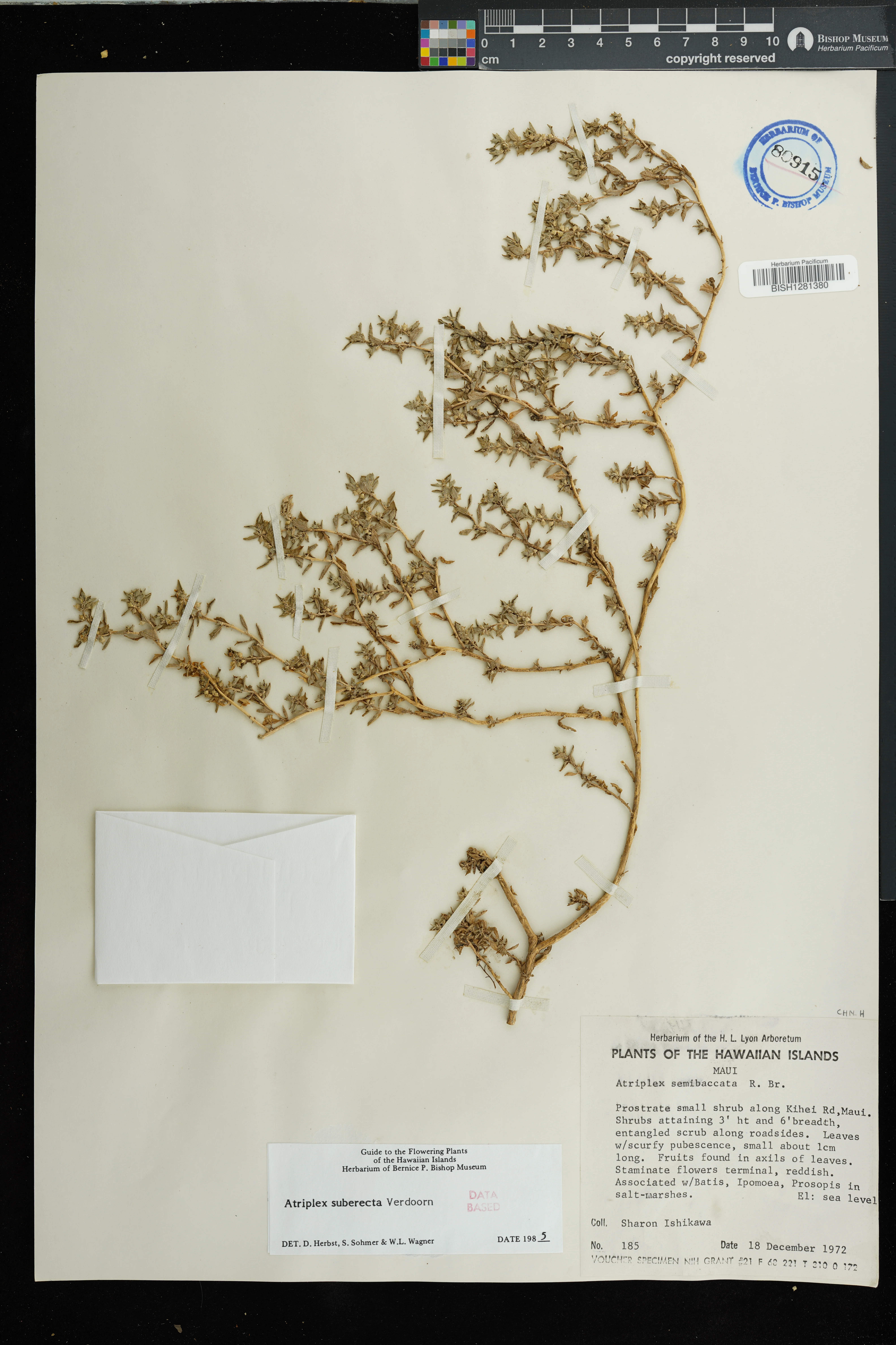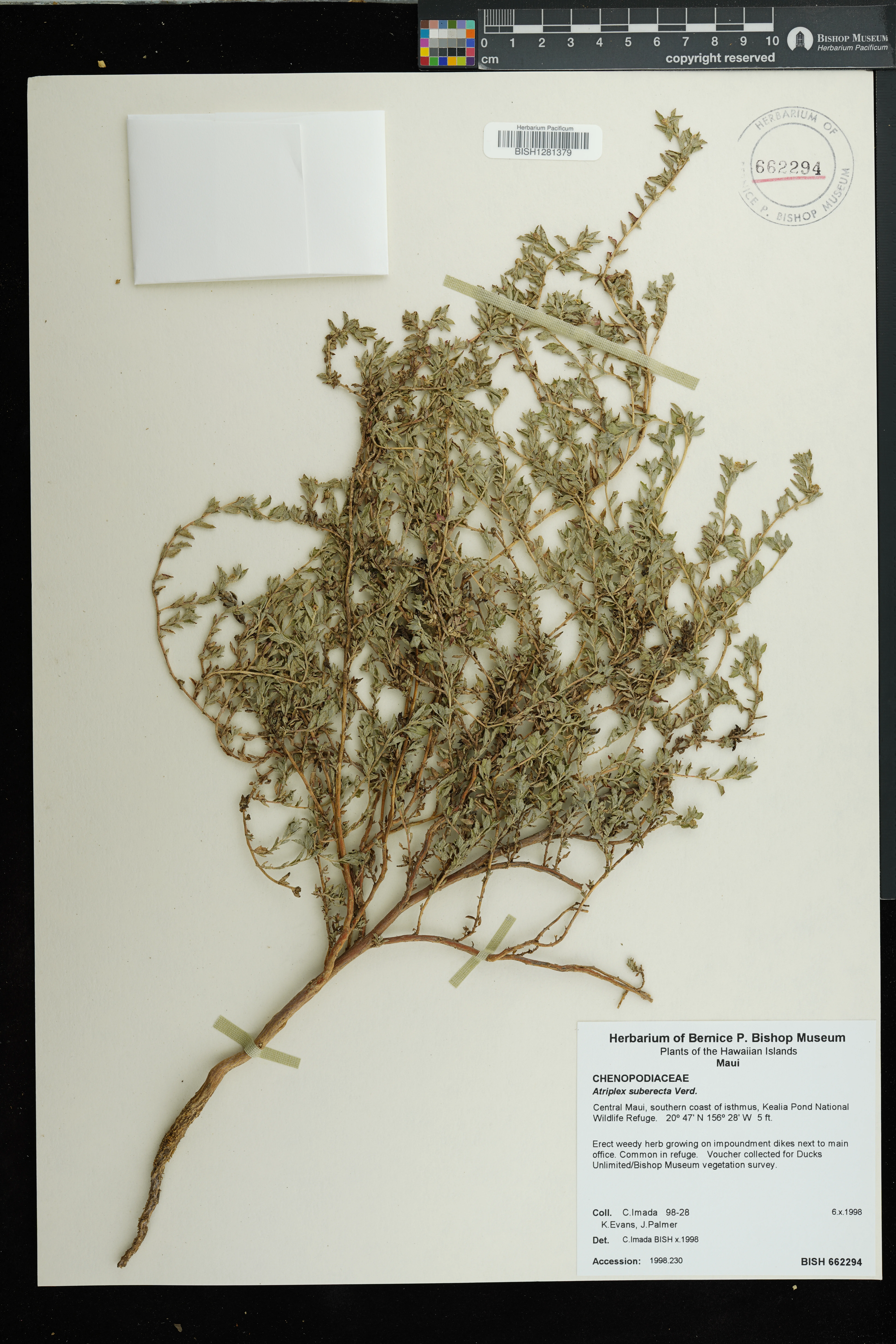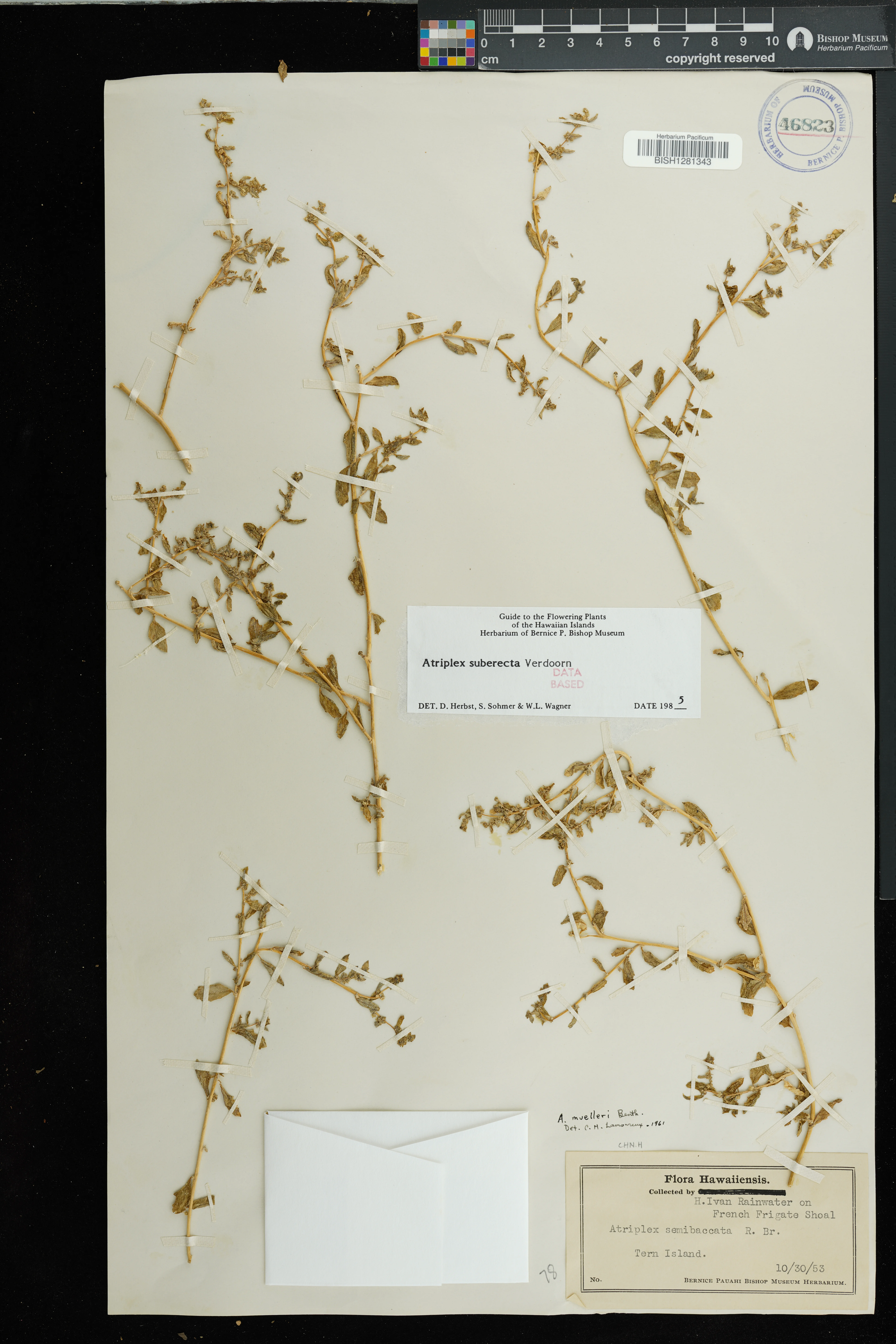 Naturalized small shrub, patchy in this area. Associated vegetation: Chenopodium oahuense, Ipomoea pes-caprae, Cocos nucifera, Tournefortia argentea, Chenopodium murale. |