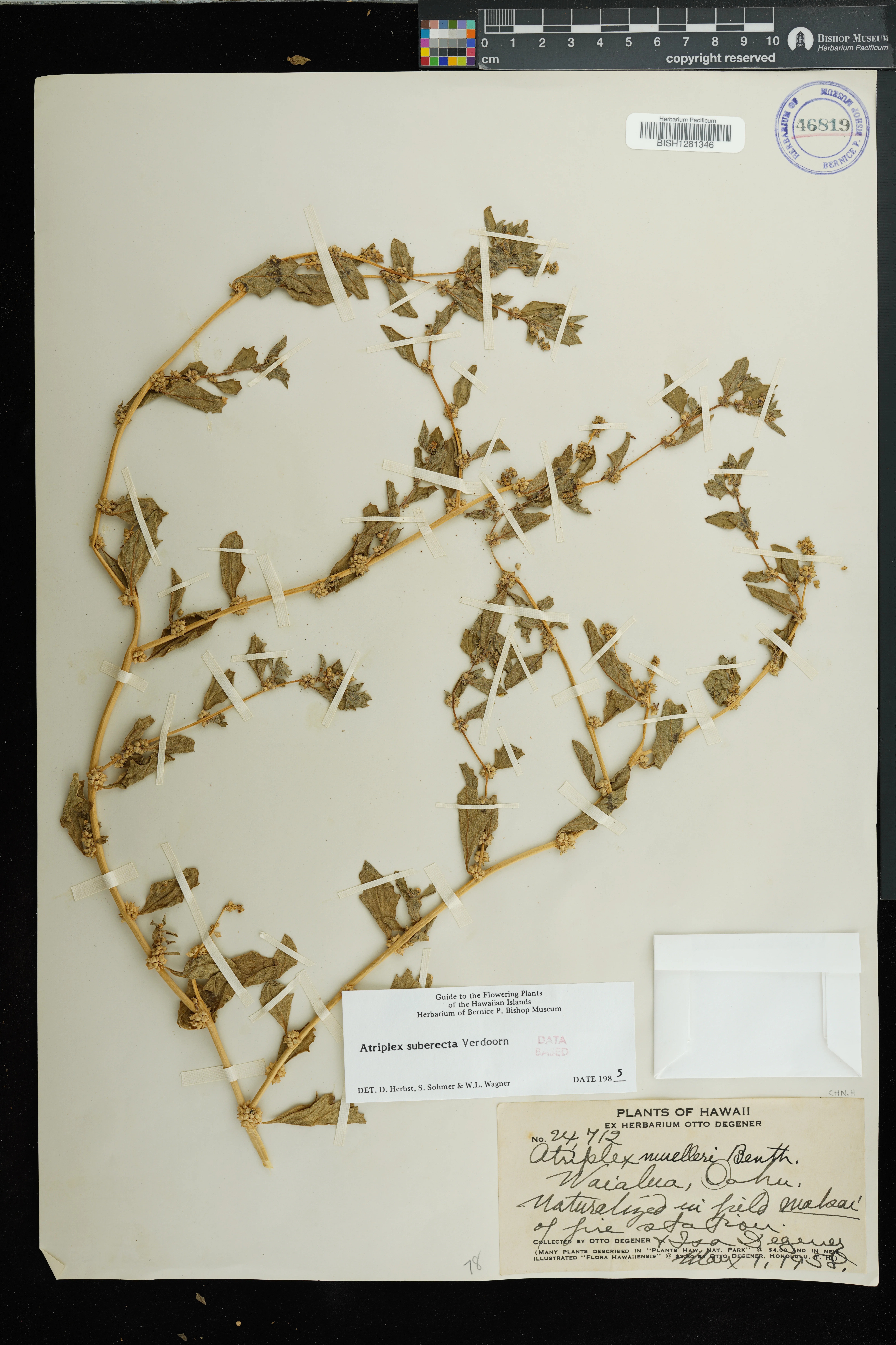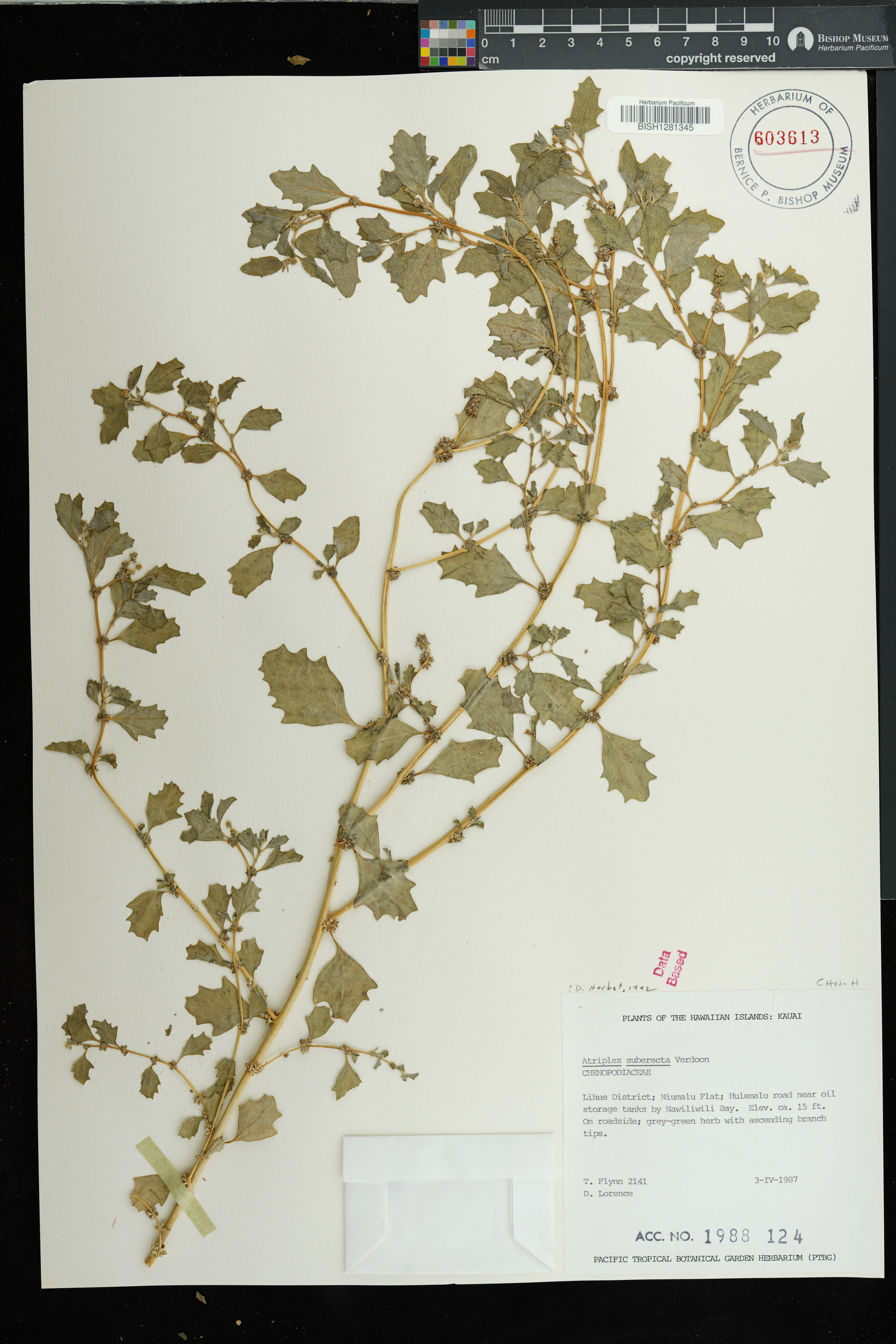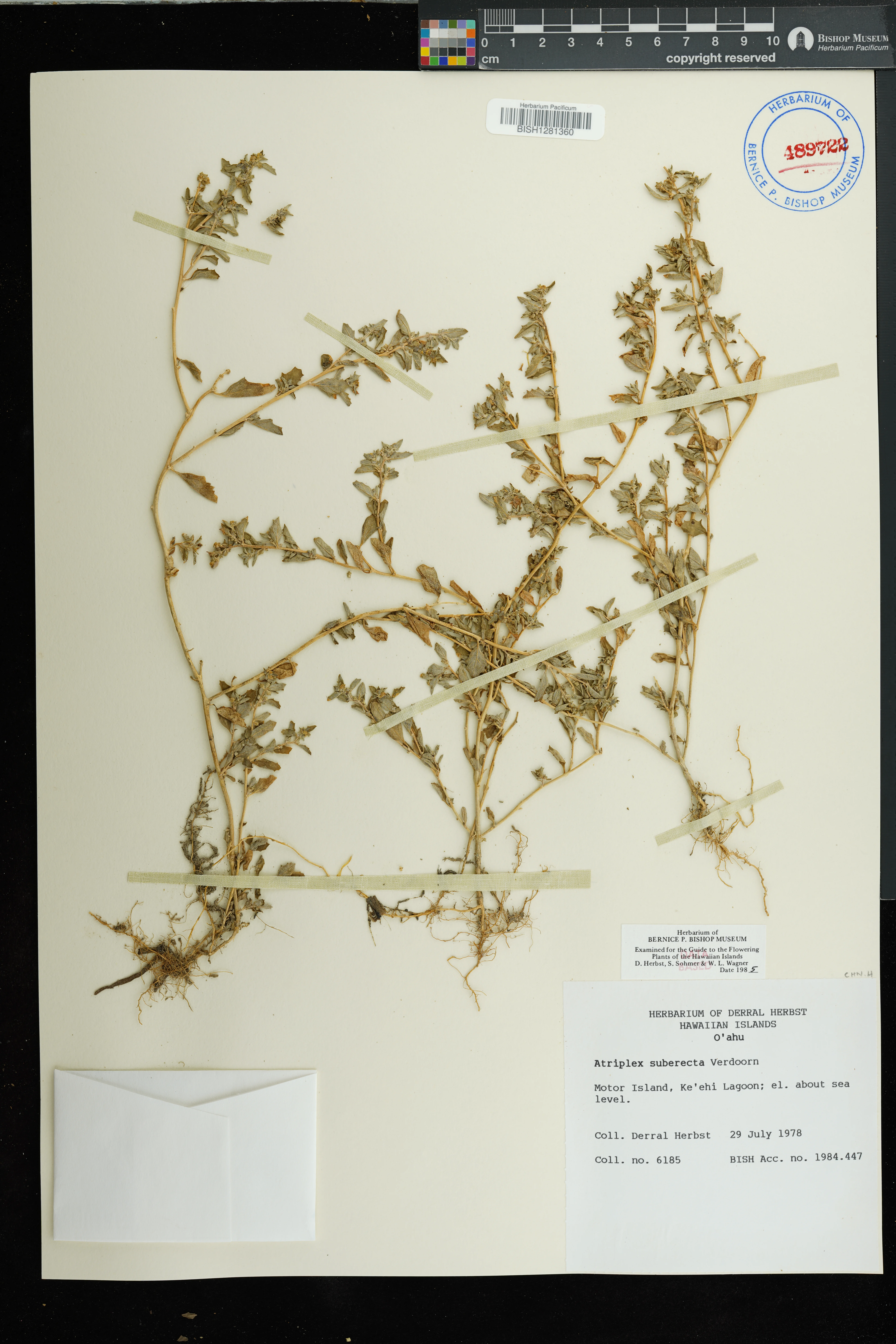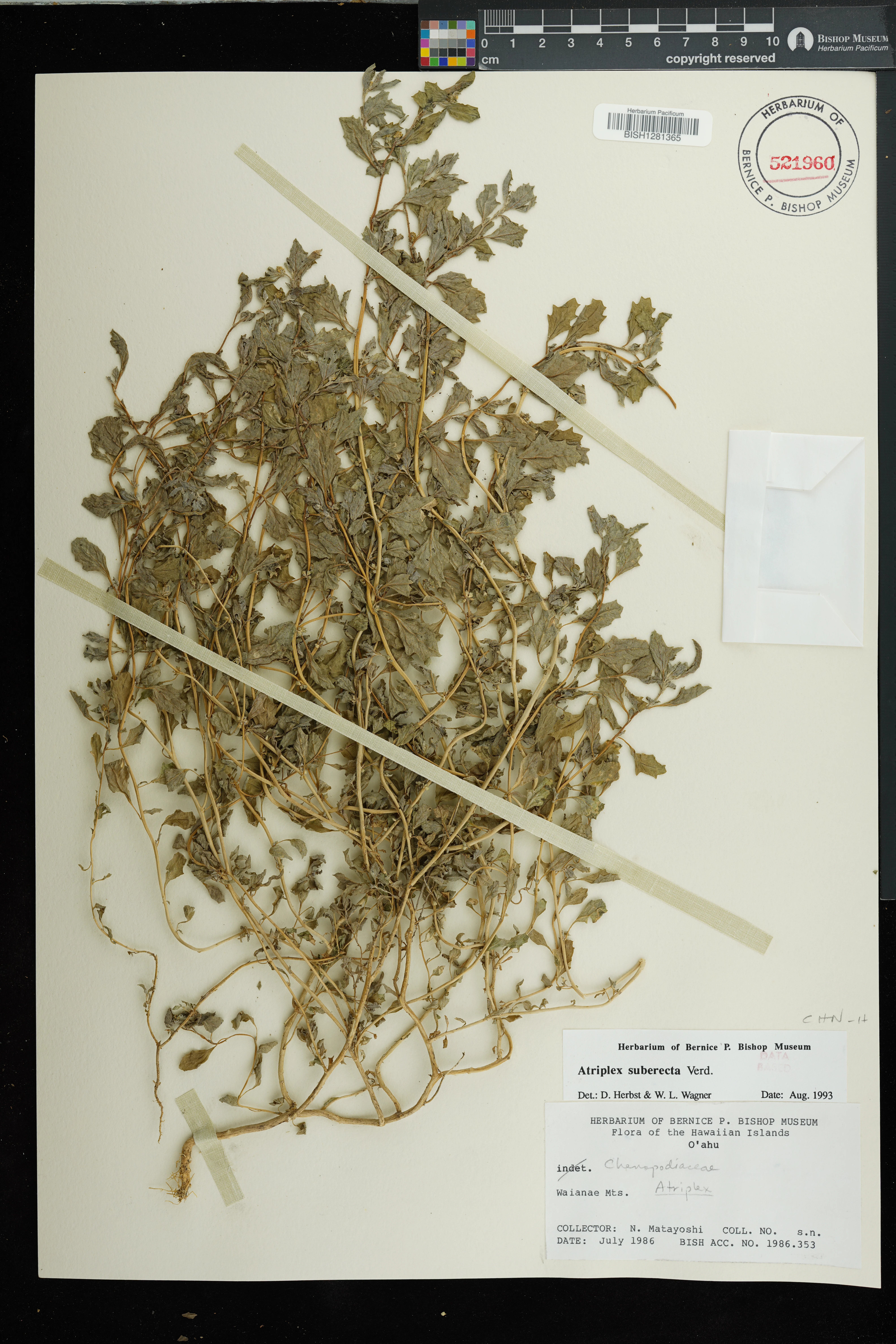 Naturalized small shrub, patchy in this area. Associated vegetation: Chenopodium oahuense, Ipomoea pes-caprae, Cocos nucifera, Tournefortia argentea, Chenopodium murale. |