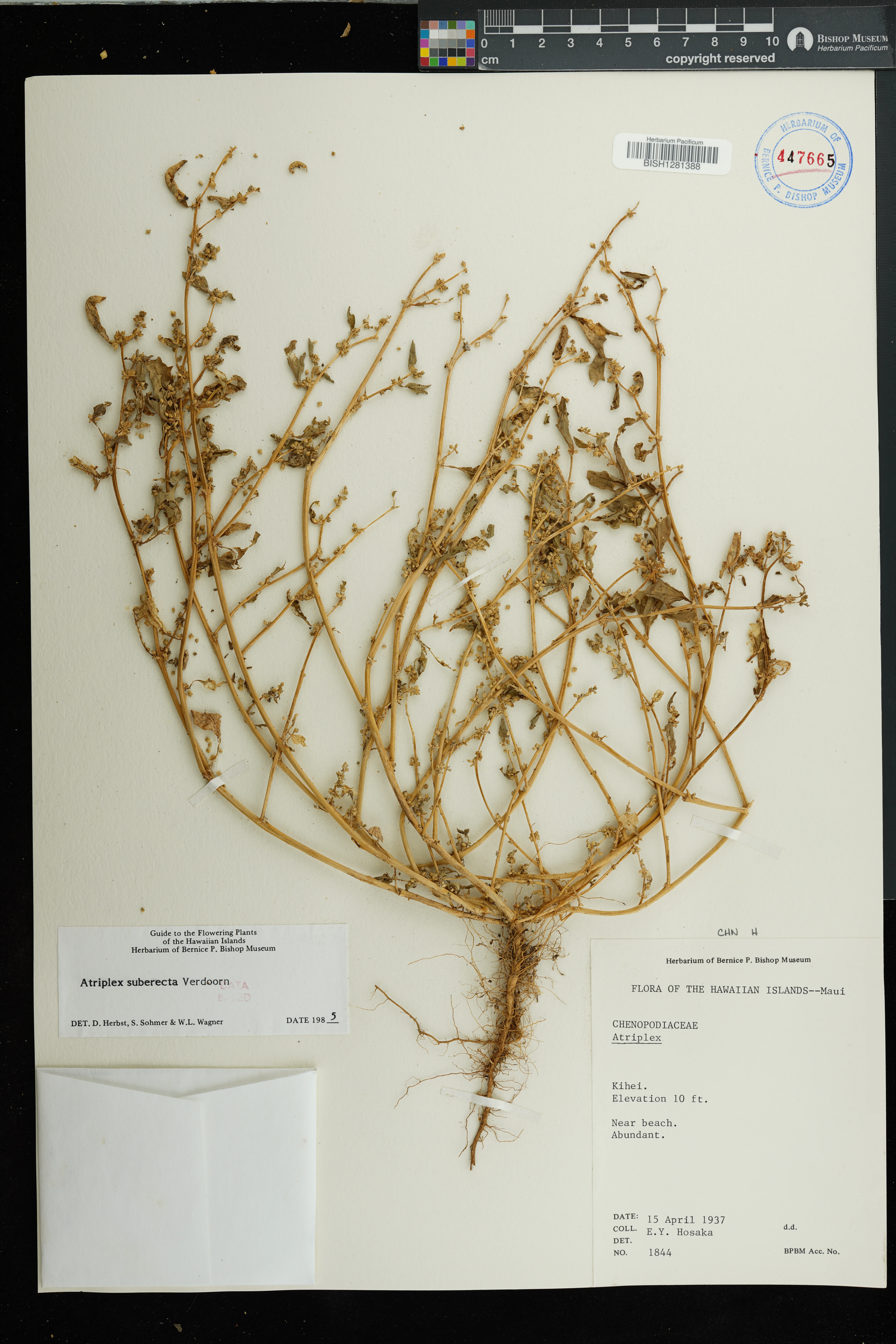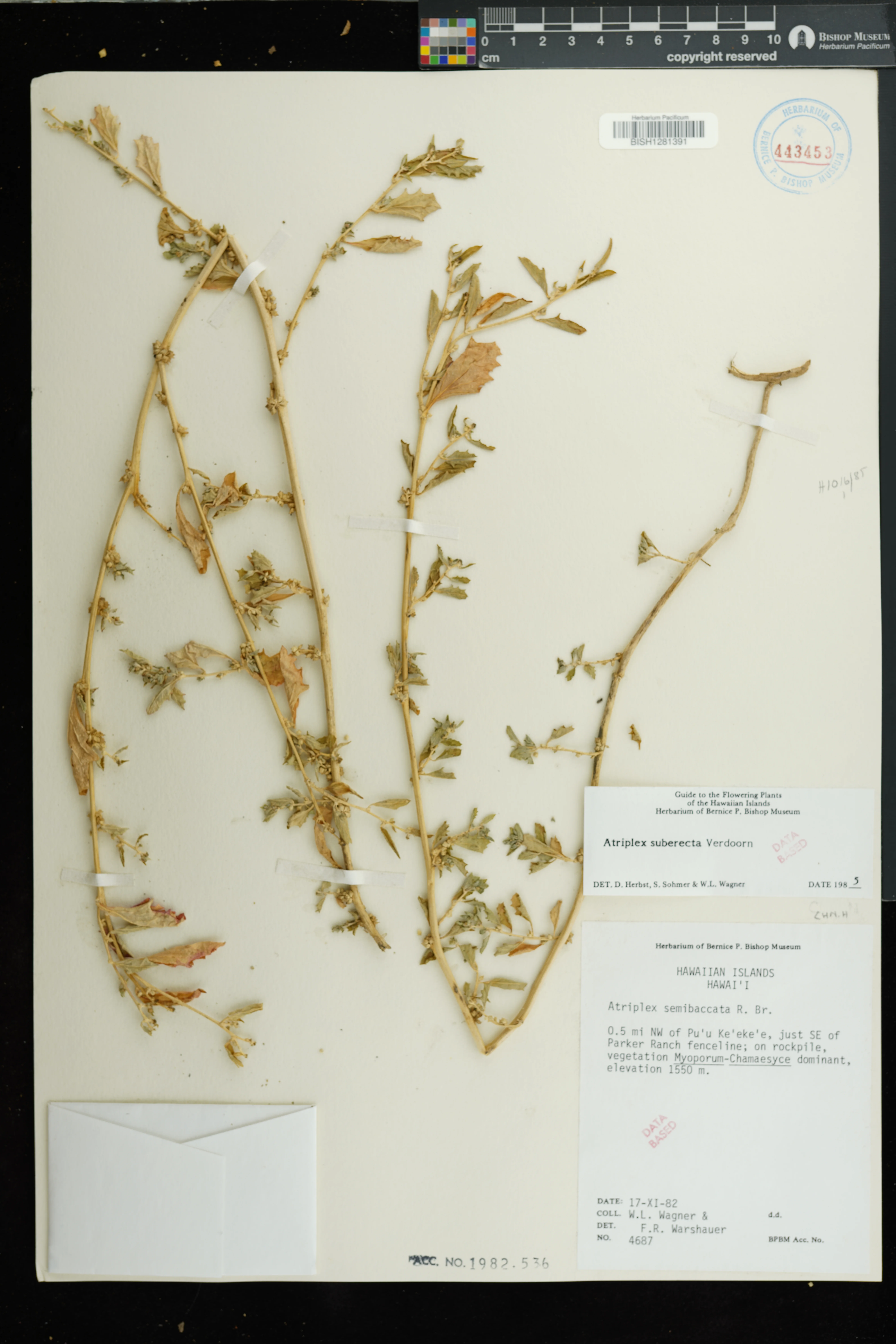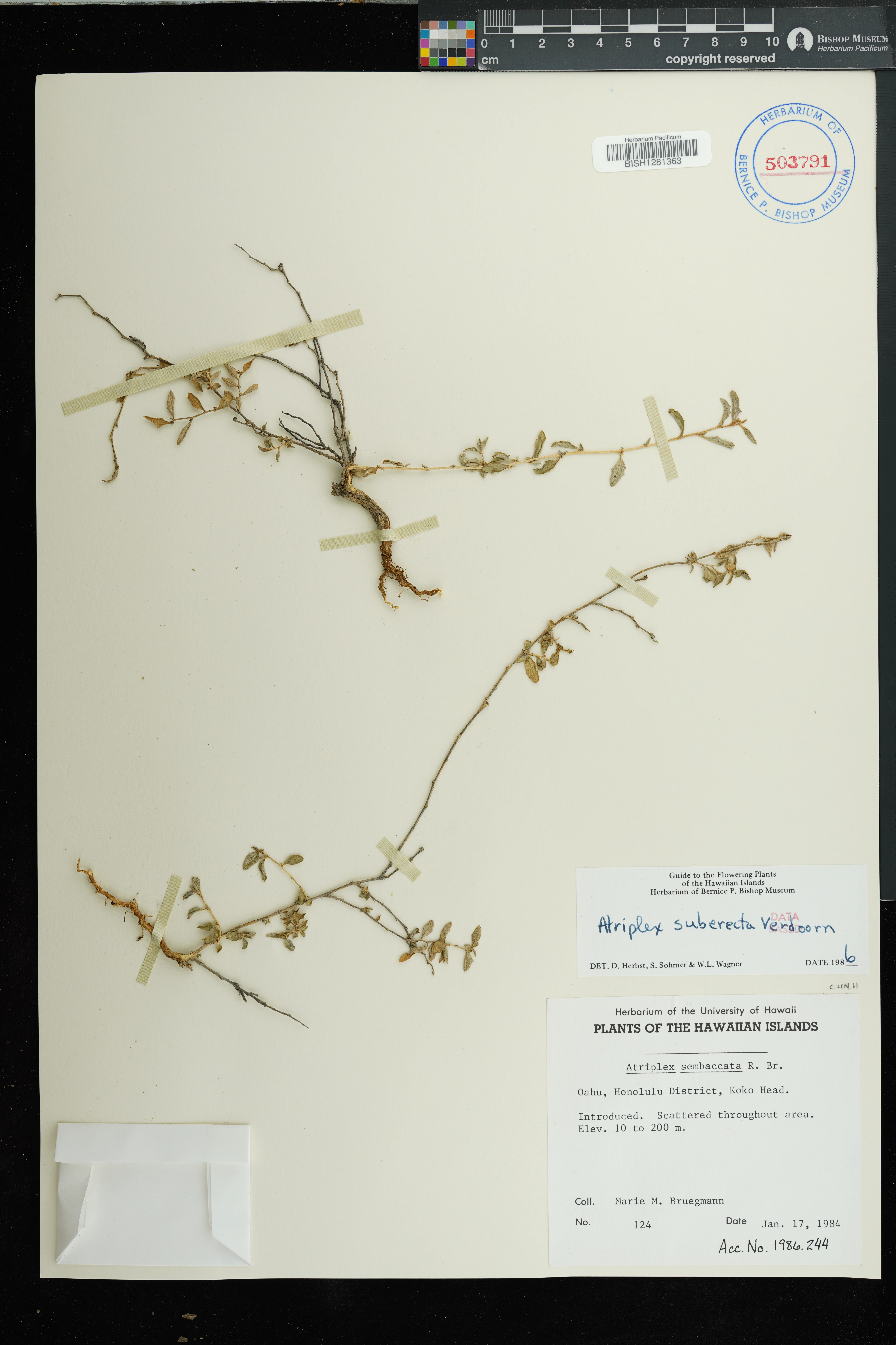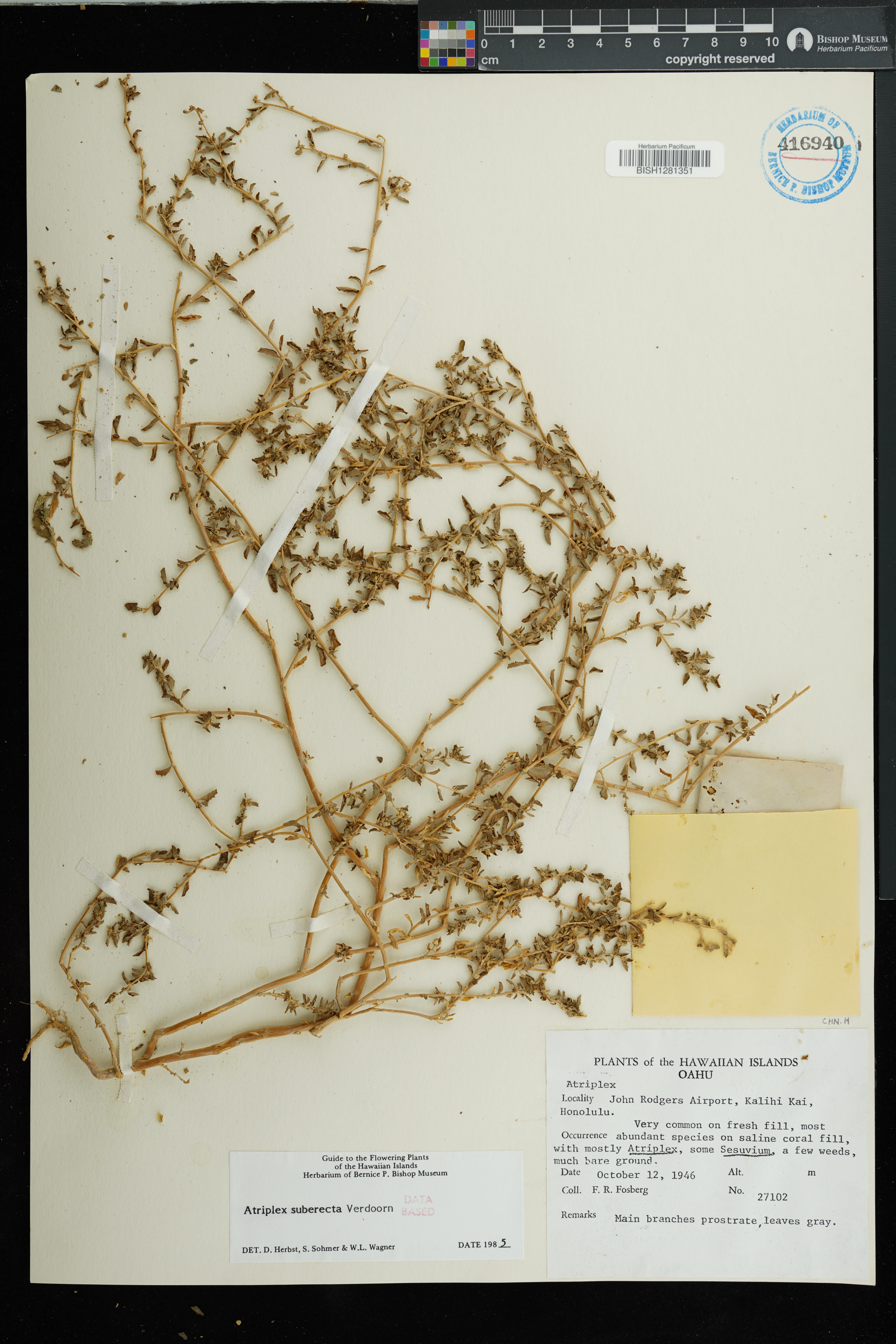 Naturalized small shrub, patchy in this area. Associated vegetation: Chenopodium oahuense, Ipomoea pes-caprae, Cocos nucifera, Tournefortia argentea, Chenopodium murale. |