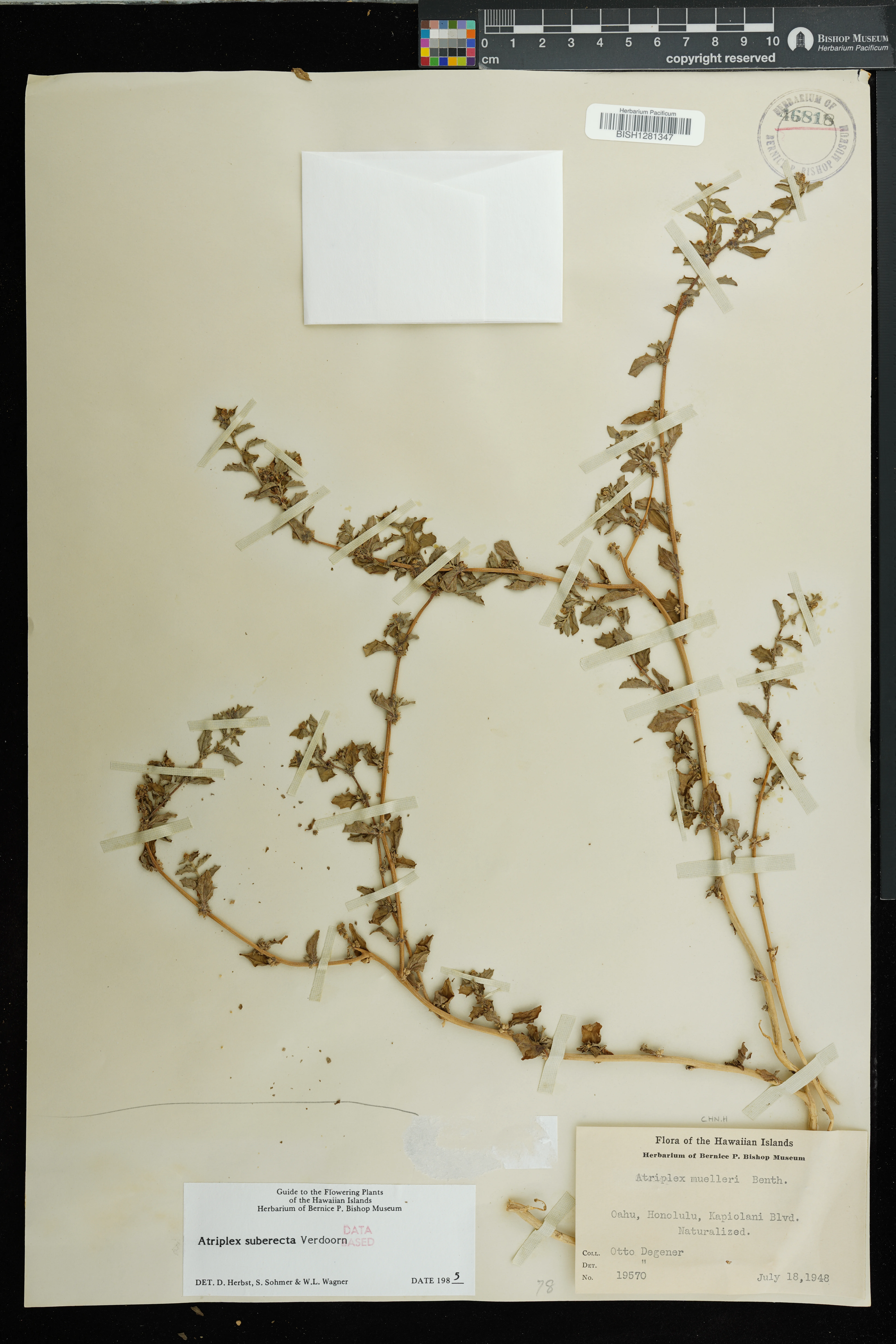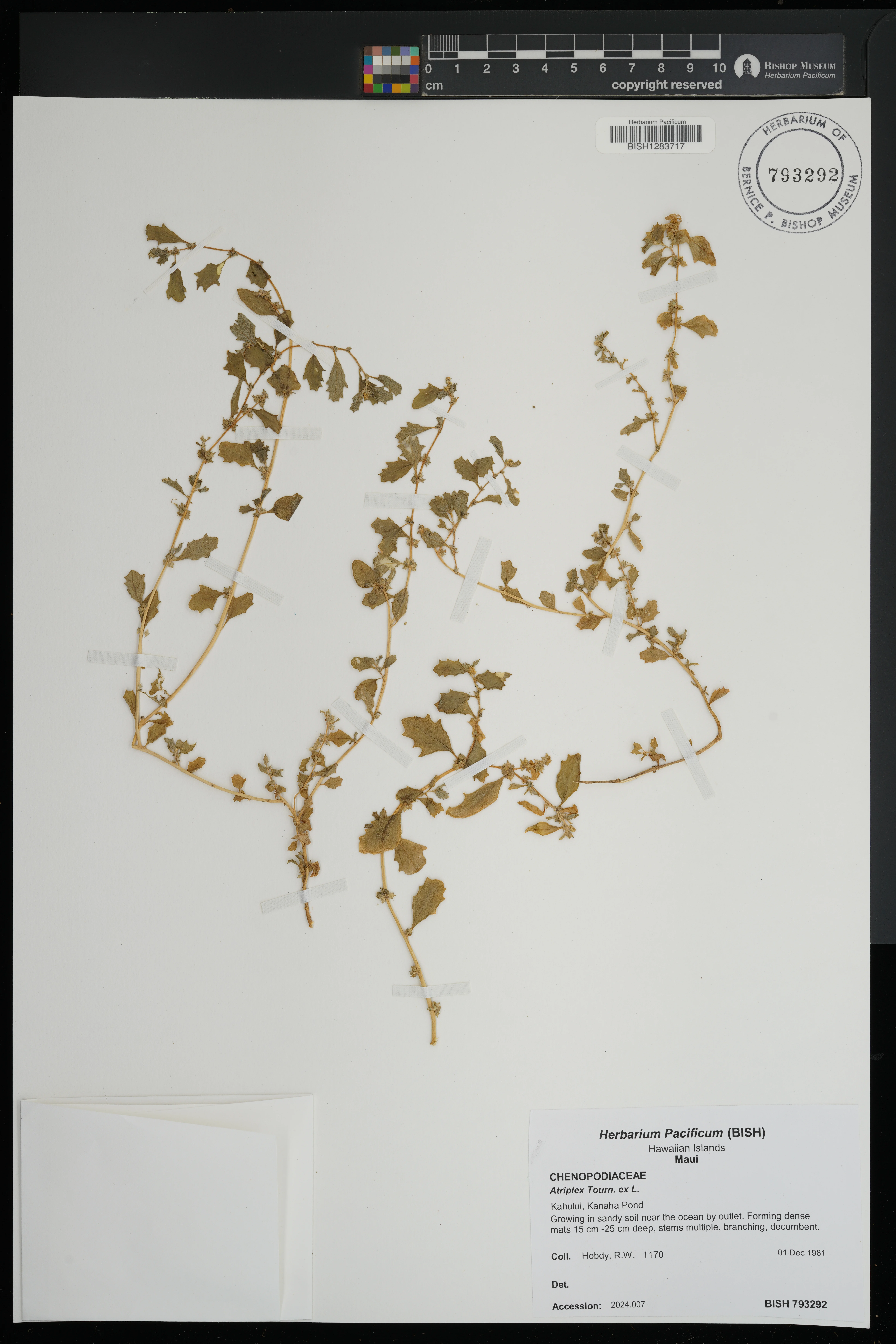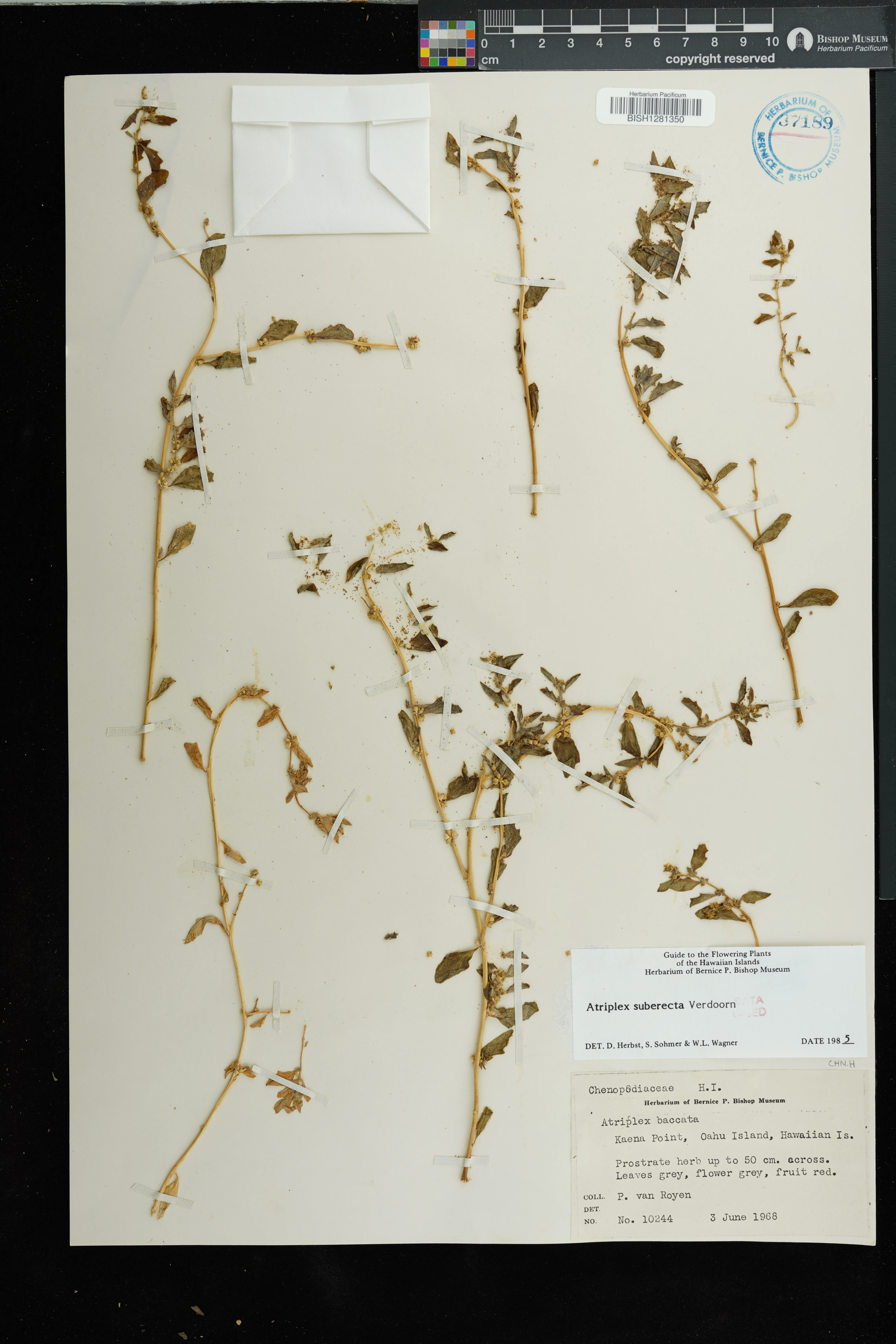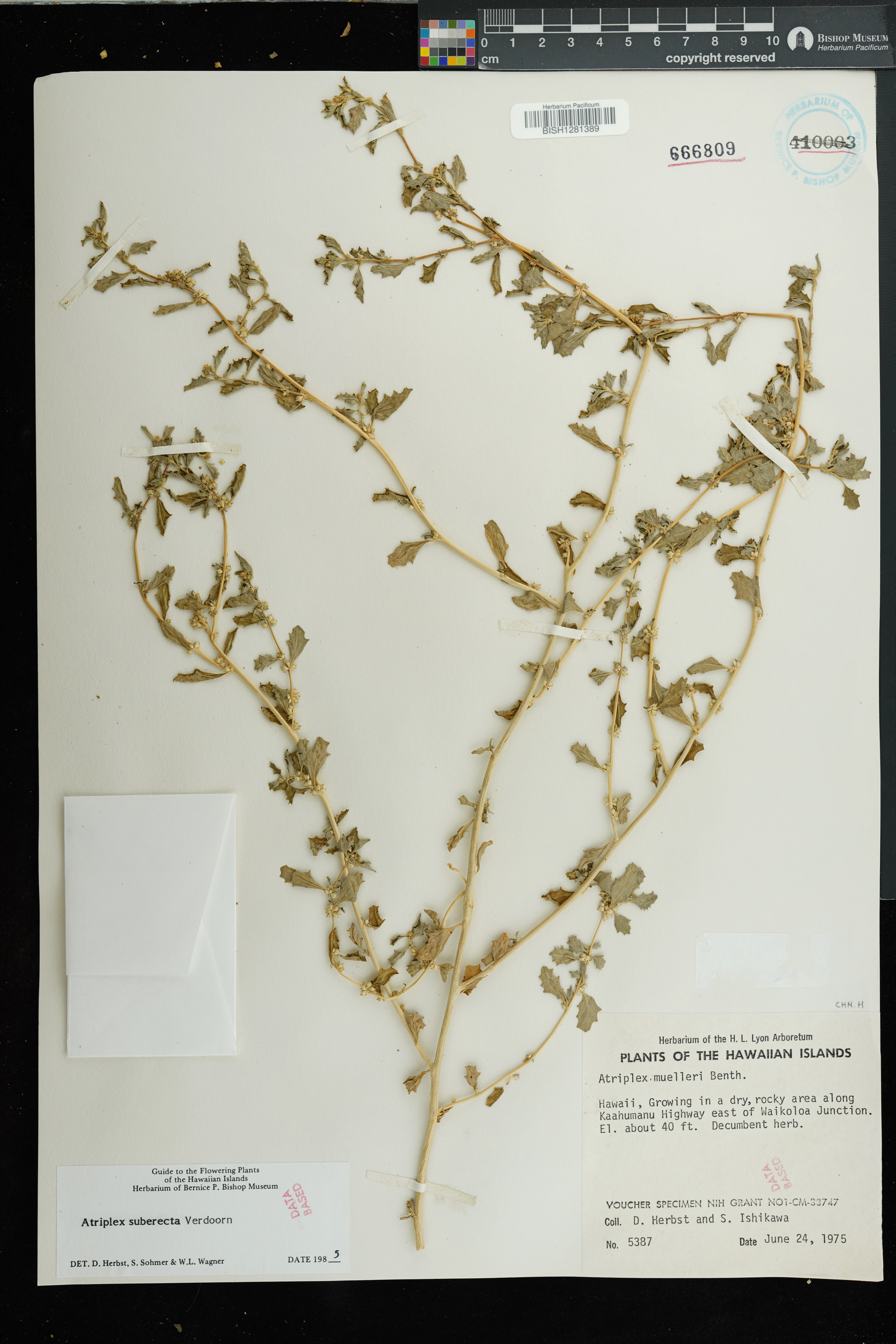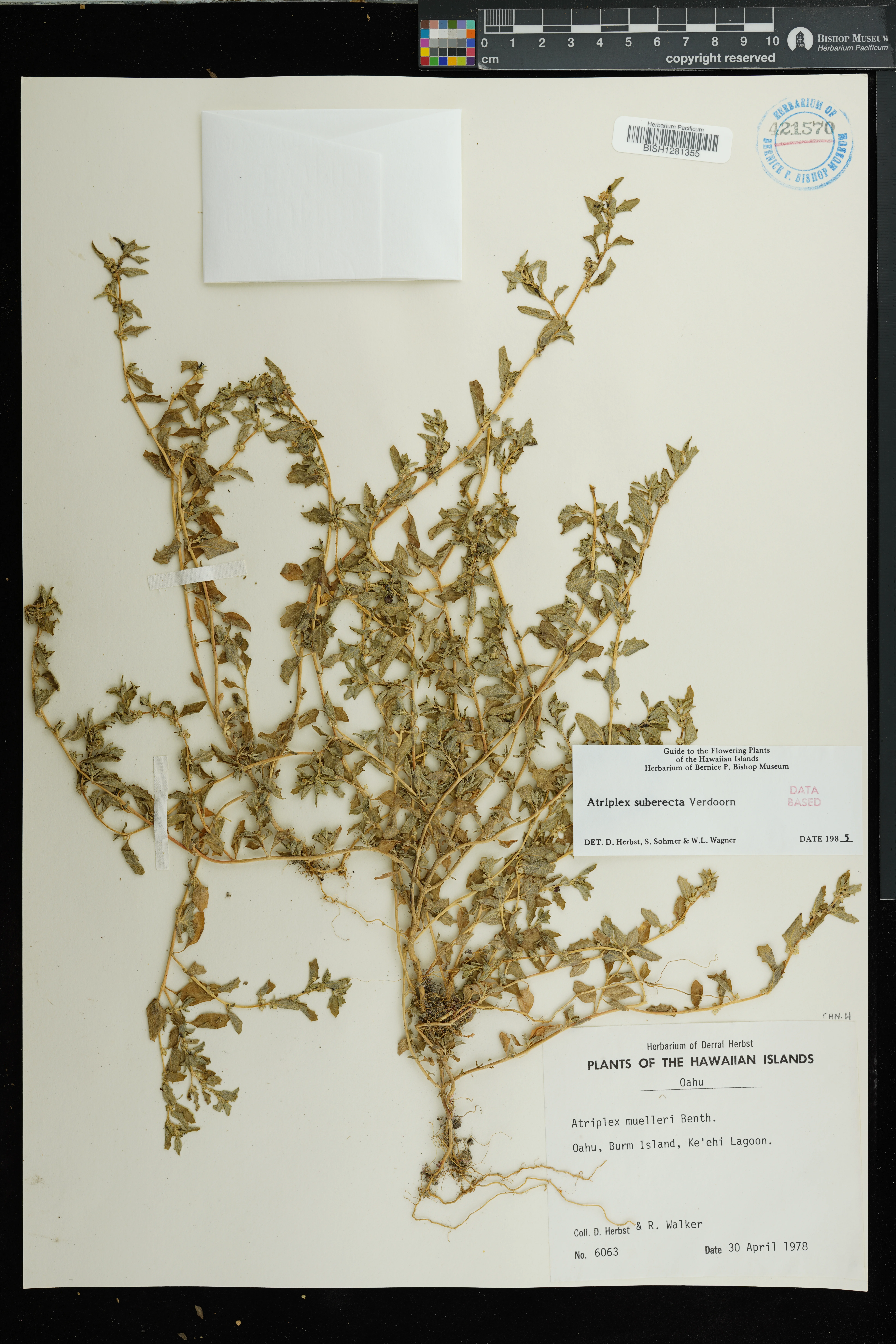 Naturalized small shrub, patchy in this area. Associated vegetation: Chenopodium oahuense, Ipomoea pes-caprae, Cocos nucifera, Tournefortia argentea, Chenopodium murale. |