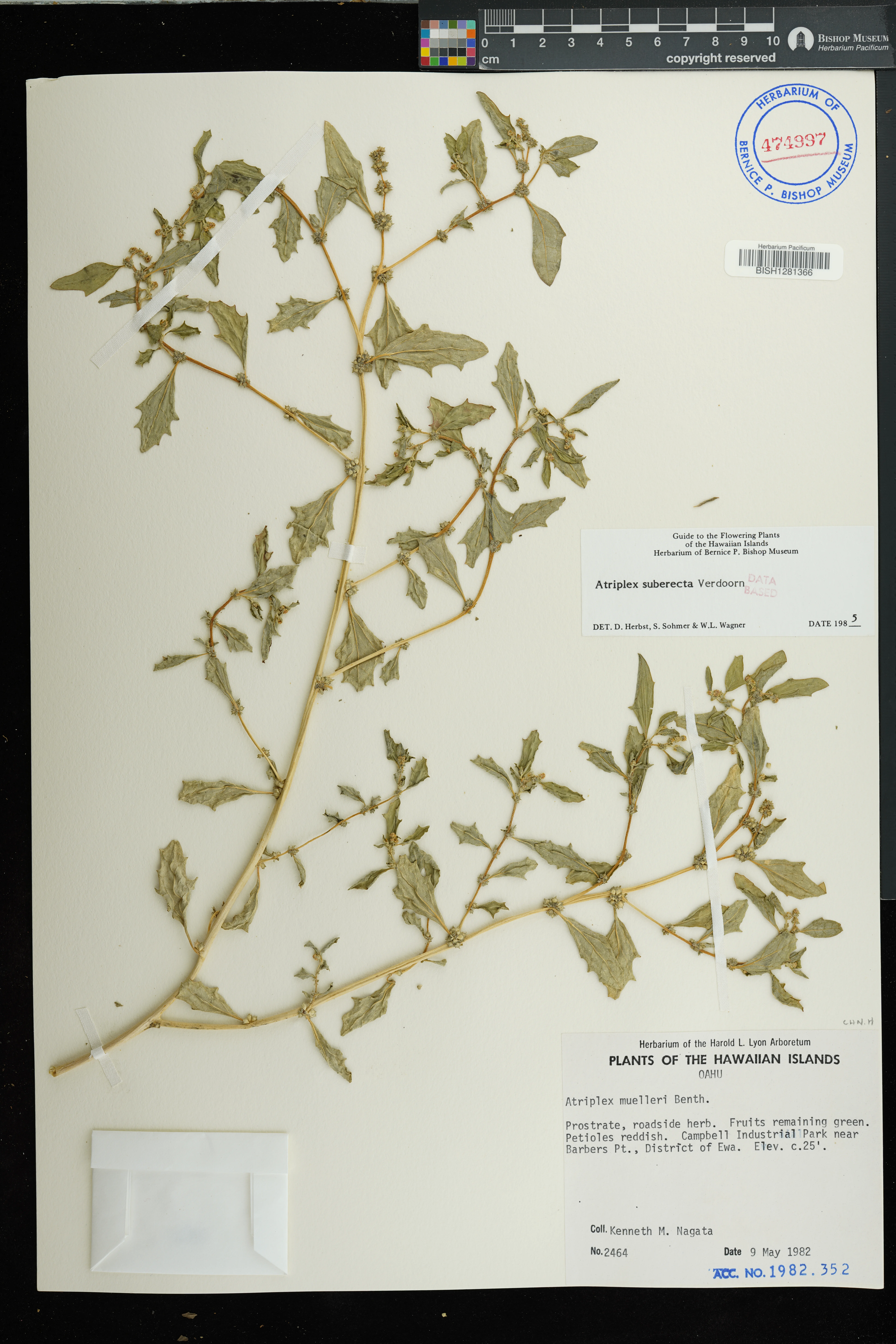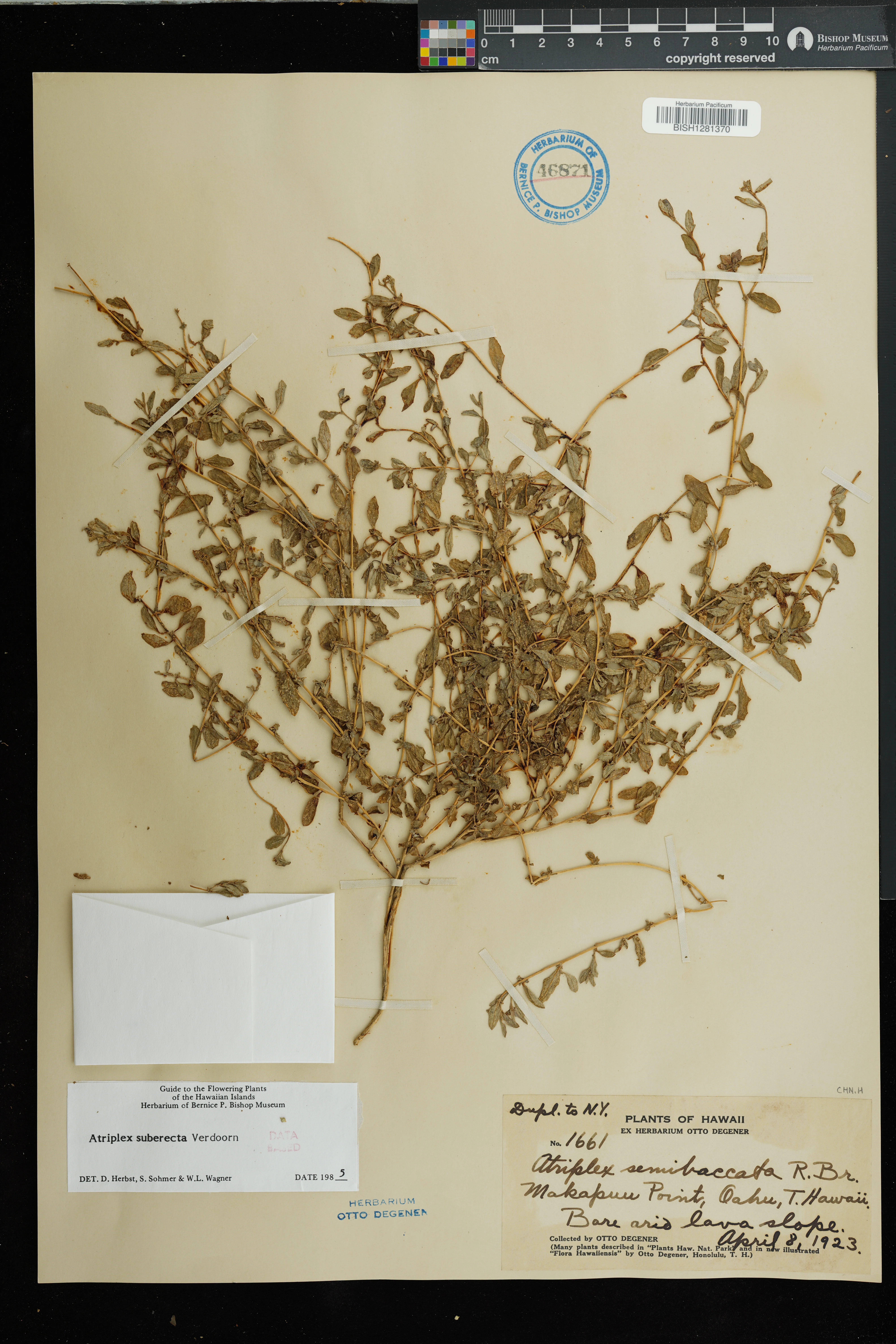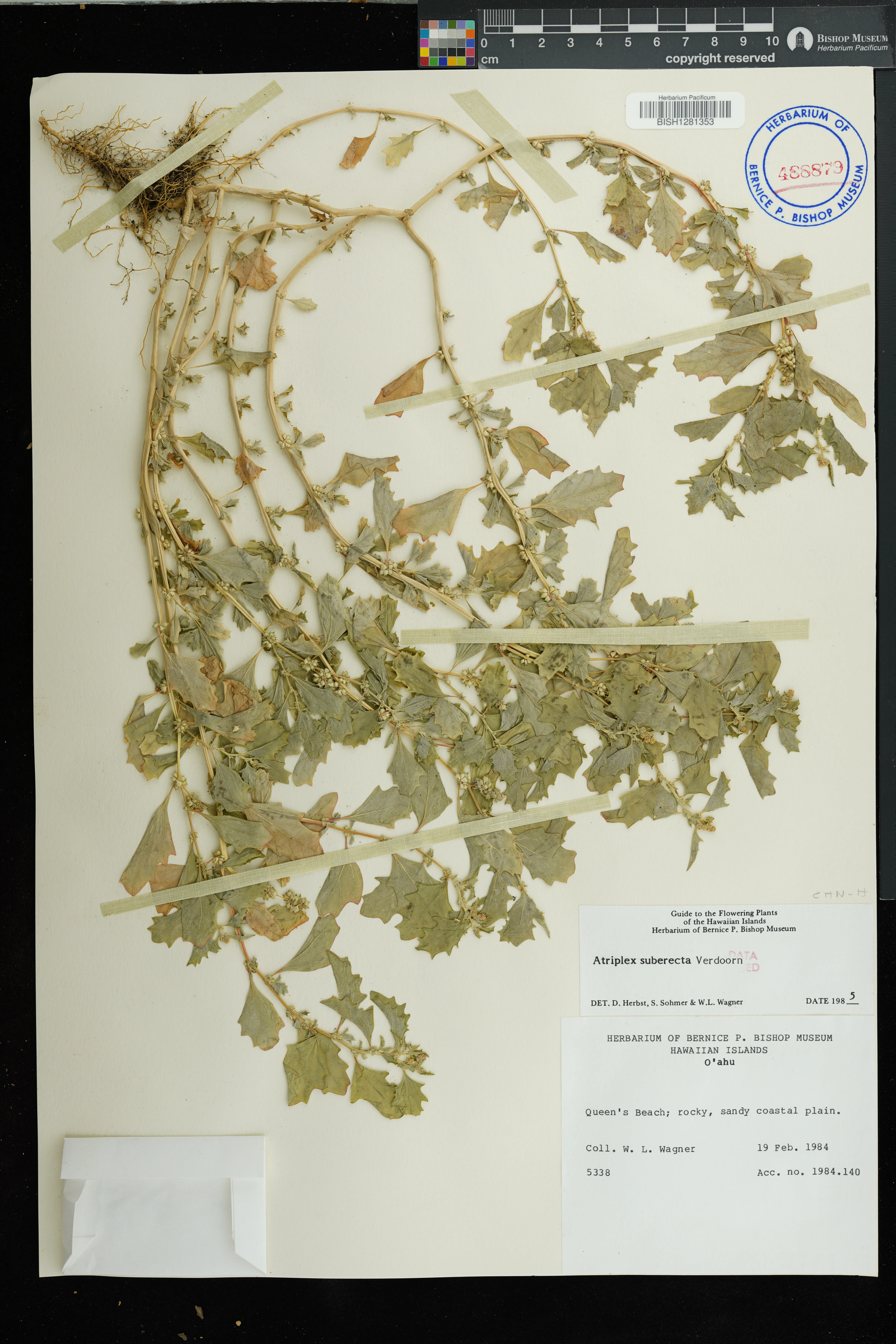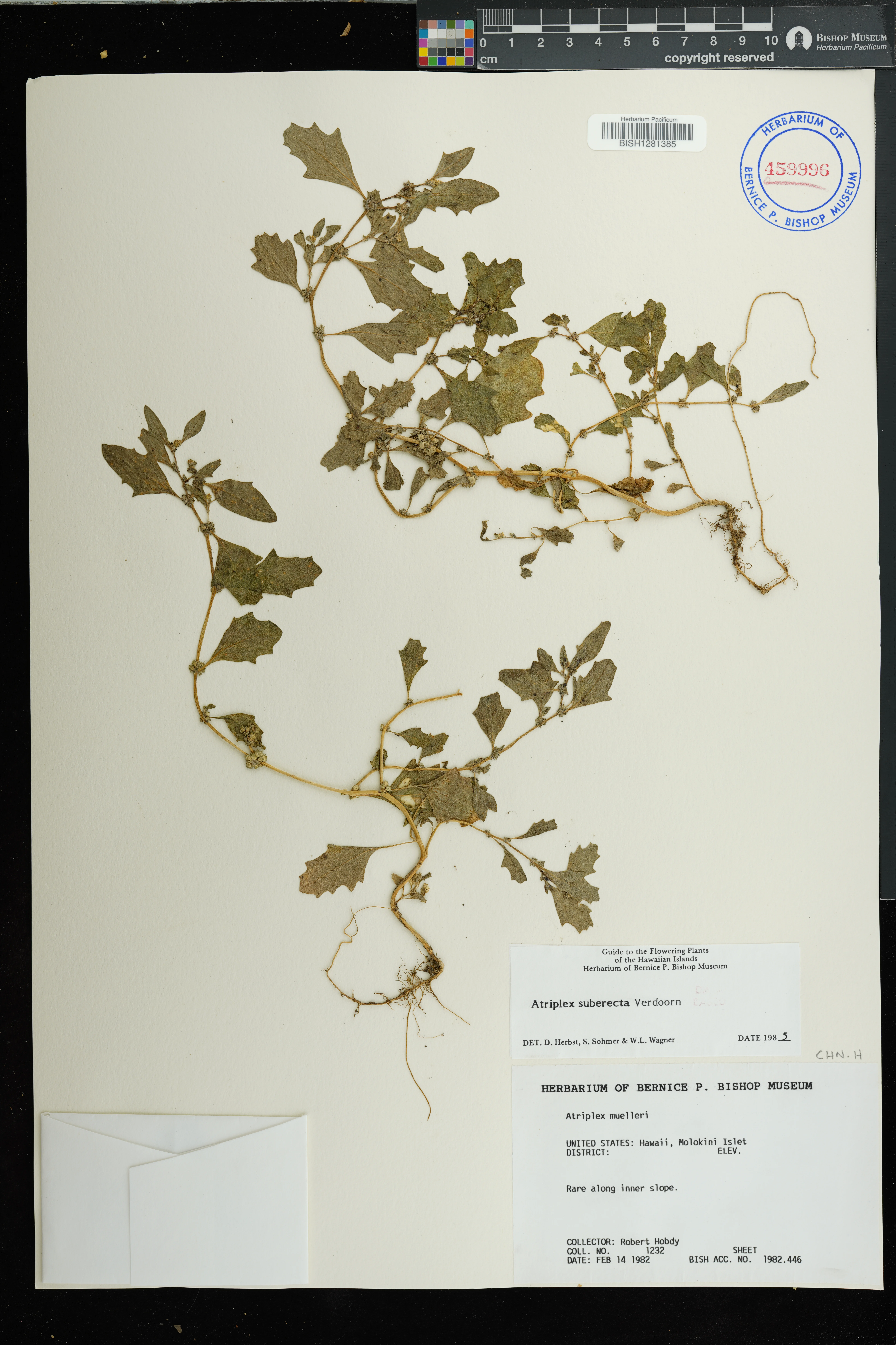 Naturalized small shrub, patchy in this area. Associated vegetation: Chenopodium oahuense, Ipomoea pes-caprae, Cocos nucifera, Tournefortia argentea, Chenopodium murale. |