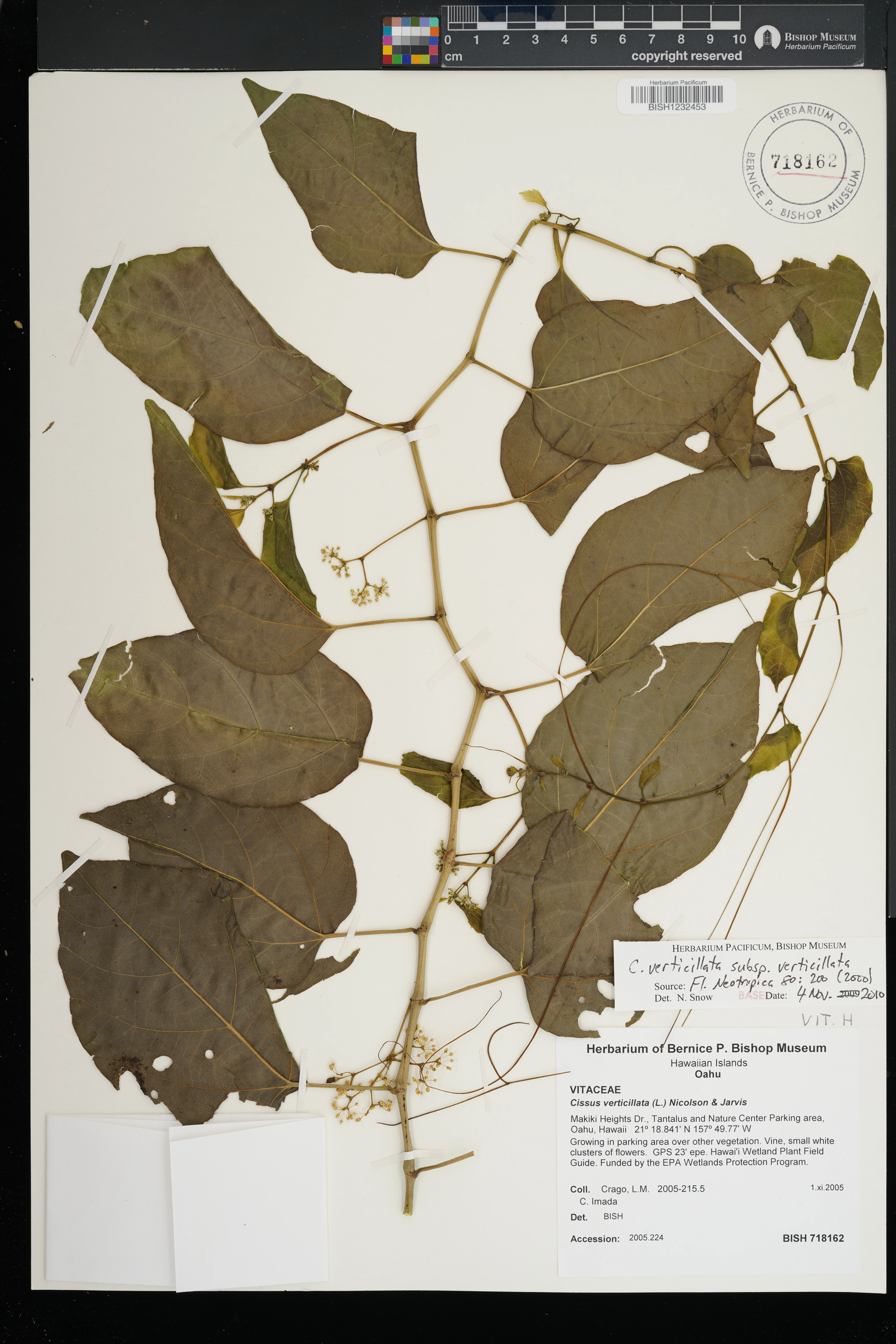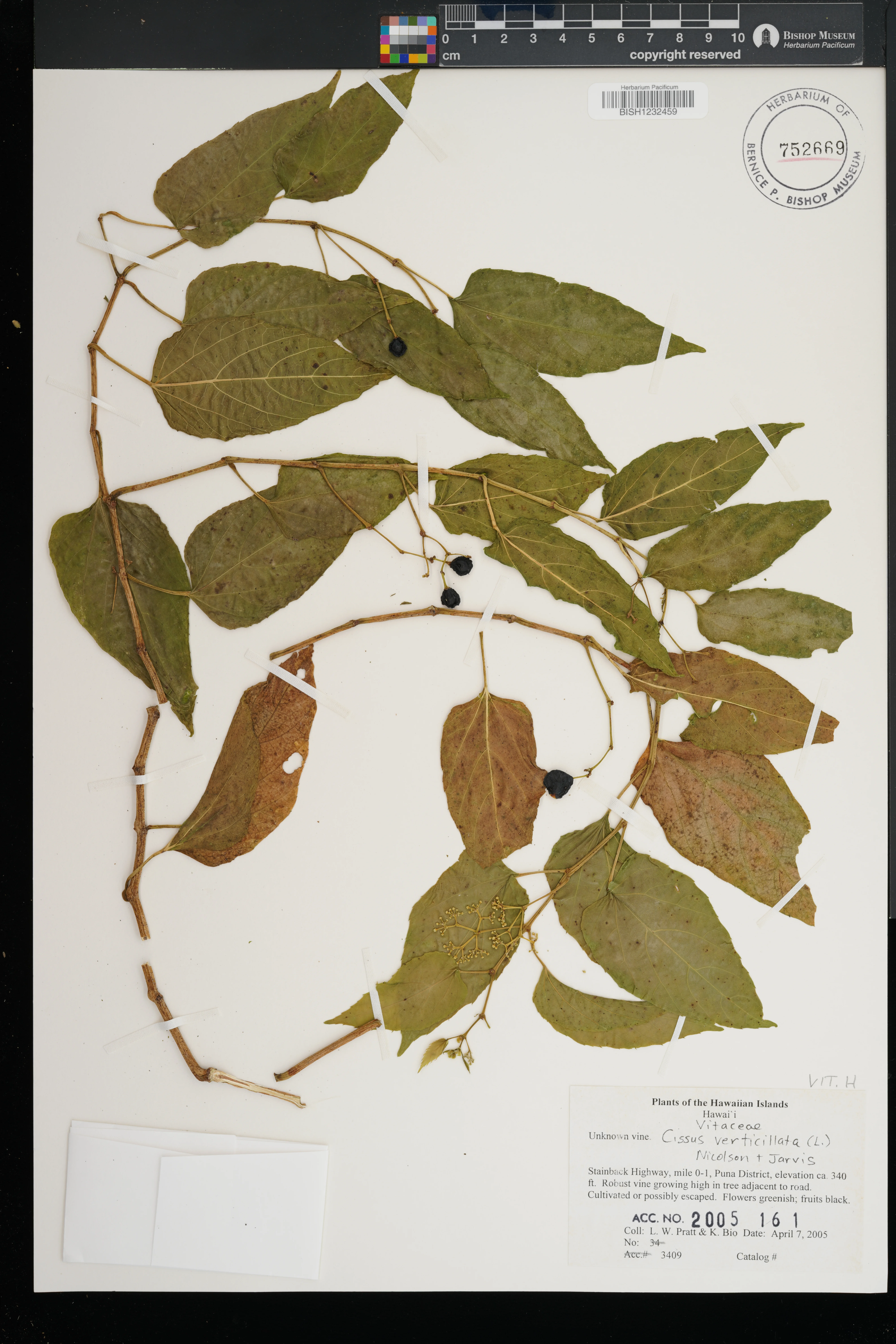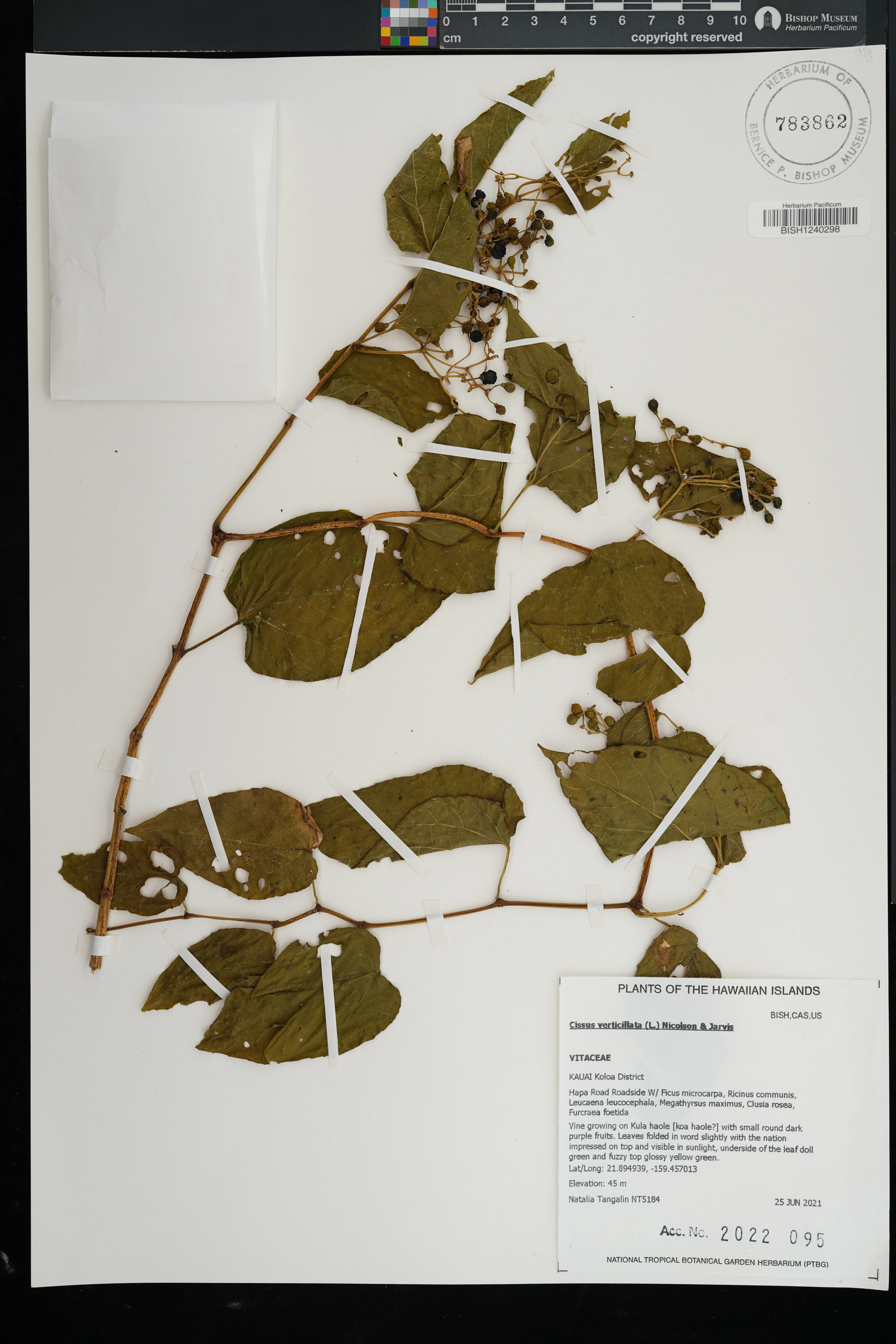 Robust vine growing high in tree adjacent to road. Cultivated or possibly escaped. |