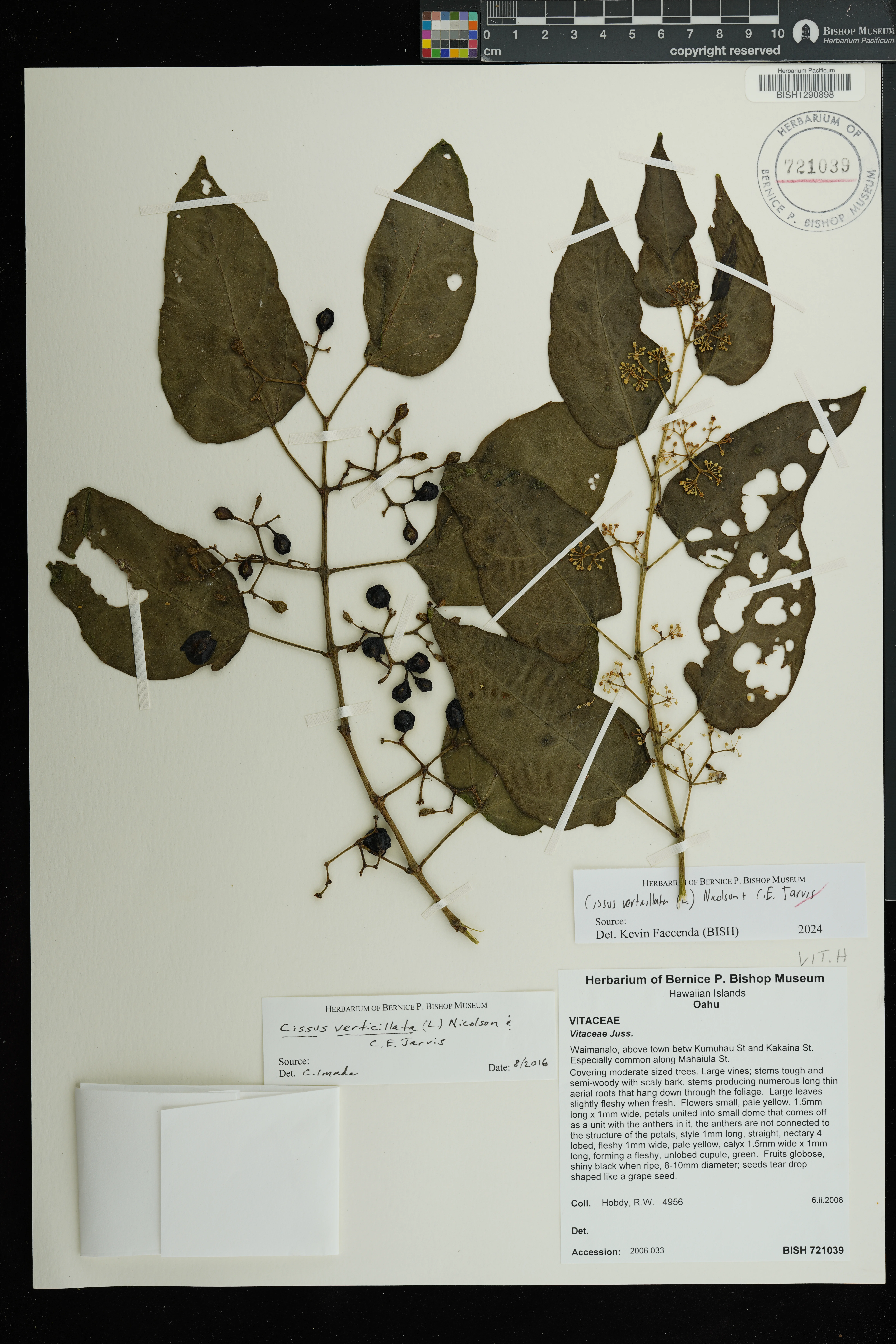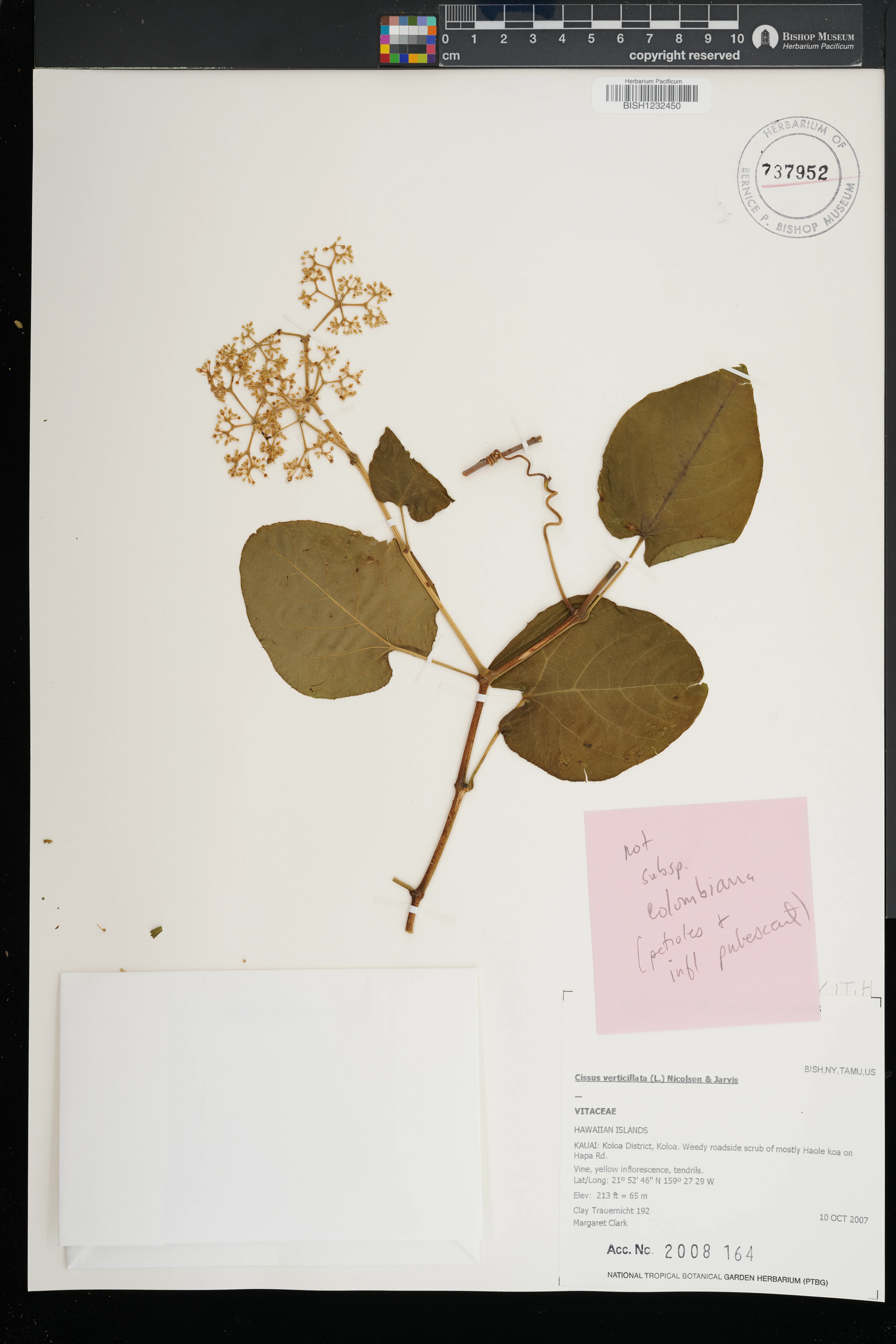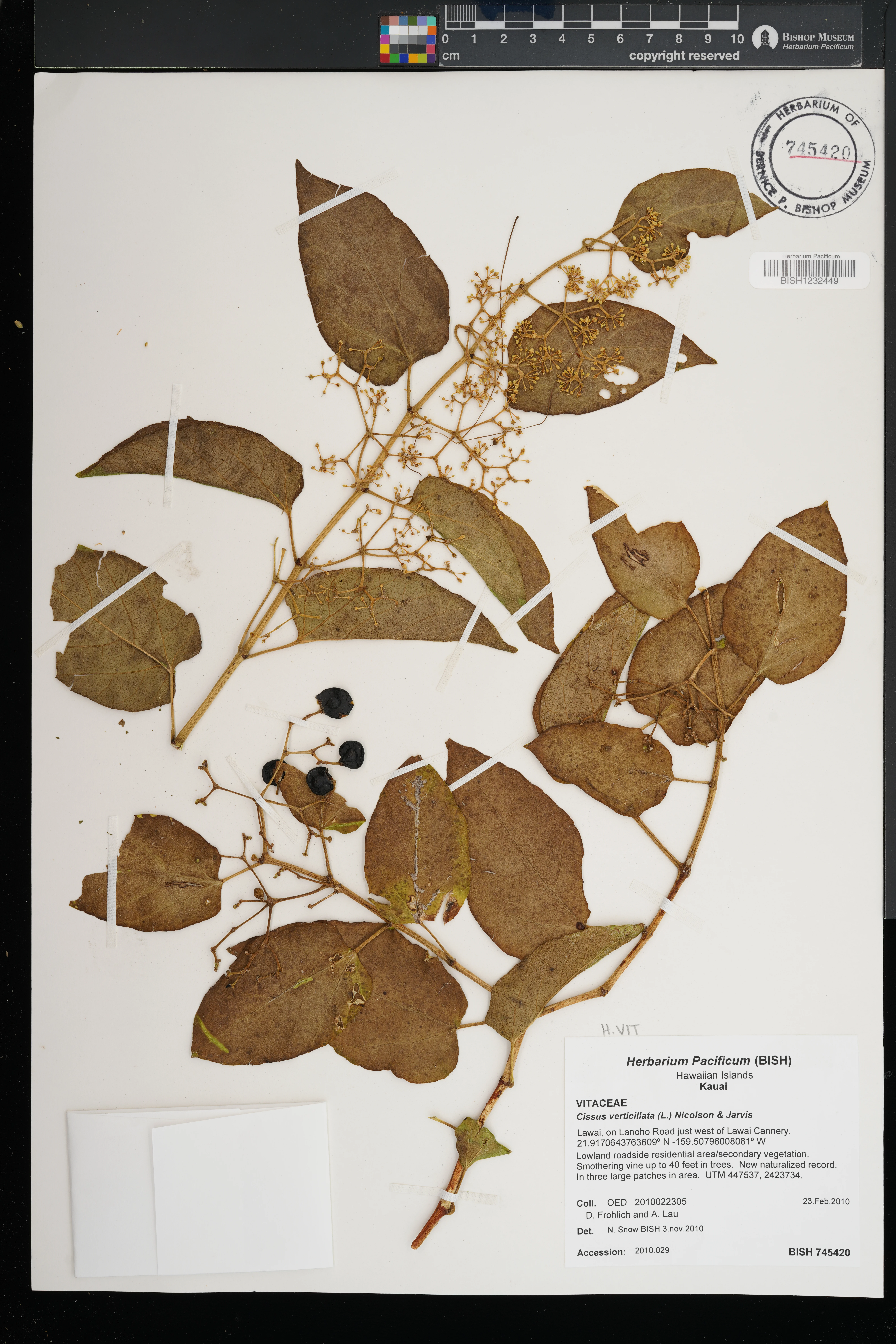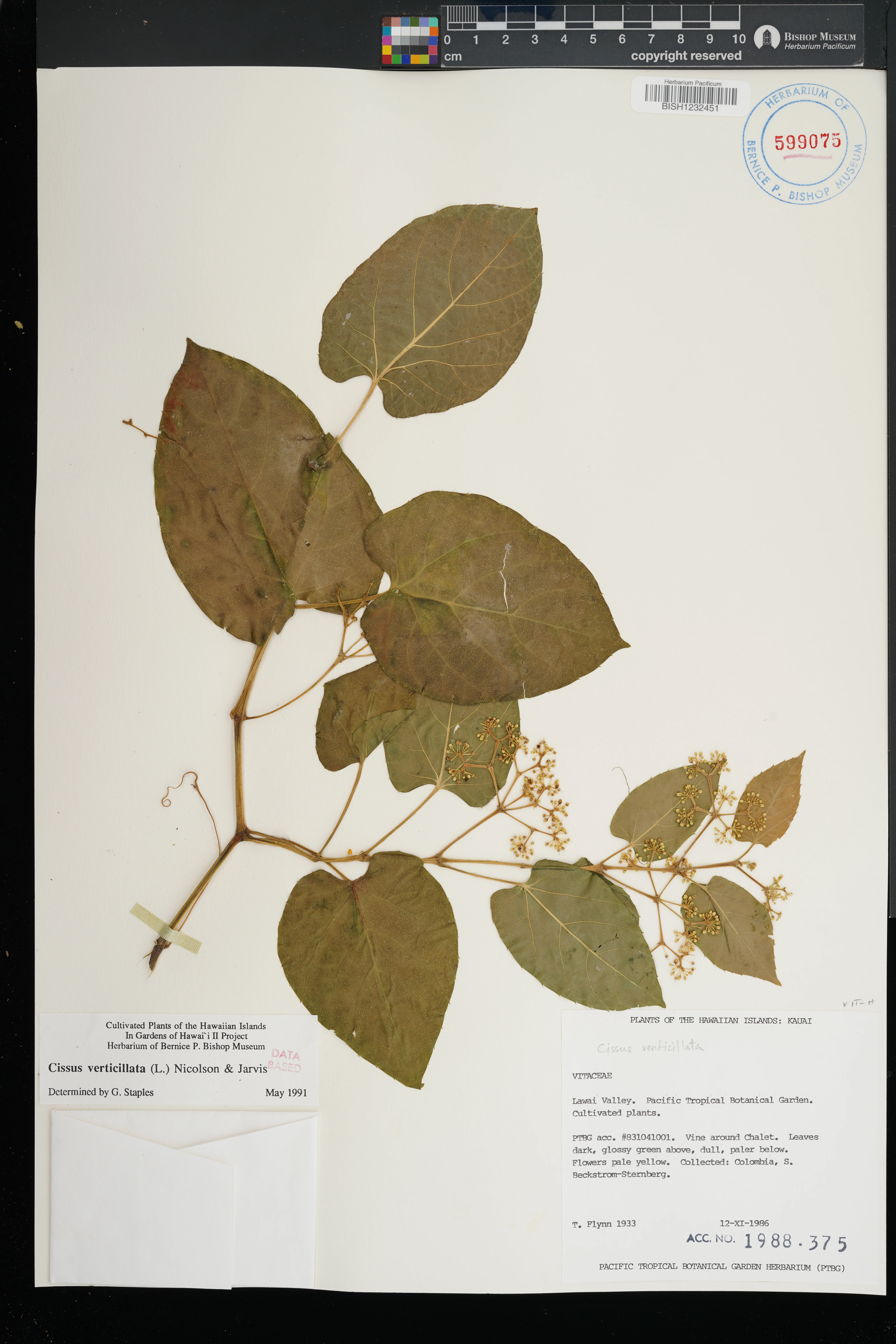 Robust vine growing high in tree adjacent to road. Cultivated or possibly escaped. |