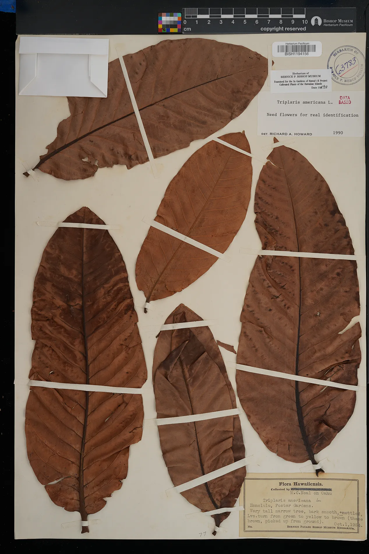 | 3 | Triplaris americana | L. | foster gardens | PRESERVED_SPECIMEN | neal, m.c. | collector number: s.n. | Oahu | BISH | 10/1/1954 | |
