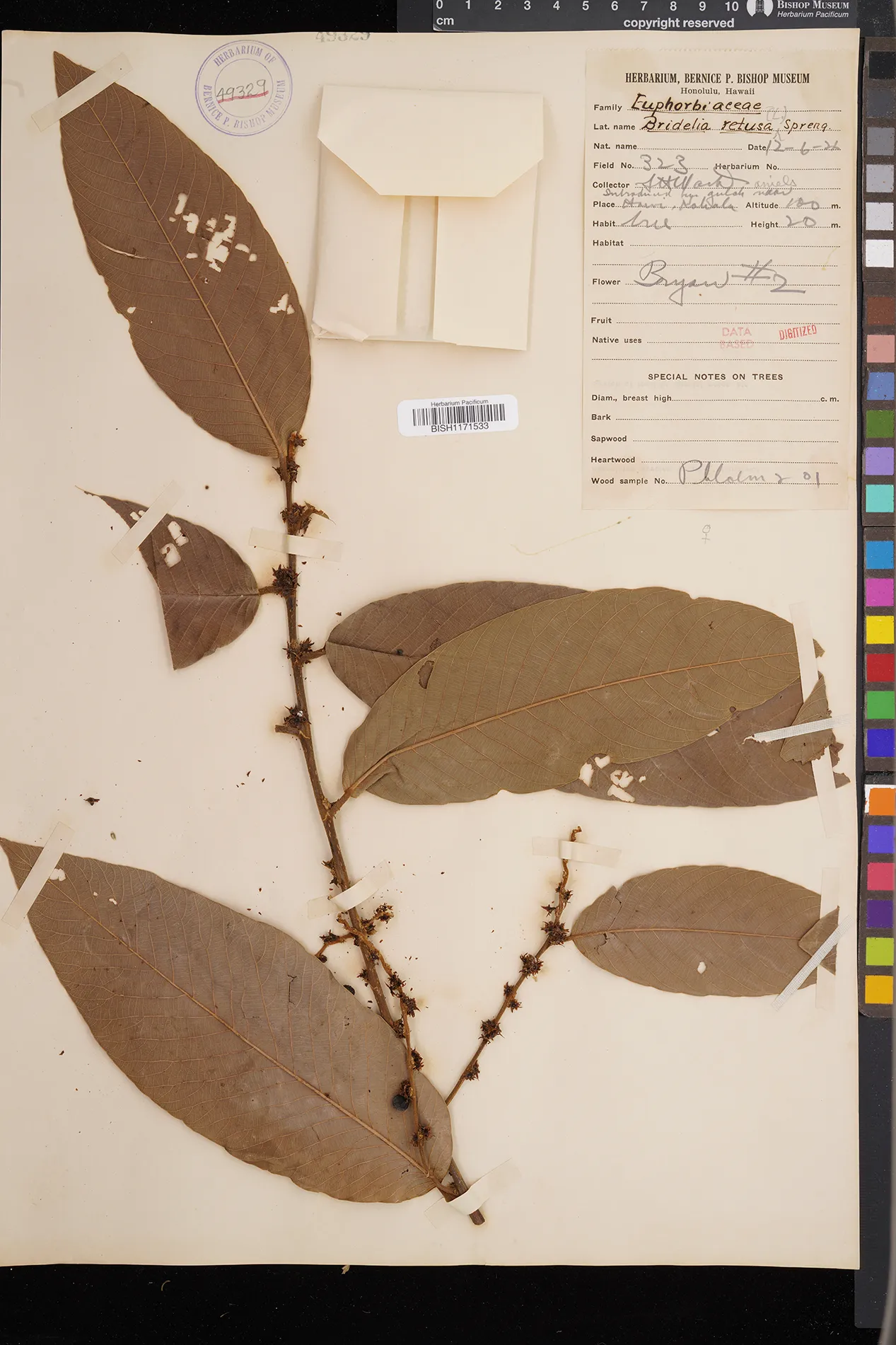 | 11 | Bridelia retusa | (L.) A.Juss. | introduced by gulch near kohala | PRESERVED_SPECIMEN | daniels | collector number: 323 | Maui | BISH | 12/6/1921 |