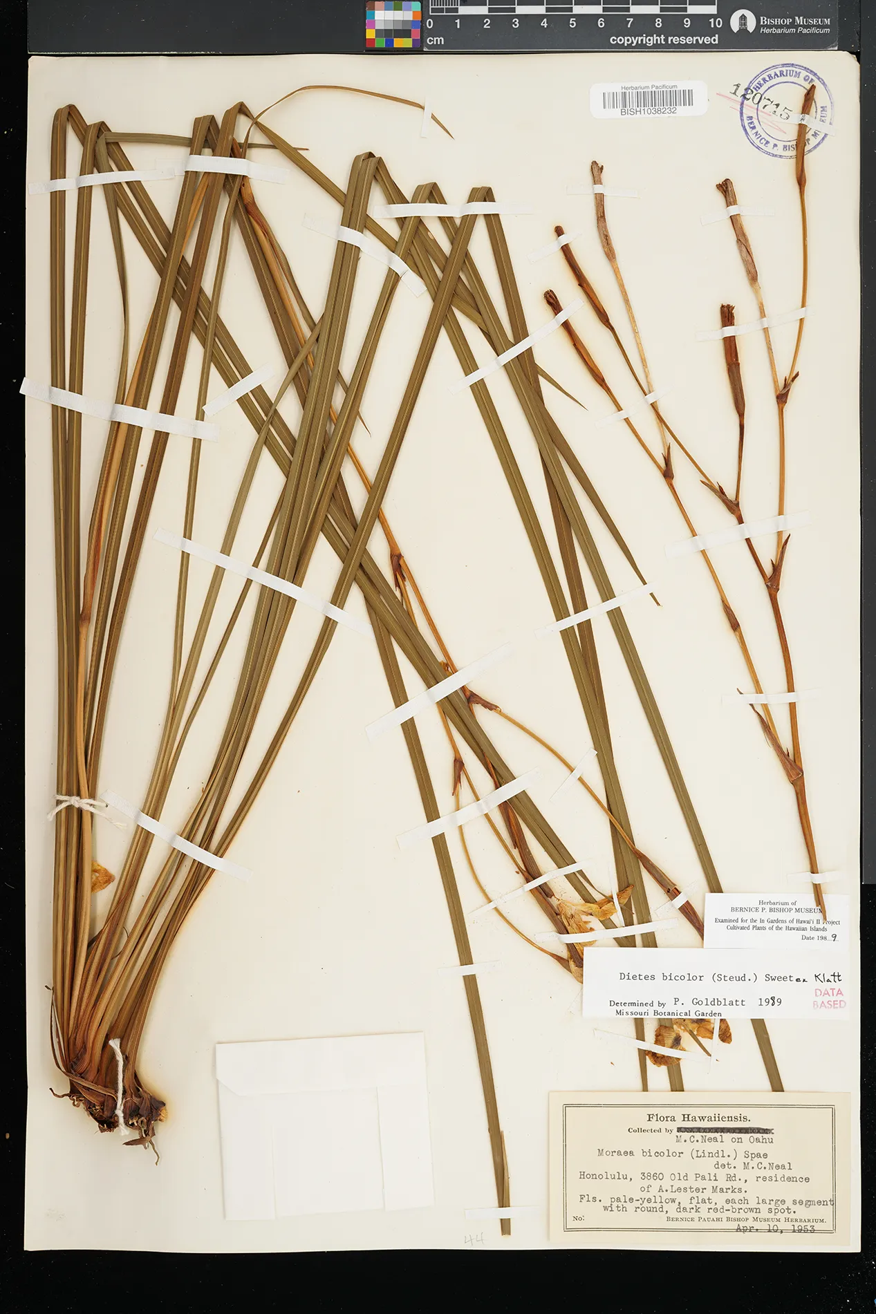 | 9 | Dietes bicolor | (Steud.) Sweet ex Klatt | Honolulu, 3860 Old Pali Rd, residence of A. Lester Marks | PRESERVED_SPECIMEN | Neal, M.C. | s.n. | Oahu | BISH | 4/10/1953 | |