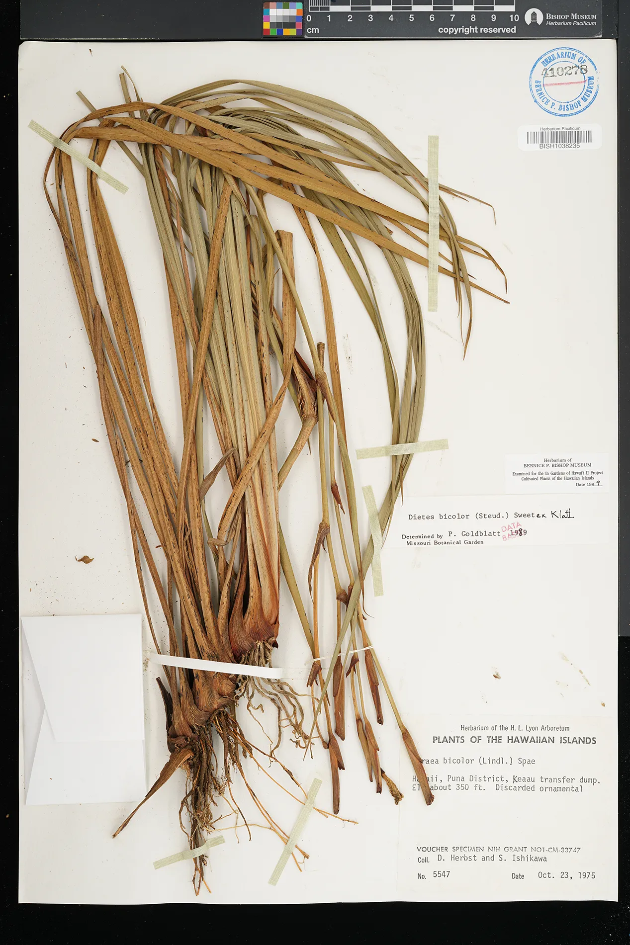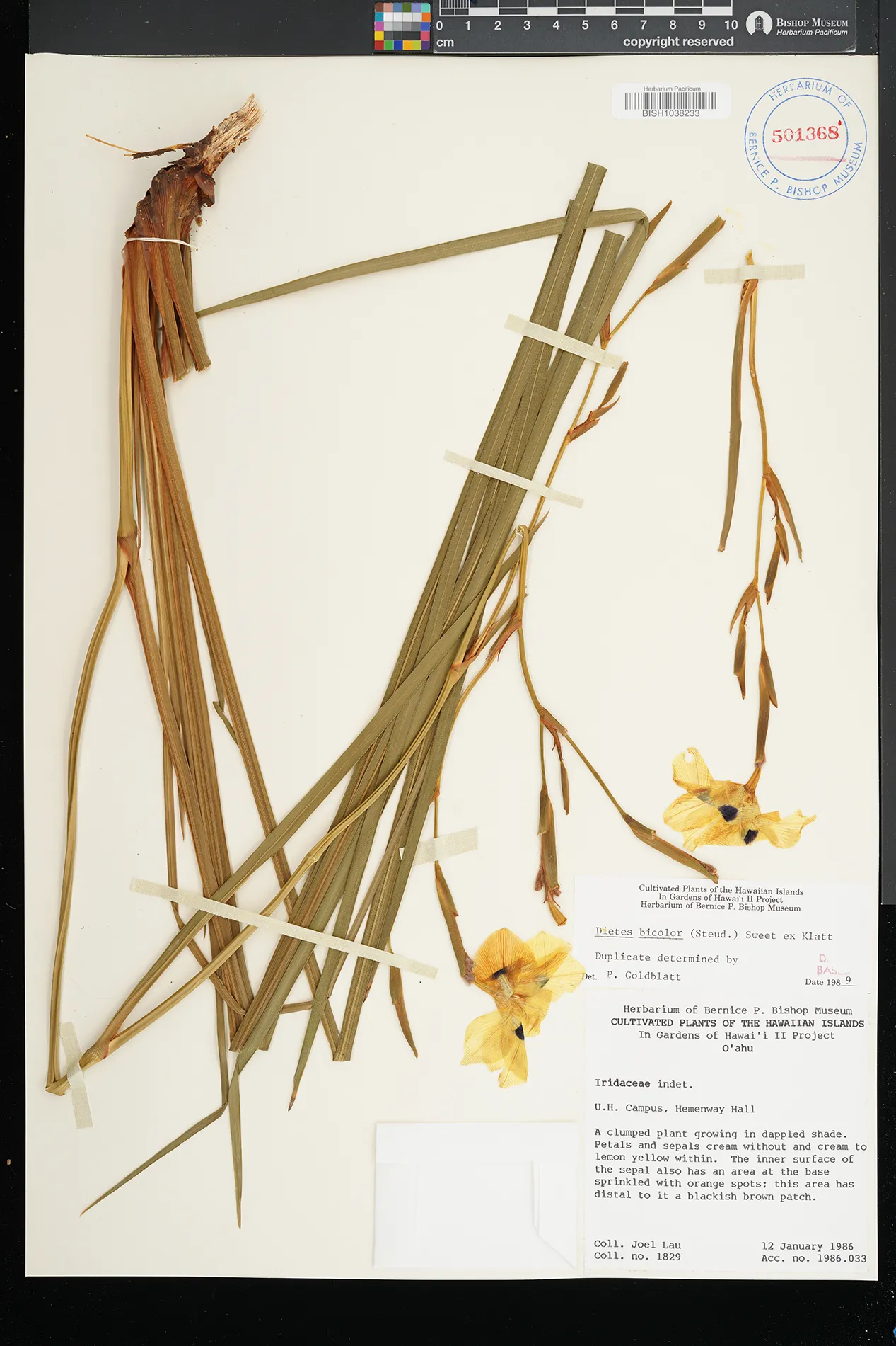 | 8 | Dietes bicolor | (Steud.) Sweet ex Klatt | Honolulu: Manoa Valley; University of Hawaii Manoa Campus, Hemenway Hall | Growing in dappled shade. | PRESERVED_SPECIMEN | Lau, J. | 1829 | Oahu | BISH | 1/12/1986 |