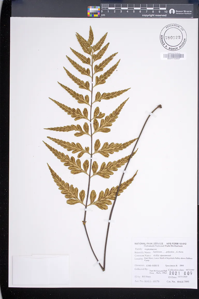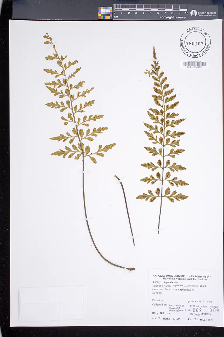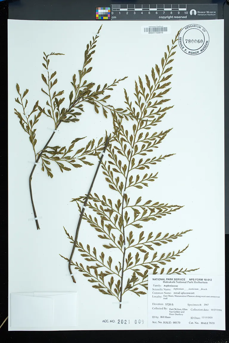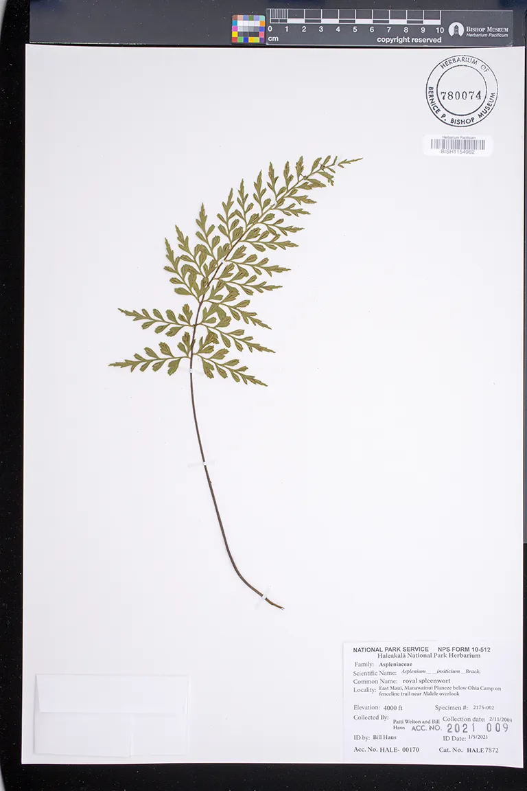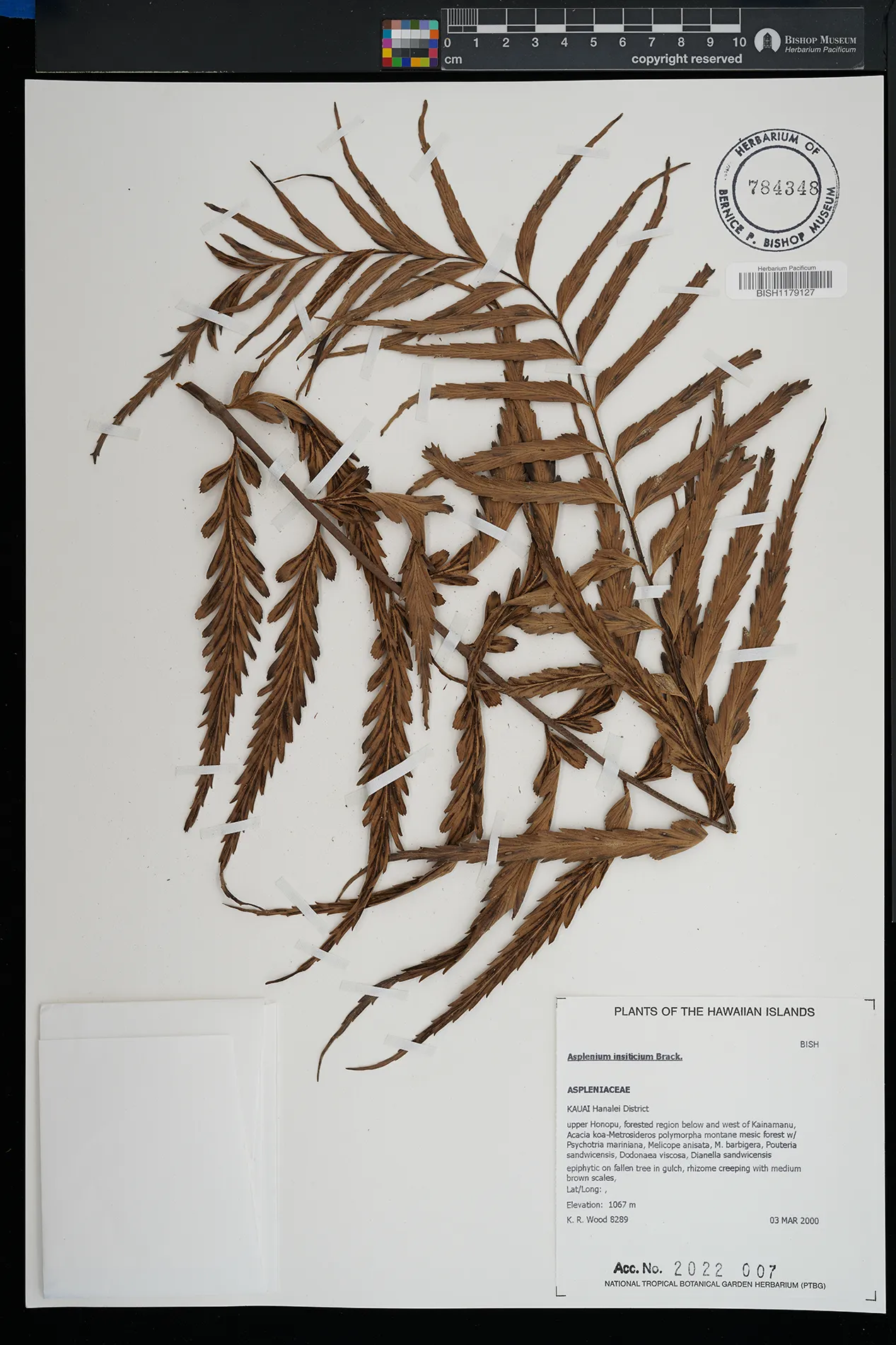 5 m `Ohi`a Montane Wet Forest along a steep rocky streambed. Assoc. veg.: Cheirodendron trigynum, Broussaisia arguta, Cibotium glaucum, Sadleria pallida, S. squarrosa, Athyrium microphyllum, Diplazium sandwichianum, Callistopteris baueriana, Asplenium excisum. |