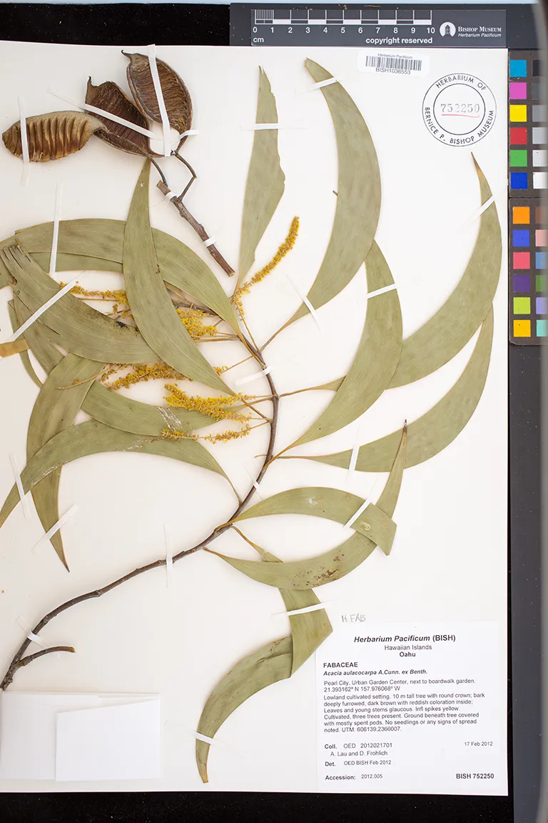 | 4 | Acacia aulacocarpa | A.Cunn. ex Benth. | Pearl City, Urban Garden Center, next to boardwalk garden. | Lowland cultivated setting. | PRESERVED_SPECIMEN | OED Lau, A.; Frohlich, D. | Collector Number: 2012021701 | Oahu | BISH | 2/17/2012 |