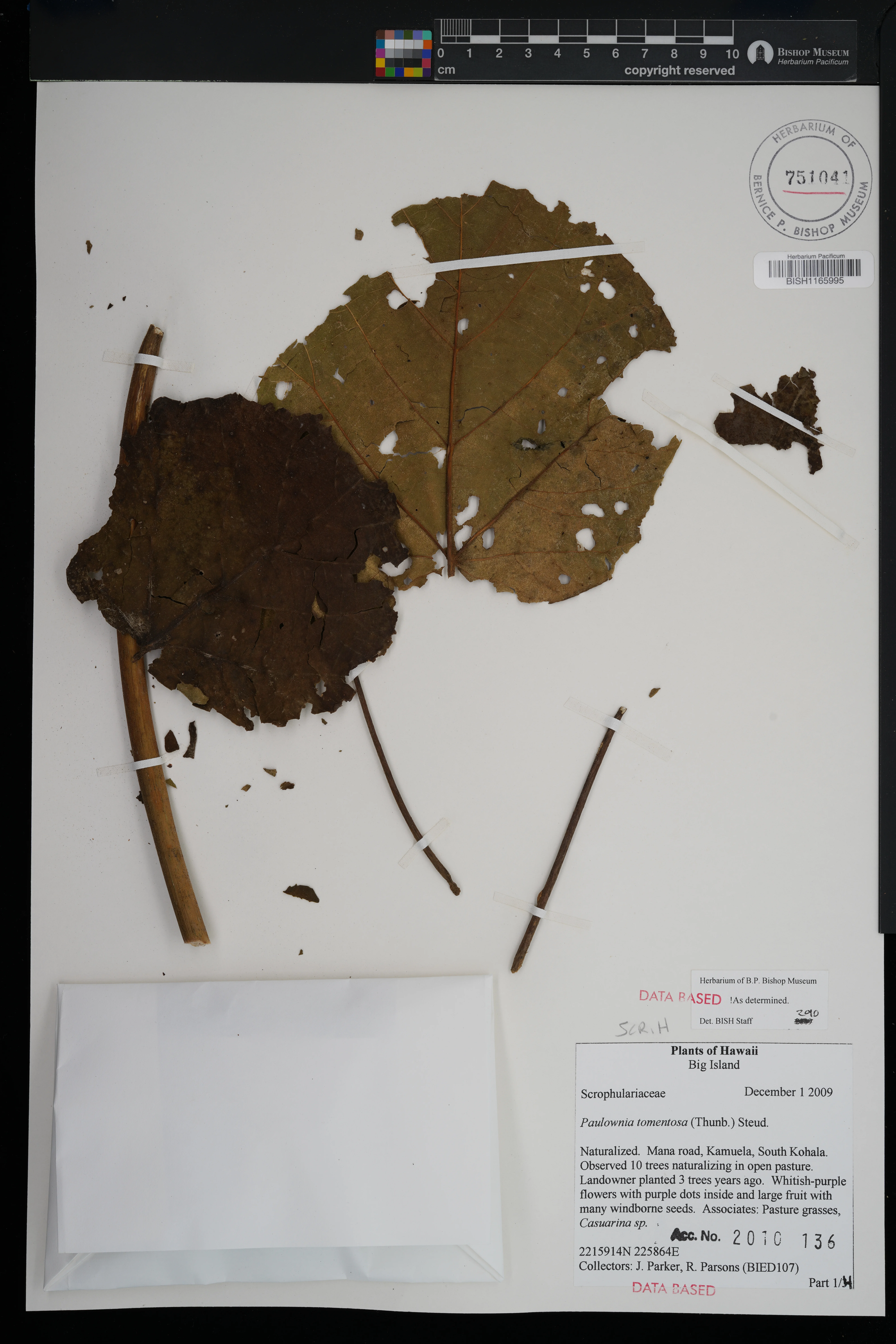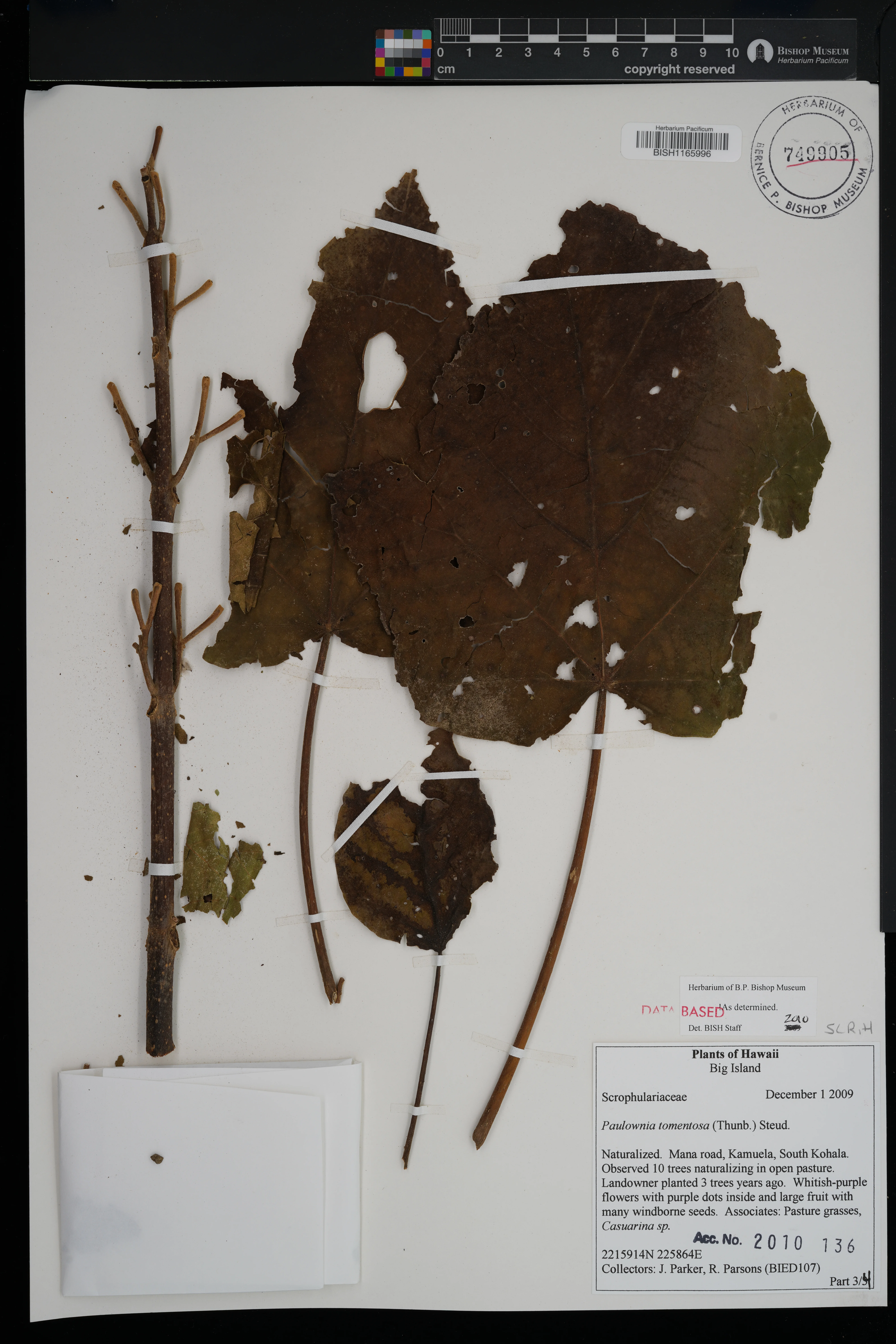 | 2 | Paulownia tomentosa | (Thunb.) Steud. | Mana road, Kamuela, S Kohala | Naturalized. In open pasture. Landowner planted 3 trees years ago. Associates: Pasture grasses, Casuarina sp. | PRESERVED_SPECIMEN | Parker, J. | BIED 107 | Hawaii | BISH | 12/1/2009 |