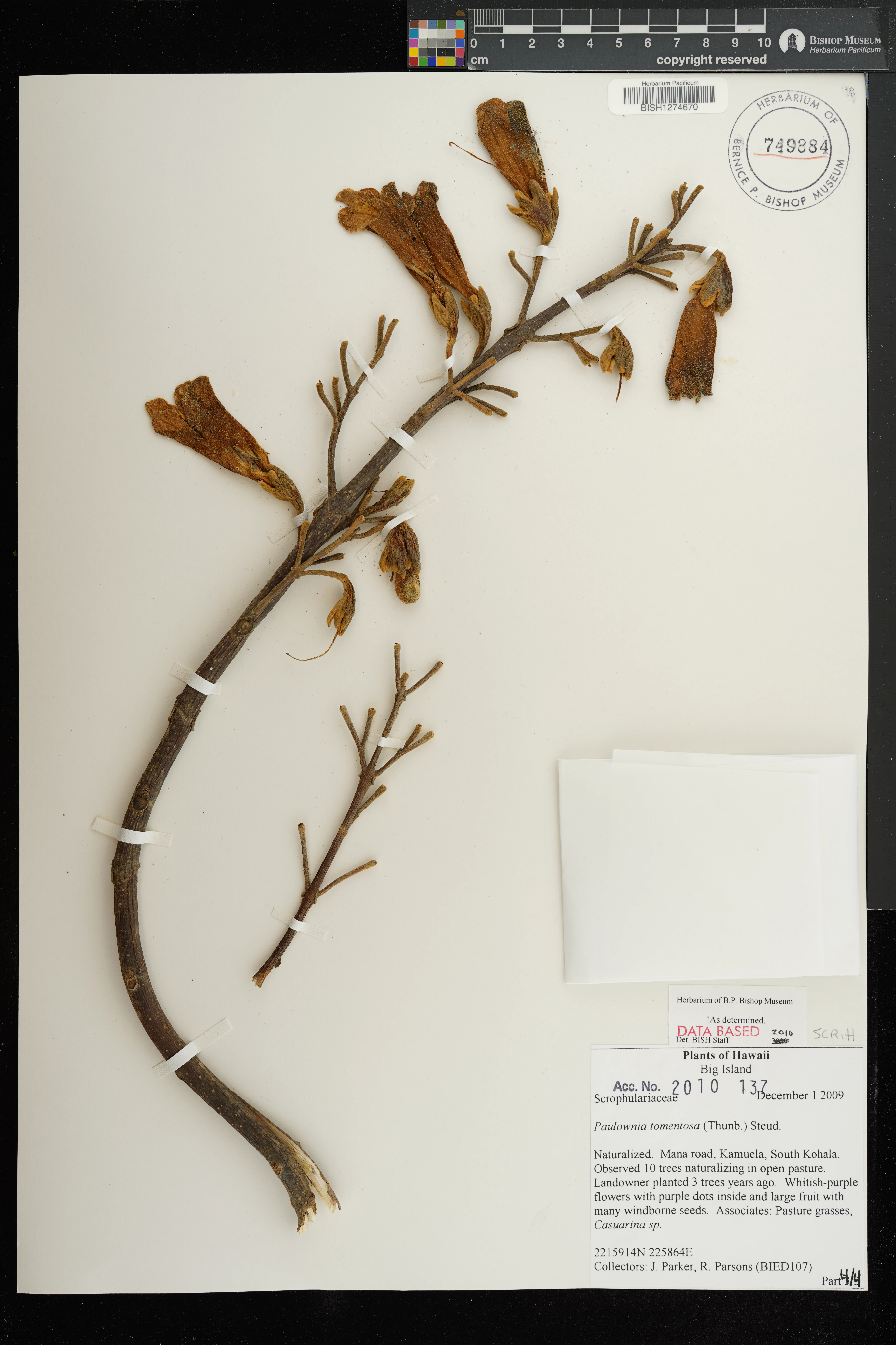 | 5 | Paulownia tomentosa | (Thunb.) Steud. | mana road, kamuela, s kohala | Naturalized. In open pasture. Landowner planted 3 trees years ago. Associates: Pasture grasses, Casuarina sp. | PRESERVED_SPECIMEN | parker, j. parsons, r. | collector number: bied 107 | Hawaii | BISH | 12/1/2009 |