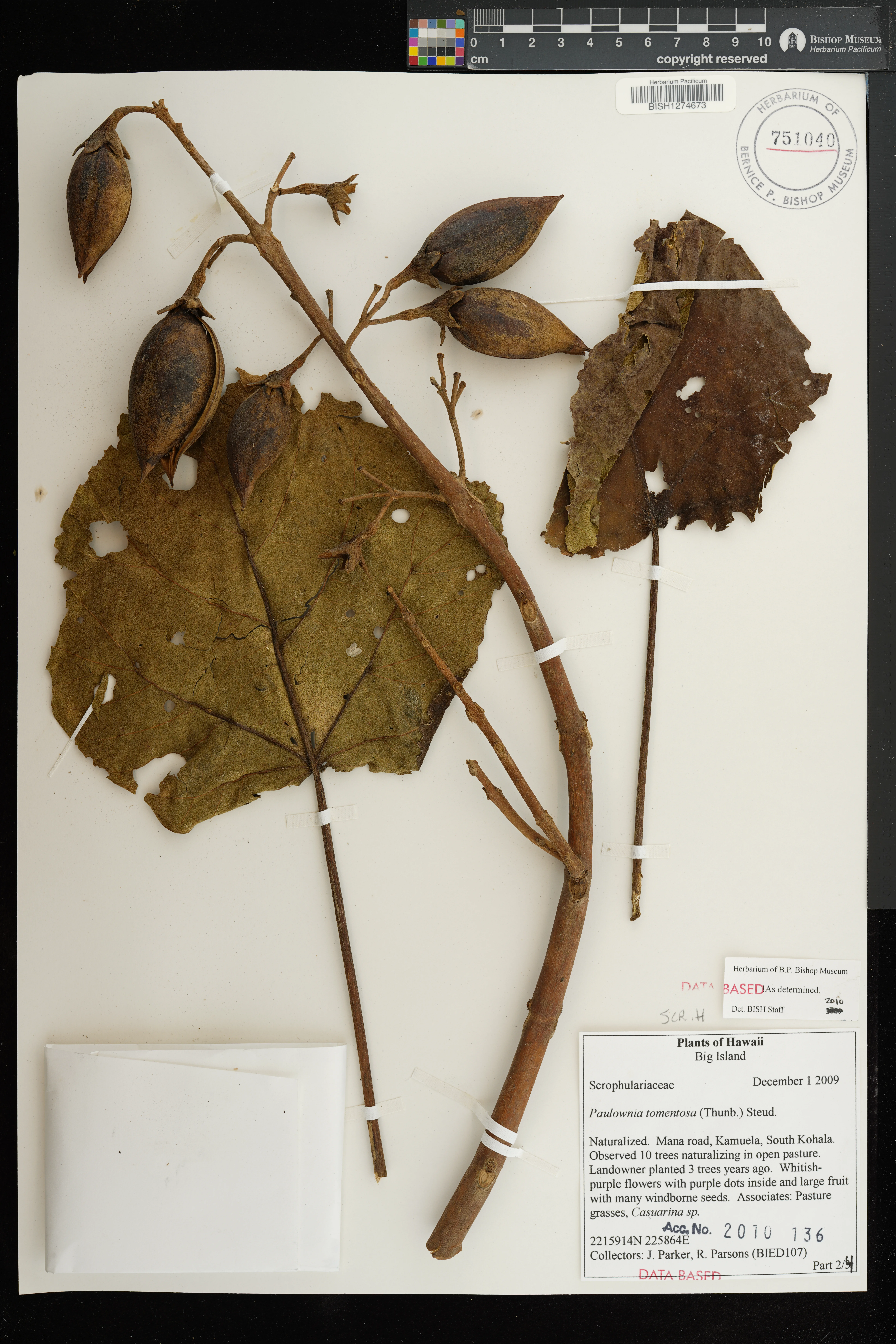 | 4 | Paulownia tomentosa | (Thunb.) Steud. | mana road, kamuela, s kohala | Observed 10 trees naturalizing in open pasture. Associates: Pasture grasses, Casuarina sp. | PRESERVED_SPECIMEN | parker, j. parsons, r. | collector number: bied 107 | Hawaii | BISH | 12/1/2009 |